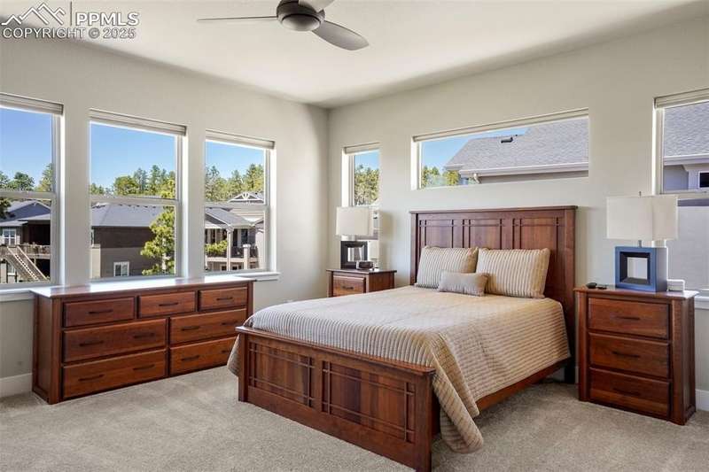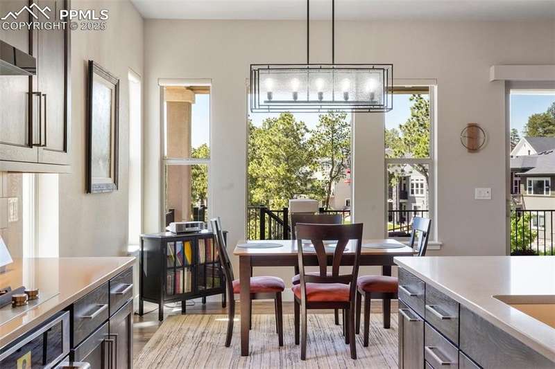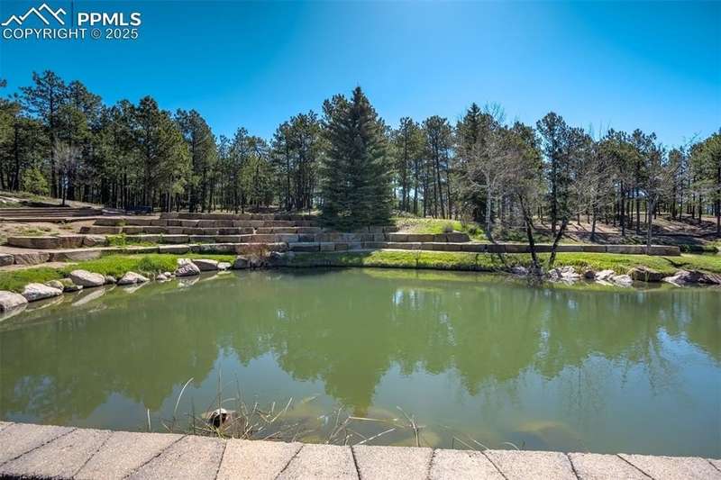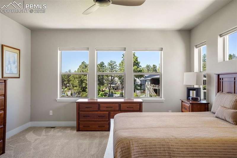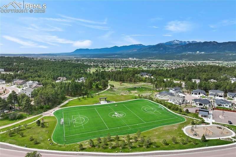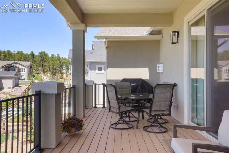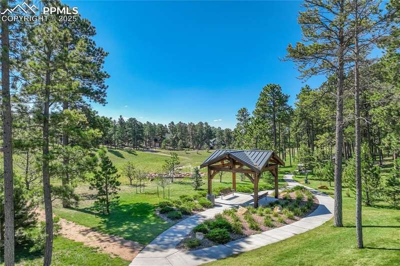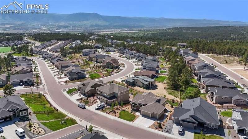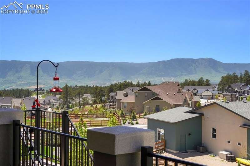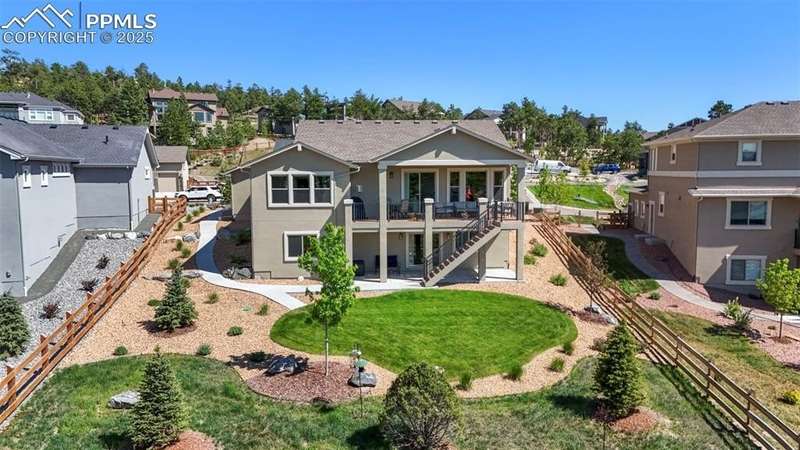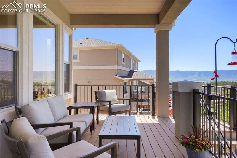 Where Panoramic Views + Premium Design Converge. Perfectly positioned on a premier lot w/breathtaking views of Pikes Peak and the Front Range, this residence delivers refined living in the highly sought-after Sanctuary Pointe—where luxury homes are nestled among towering pines + connected by miles of forested trails—this home embraces the best of CO living! Step inside to discover a bright, open-concept layout where natural light pours in through oversized windows, showcasing the home's timeless design + mountain surroundings. Soak in Colorado’s beauty from the covered composite deck + lower patio—your front-row seat to iconic Colorado sunsets. Whether enjoying your morning coffee or hosting at golden hour, the views are always unforgettable. The chef’s kitchen is both functional + fabulous w/42" Hickory cabinetry, soft-close drawers + pull-outs, quartz countertops, eye-catching tile backsplash, walk-in pantry, Stainless steel appliances including a gas cooktop, double ovens, convection microwave. The expansive island adds extra seating and hidden storage. In the great room, a floor-to-ceiling stacked stone fireplace anchors the space with warmth + sophistication. Retreat to the main-level primary suite with commanding mountain views, a luxurious ensuite bath w/dual showerheads + bench seating + a walk-in closet. Downstairs, the walk-out basement mirrors the quality of the main lvl—offering generous living space, a stylish wet bar + direct access to the backyard. Two bedrooms, full bath w/the flexibility to add an add bedroom complete the lower level. Additional features include a deep 3-car garage (25’ length) w/hot/cold water spigot, ideal for oversized vehicles/Colorado gear. Just minutes from Fox Run Park, shopping, dining, and top-rated District 38 schools, this home offers a rare blend of natural beauty, thoughtful design, and unbeatable convenience—with quick access to I-25 for seamless commuting to Colorado Springs or Denver.