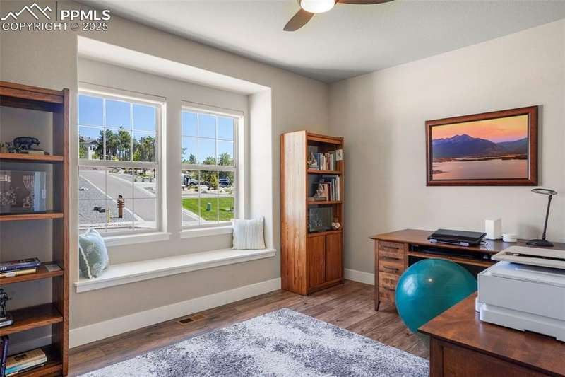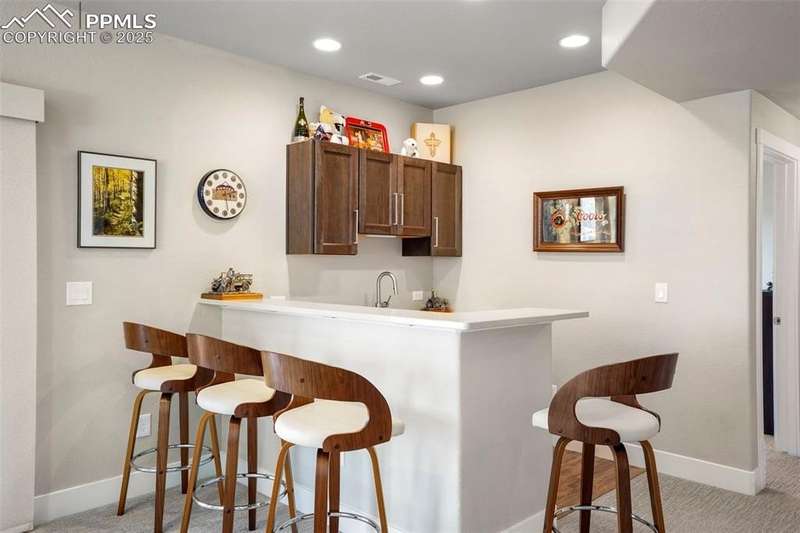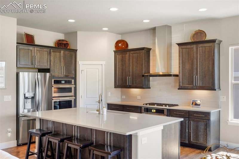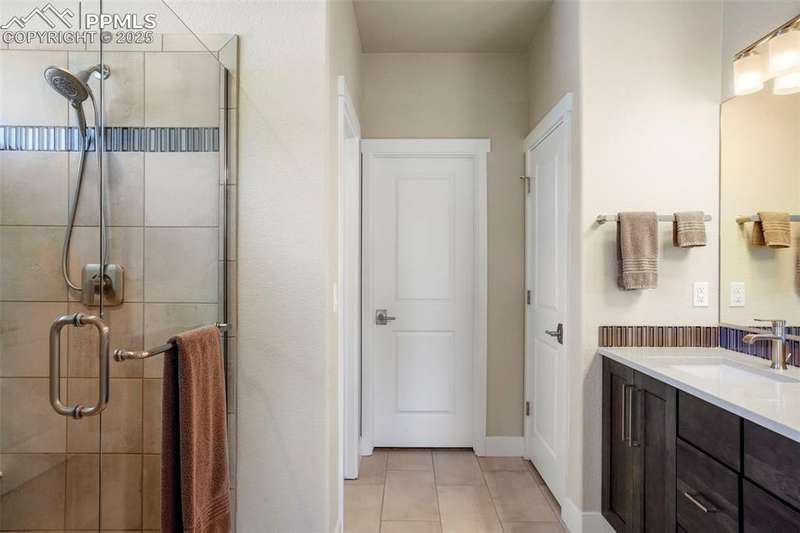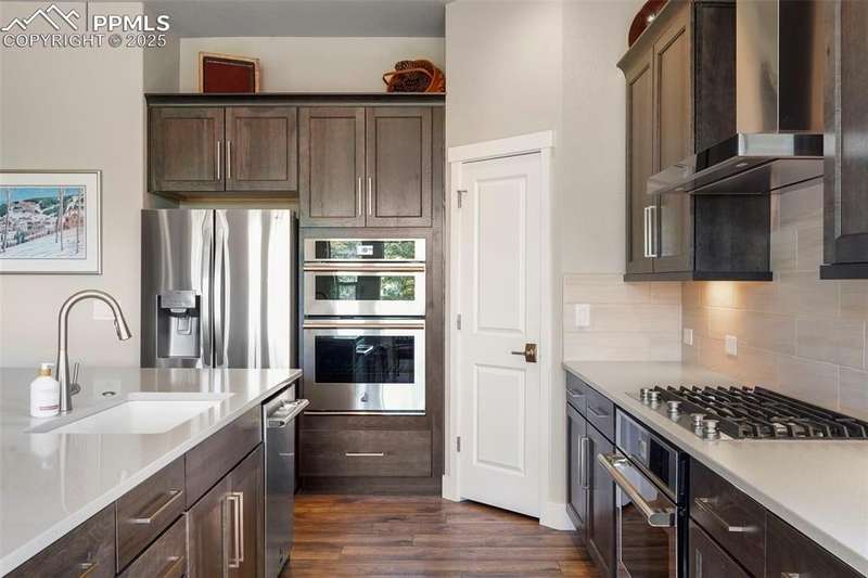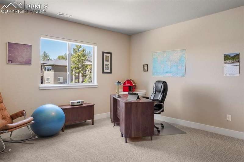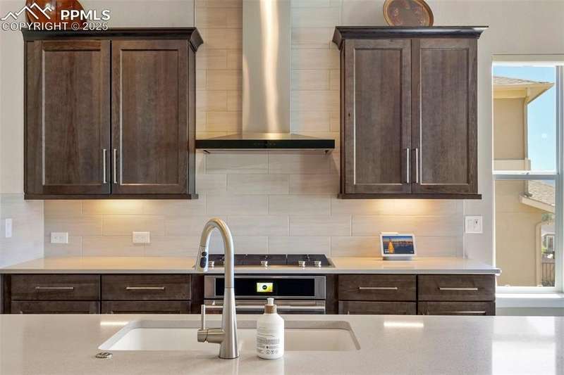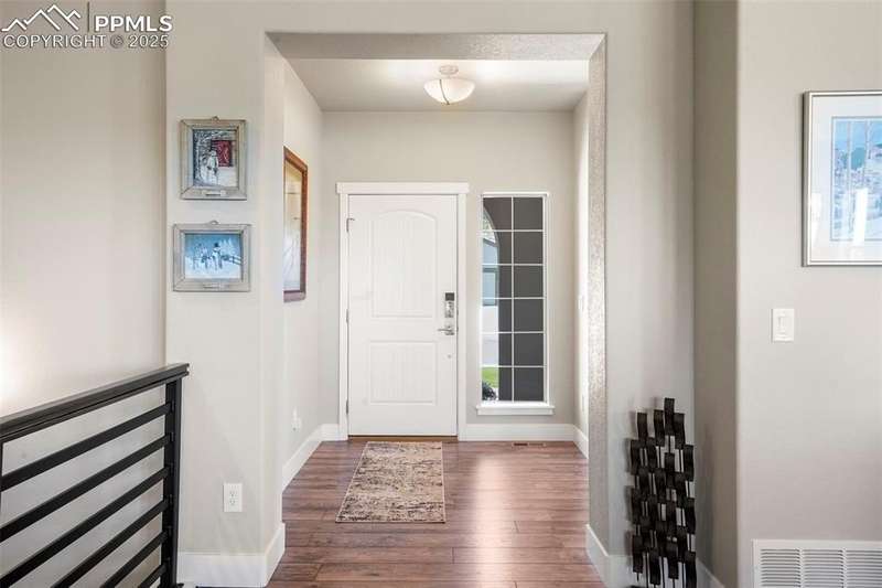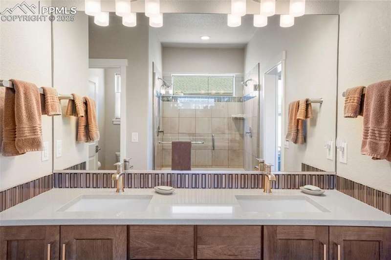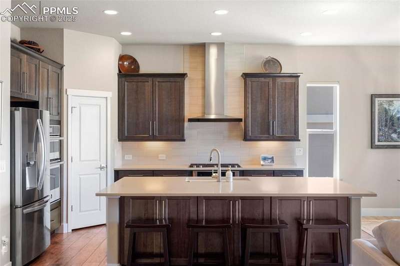 Where Panoramic Views + Premium Design Converge. Perfectly positioned on a premier lot w/breathtaking views of Pikes Peak and the Front Range, this residence delivers refined living in the highly sought-after Sanctuary Pointe—where luxury homes are nestled among towering pines + connected by miles of forested trails—this home embraces the best of CO living! Step inside to discover a bright, open-concept layout where natural light pours in through oversized windows, showcasing the home's timeless design + mountain surroundings. Soak in Colorado’s beauty from the covered composite deck + lower patio—your front-row seat to iconic Colorado sunsets. Whether enjoying your morning coffee or hosting at golden hour, the views are always unforgettable. The chef’s kitchen is both functional + fabulous w/42" Hickory cabinetry, soft-close drawers + pull-outs, quartz countertops, eye-catching tile backsplash, walk-in pantry, Stainless steel appliances including a gas cooktop, double ovens, convection microwave. The expansive island adds extra seating and hidden storage. In the great room, a floor-to-ceiling stacked stone fireplace anchors the space with warmth + sophistication. Retreat to the main-level primary suite with commanding mountain views, a luxurious ensuite bath w/dual showerheads + bench seating + a walk-in closet. Downstairs, the walk-out basement mirrors the quality of the main lvl—offering generous living space, a stylish wet bar + direct access to the backyard. Two bedrooms, full bath w/the flexibility to add an add bedroom complete the lower level. Additional features include a deep 3-car garage (25’ length) w/hot/cold water spigot, ideal for oversized vehicles/Colorado gear. Just minutes from Fox Run Park, shopping, dining, and top-rated District 38 schools, this home offers a rare blend of natural beauty, thoughtful design, and unbeatable convenience—with quick access to I-25 for seamless commuting to Colorado Springs or Denver.