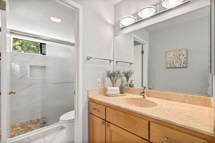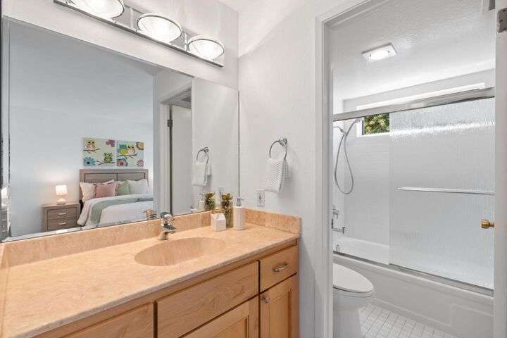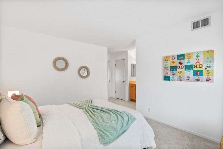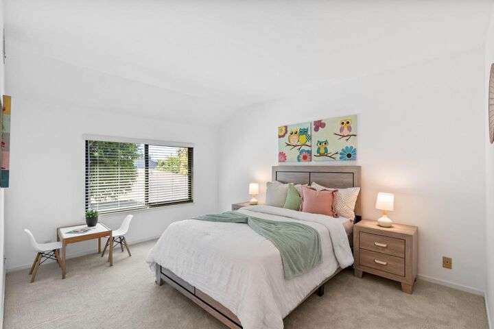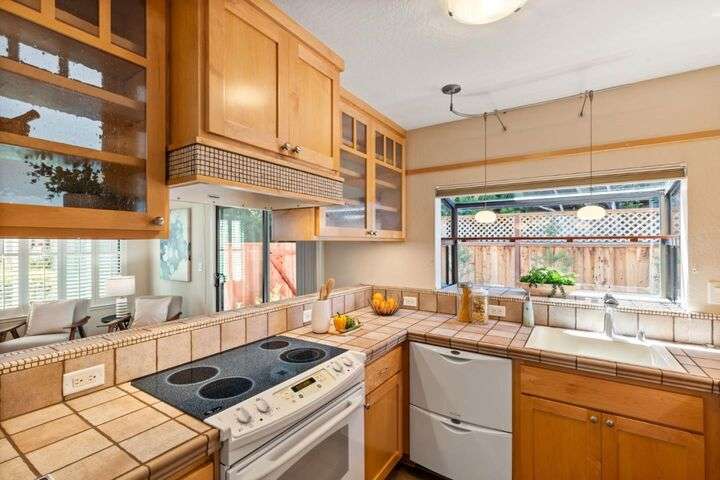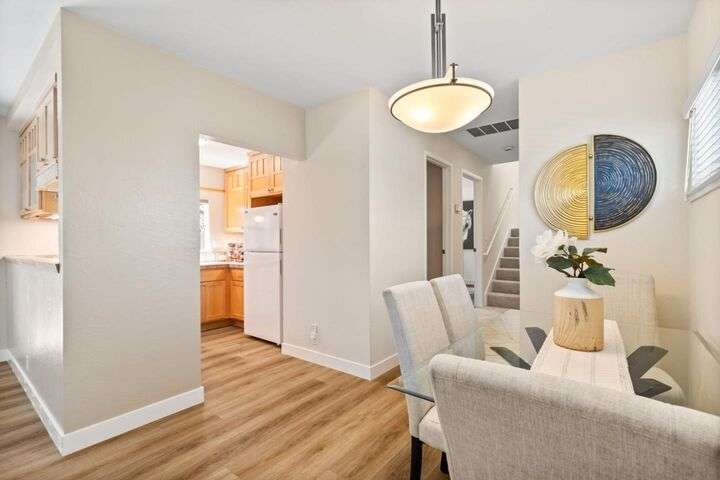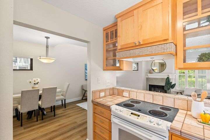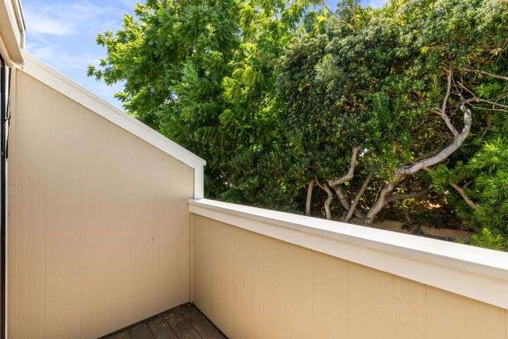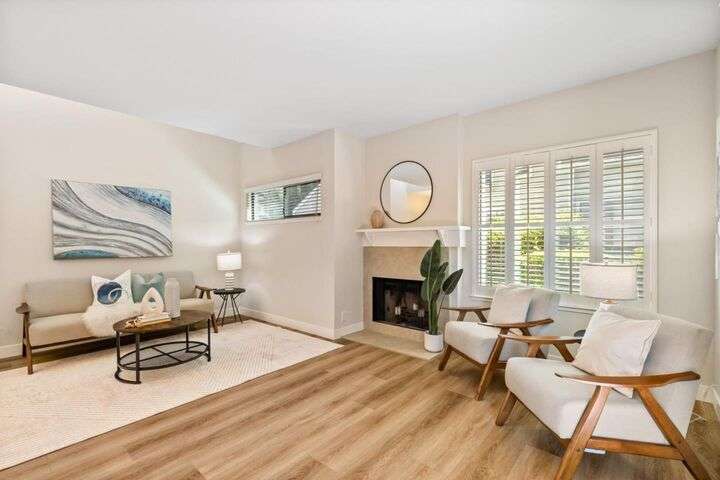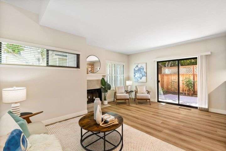 Price Improvement! Discover effortless living in this light-filled end-unit townhouse, featuring 3 bedrooms and 2.5 baths across two thoughtfully designed levels. The updated kitchen impresses with a garden window, sleek tile backsplash, Fisher Paykel dishdrawer, and durable laminate flooring that flows through the living and dining areas. Cozy up by the living-room fireplace, or step outside to your private backyard, enclosed by a newer fence. Upstairs, two ensuite bedrooms and a convenient laundry closet rest at the top of a carpeted stairwell; the primary suite delights with a vaulted ceiling, its own fireplace, and balcony overlooking the peaceful backyard. A semi-private balcony above the 1-car garage offers a perfect morning retreat. Nestled within a boutique 12-unit enclave, enjoy easy freeway access and a swift commute to Silicon Valleys tech hubs. Make this end-unit gem your own!