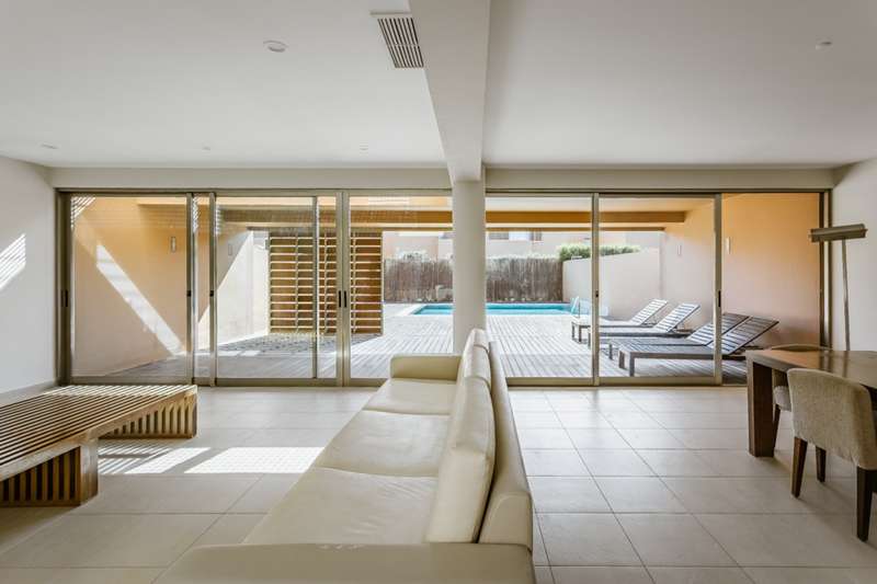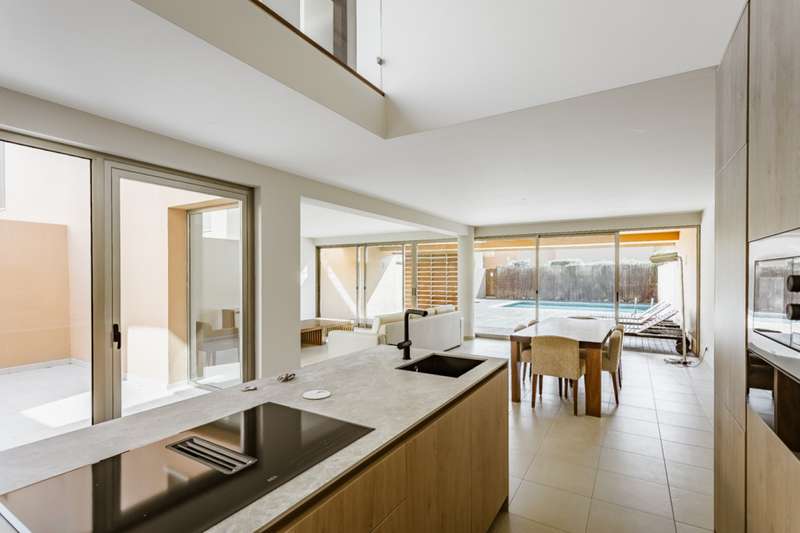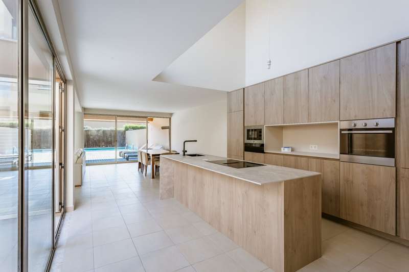 Elegant 4-bedroom villa, recently renovated, combining contemporary design, modern comfort and exemplary functionality, set in the unique natural landscape of Herdade dos Salgados. Just a few minutes ' walk from the iconic Salgados Beach, this property offers a sophisticated living experience in an exclusive and peaceful setting. With generous areas and a fluid architecture, the ground floor invites socializing and sharing, standing out for its natural light, high ceilings and intelligent distribution of spaces. The open-plan social area includes a large living room and a modern , fully-equipped American kitchen , extending harmoniously to the outdoor deck with a 150 m² private pool . On this floor there is also a versatile bedroom, ideal for guests. On the second floor, the atmosphere is dedicated to relaxation and privacy, offering three spacious bedrooms, all with access to private balconies and privileged views over the pool and surrounding gardens. The villa also has a large basement with a private garage and pre-installation for charging electric vehicles, ensuring convenience and preparation for a sustainable lifestyle. The excellent finishes and equipment include air conditioning in every room, solar panels and a photovoltaic system, high-quality materials and finishes, and reinforced security through a private condominium with access control. Located just a few meters from the renowned Salgados golf course and next to the natural surroundings of the Salgados Lagoon, this property offers a rare combination of tranquillity, nature and proximity to the center of Albufeira, just 15 minutes away. CHARACTERISTICS: Plot Area: 141 m2 | 1 518 sq ft Area: 446 m2 | 4 796 sq ft Useful area: 305 m2 | 3 279 sq ft Bedrooms: 4 Bathrooms: 4 Garage: 2 Energy efficiency: B- FEATURES: Recently refurbished Herdade dos Salgados Close to golf course Next to the beach 3 floors Private pool American kitchen Generous areas Basement Private condominium