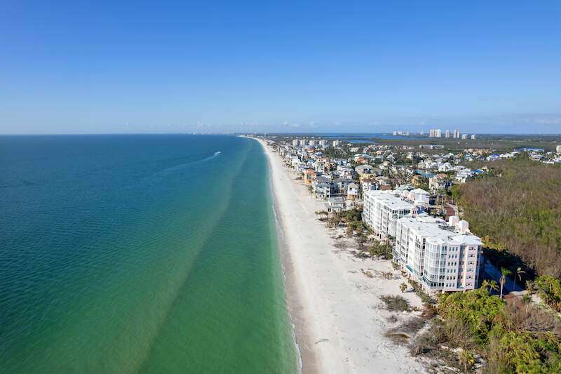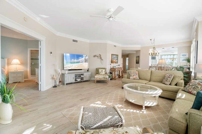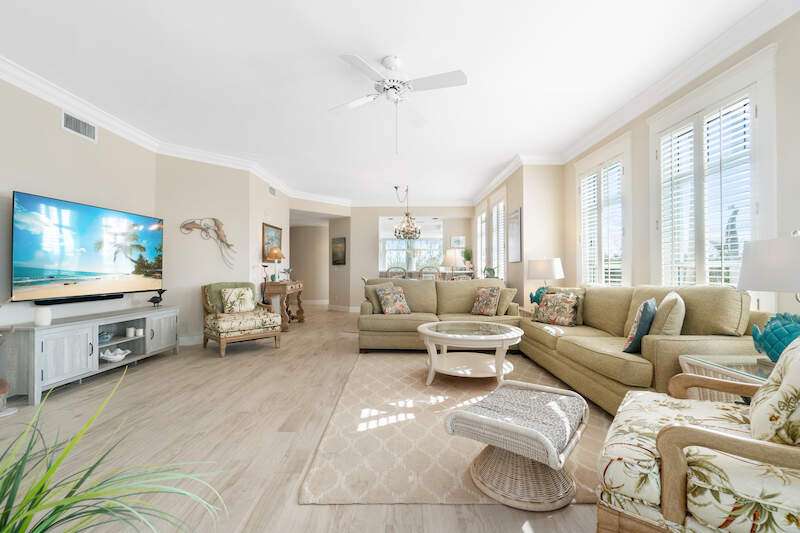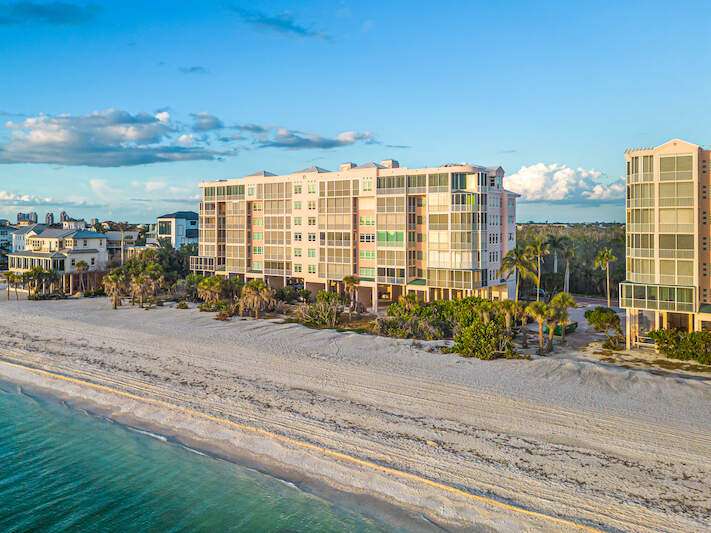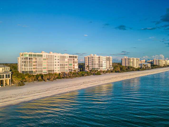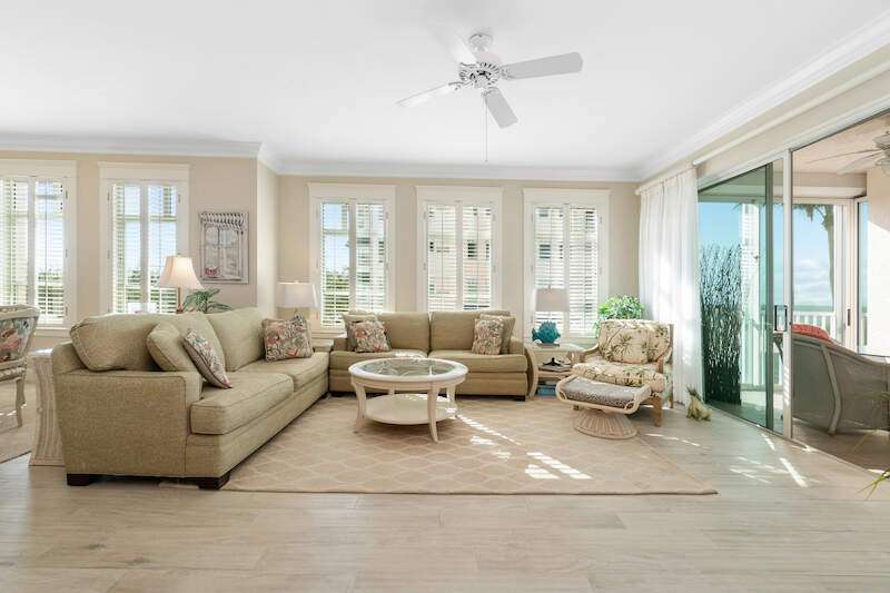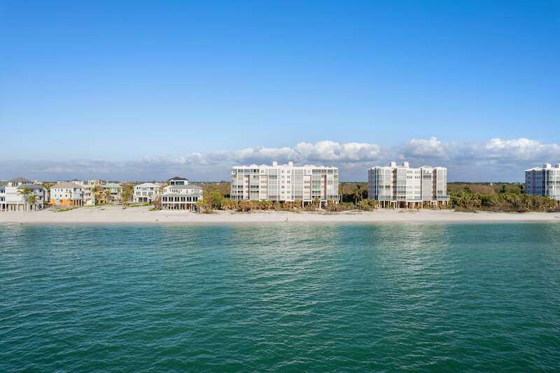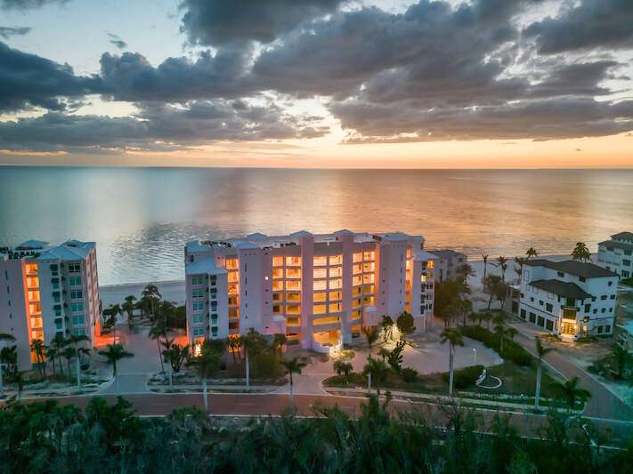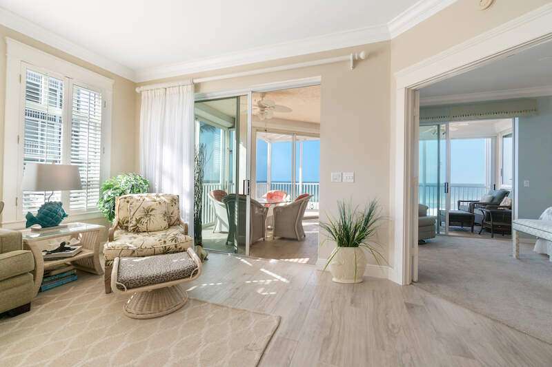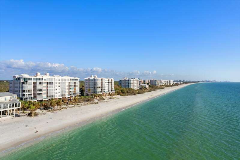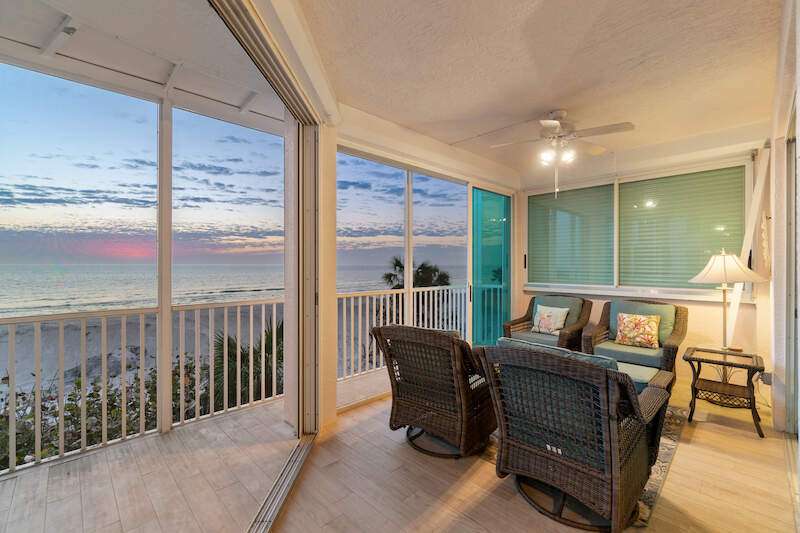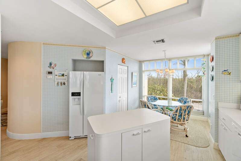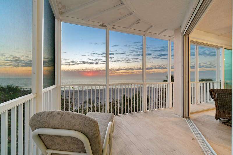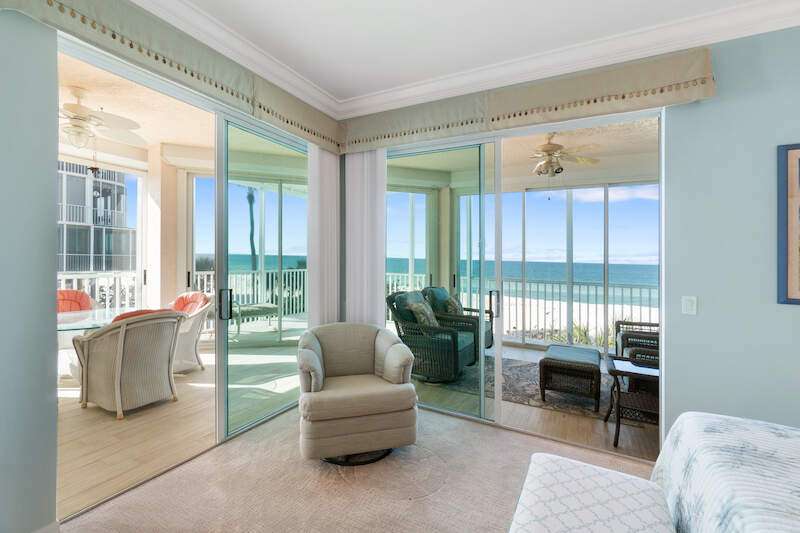 Stunning Direct Beachfront END-UNIT with unobstructed Gulf views in North Naples' Barefoot Beach Club. This coastal retreat offers sweeping Gulf vistas and breathtaking sunsets from your spacious lanai. Boasting over 2,000 sq ft under air, this unit offers 3 bedrooms, 3 bathrooms, electric hurricane shutters, a light & bright interior, and wood-look tile flooring. Enjoy extraordinary natural light courtesy of the extra windows available in a rare end-unit. The spacious kitchen features white cabinetry and countertops, an inviting eat-in area, and a convenient breakfast bar for casual dining. The well-designed split floor plan ensures privacy and comfort, with two guest bedrooms located at the front of the unit, while the primary suite is positioned on the Gulf side offering a peaceful retreat with breathtaking views. The primary suite features private lanai access, an expansive walk-in closet, and a spa-like bathroom with dual vanities, a large shower, and a separate soaking tub. Nearby to the NEW CLUBHOUSE with state-of-the-art fitness center & resort-style pool. Barefoot Beach residents enjoy 3 miles of beach, 2 pools/spas, manned/gated entry, & on-site mgmt. OPTIONAL "Club at Barefoot" offers tennis, 2 restaurants & beachside food/bev/chair service. Excellent Collier County location minutes to Mercato, Waterside & easy access to RSW Airport.
