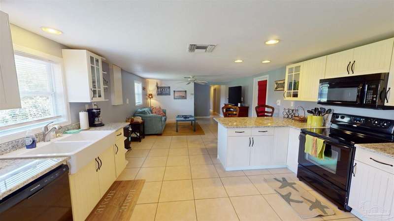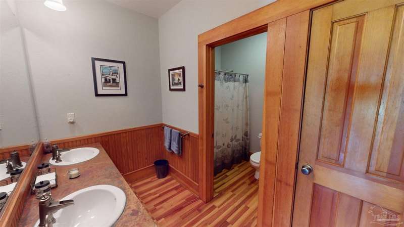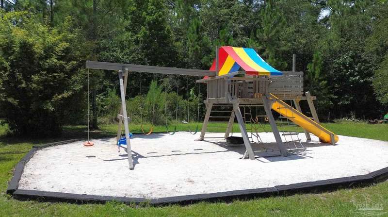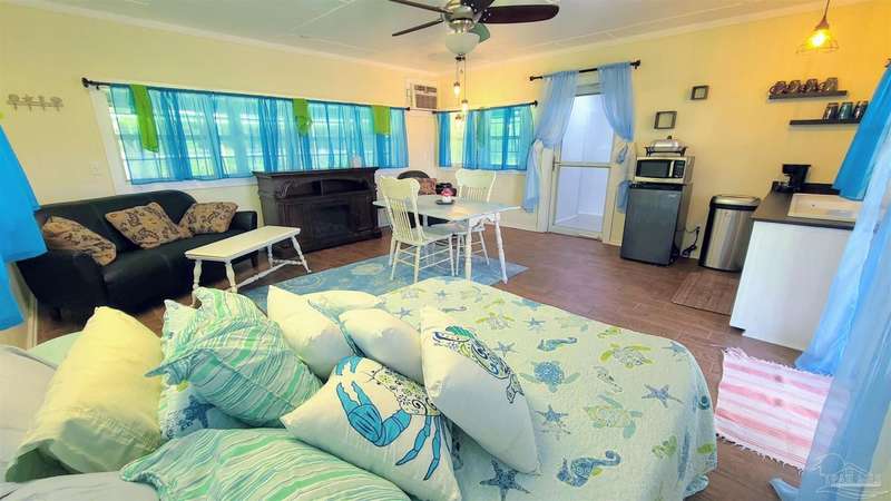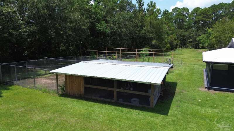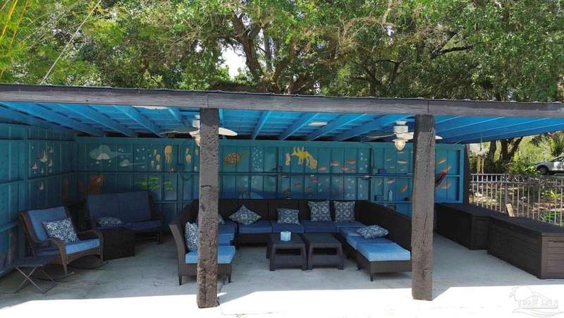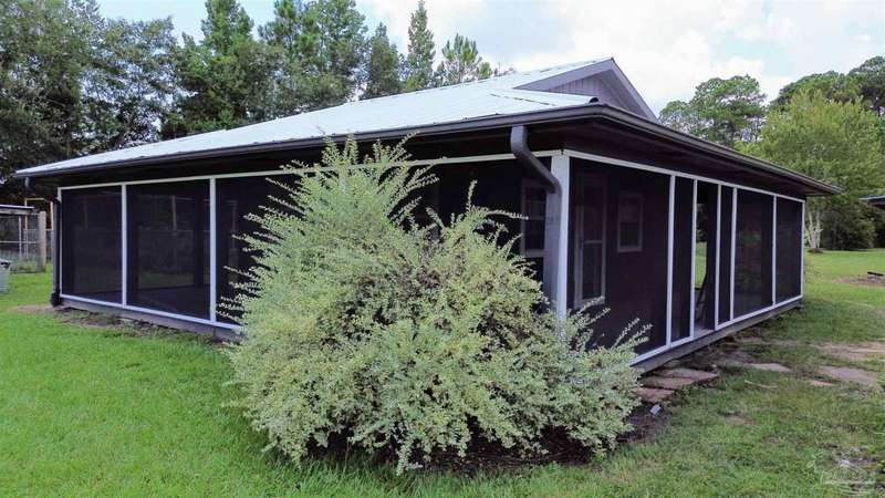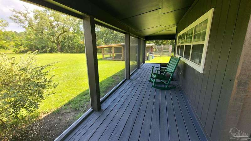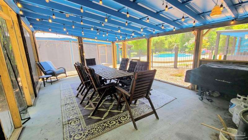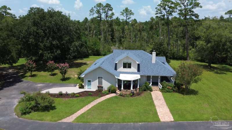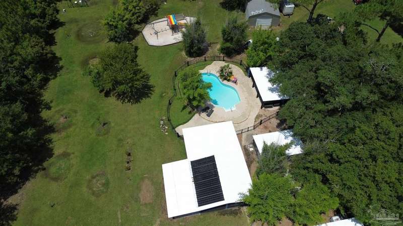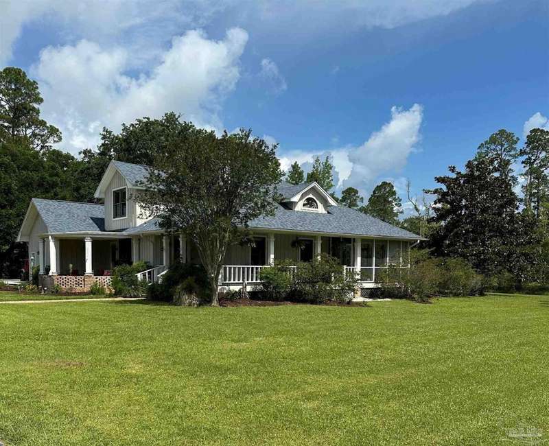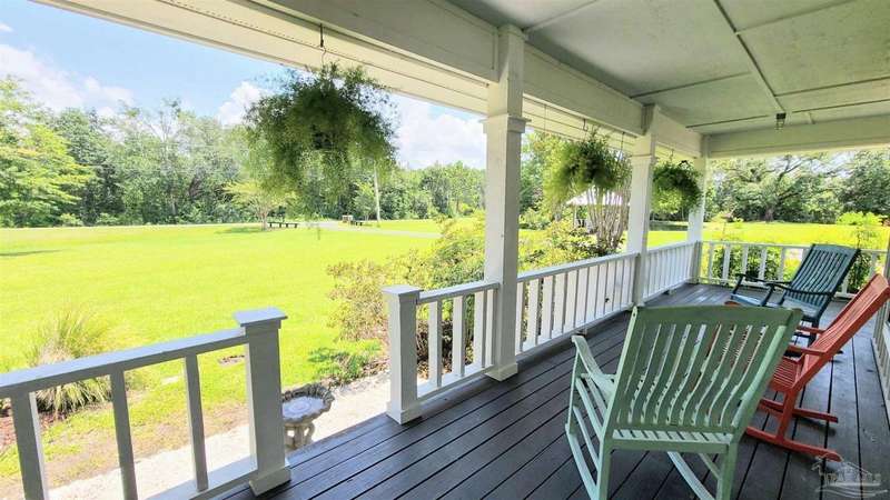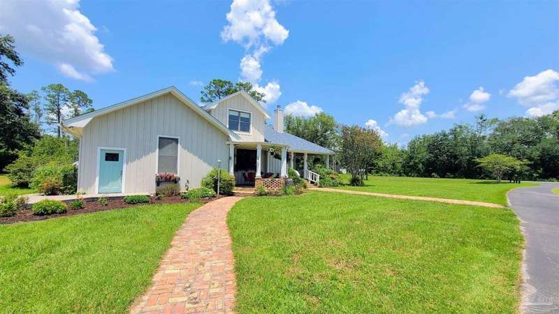 This Garcon Point-Milton expansive property could be an entertainer's dream, an event venue property for weddings or conferences, a multi-generational family compound, or income producing (Airbnb). The homes are a Tuscan-style main house, a guest house, and a studio cottage. Solar panels help reduce electricity costs! The main house has three bedrooms and baths with unique custom details like 'Henry' stained glass, cypress beamed ceilings, and a wood-burning stove. Its open layout connects living, dining, and kitchen areas to various porches, perfect for gatherings. A large loft offers versatile space. The guest house is fully furnished with two bedrooms, one bath, and a full kitchen, while the studio cottage provides a kitchenette, bath, and a screened porch with pond views. Both could be income producing! Outdoor amenities include an entertaining pavilion, a dining/cooking shack, a pool oasis with a cabana and fire pit, and a Rainbow swing set. Children love this property! Overlooking the self-watering pond are a gazebo and dock. The property also has a workshop, garden shed, raised garden beds, and a metal garage for extra storage or vehicles. It's conveniently located in quiet rural area just three miles south of I-10... including a local marina 5 minutes away to launch your boat!
