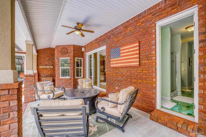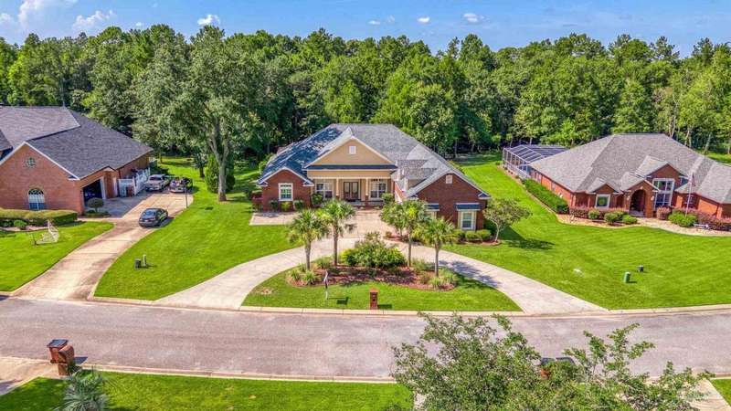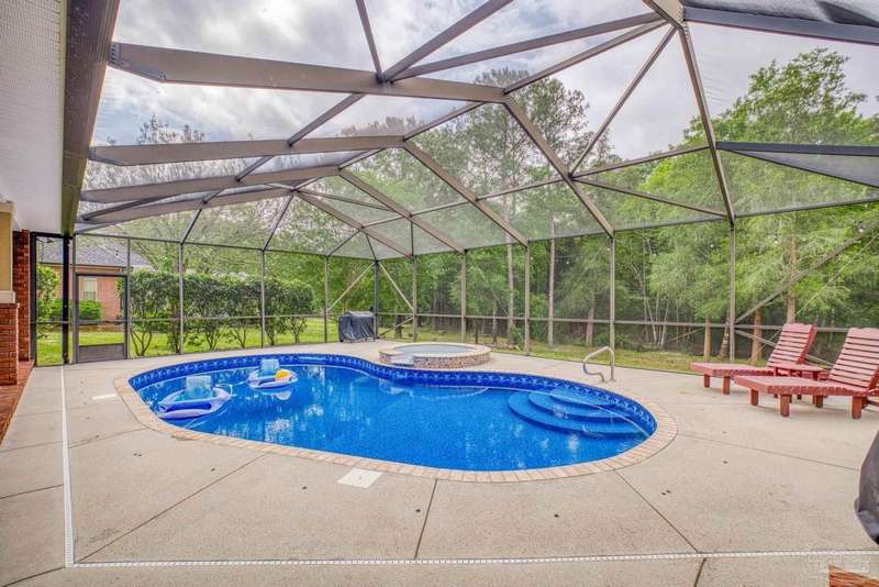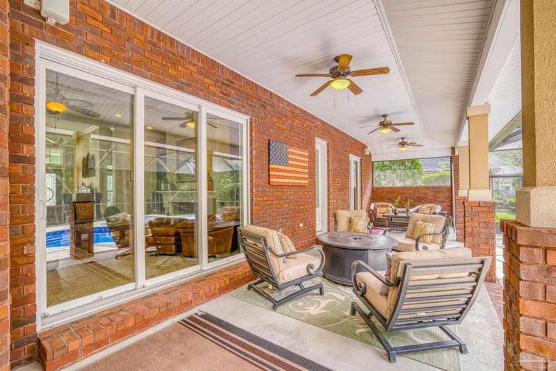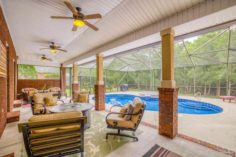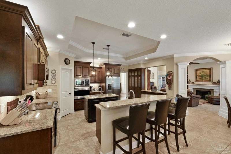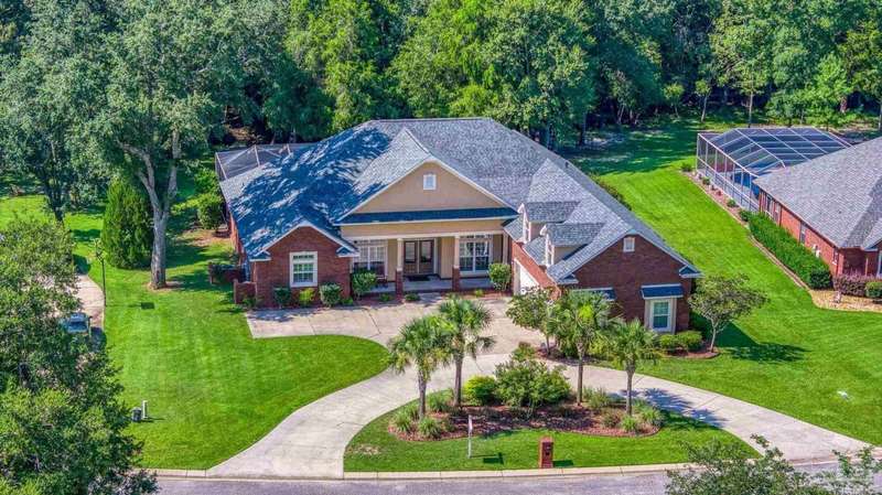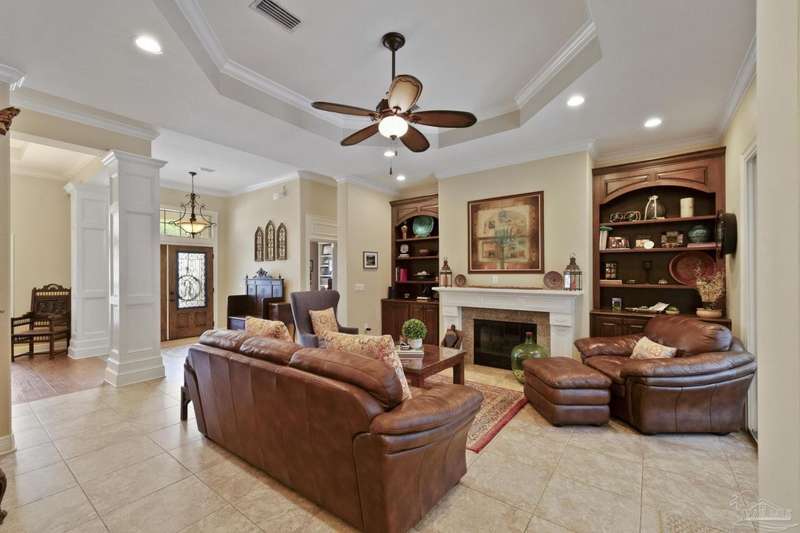 Brand new roof!! Step into elevated living in this custom-built pool home, ideally positioned on an oversized lot in one of the area's most distinguished golf course communities. A circular drive and charming front porch create a grand first impression, while inside, hardwood floors, custom tilework, and detailed millwork reflect thoughtful craftsmanship throughout. The kitchen is designed for both beauty and function, offering a large center island, double ovens, custom shelving, and generous bar seating-fantastic for casual dining or entertaining with ease. The main living area features a gas fireplace flanked by rich wood built-ins, creating a warm, sophisticated space. A separate study with its own built-ins provides the fantastic home office or quiet retreat. The luxurious primary suite offers a serene escape with tray ceilings, natural light, and a spa-style bath complete with a soaking tub, walk-in shower, and refined finishes. Outdoors, enjoy year-round relaxation with a screened-in pool and spa, a covered porch, and a newly updated pool bath accented by vibrant turquoise tile. With a brand new roof and recent 4-point inspection, this home is move-in ready and made for lasting enjoyment. Experience luxury, comfort, and community in one of the most desirable neighborhoods on the Gulf Coast.