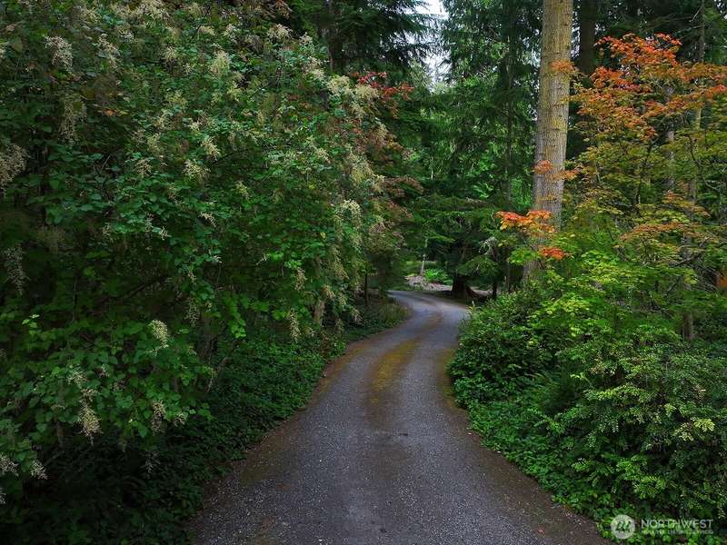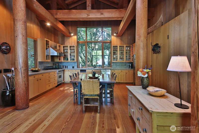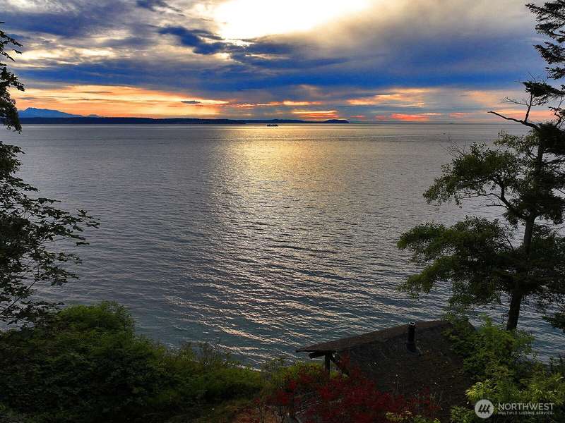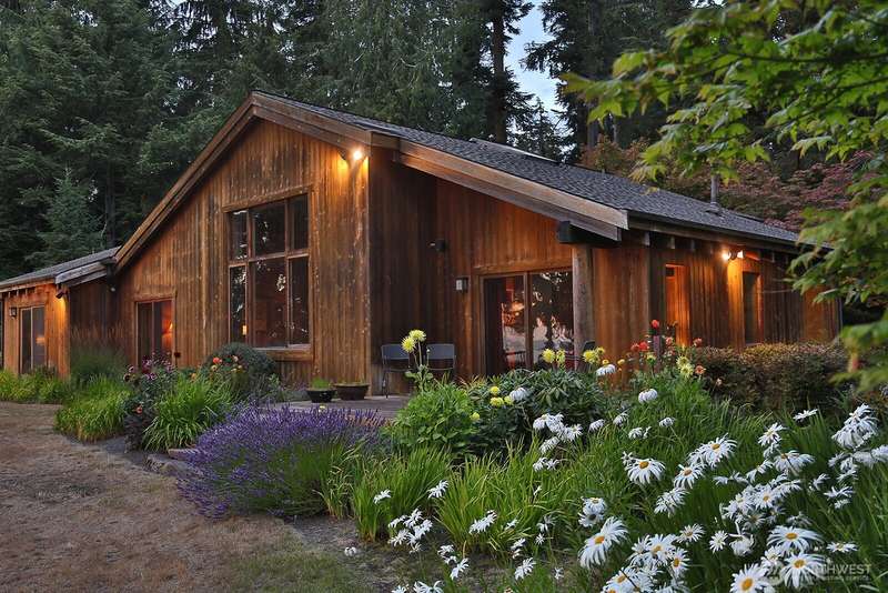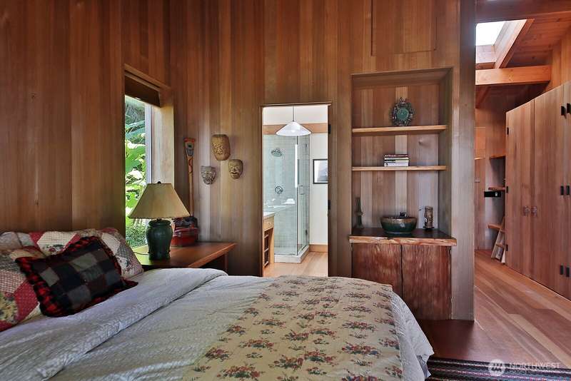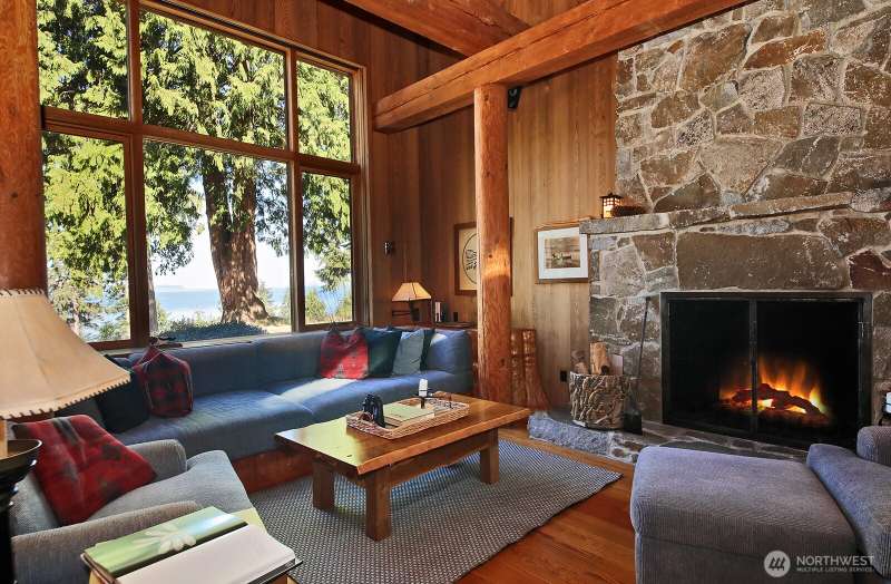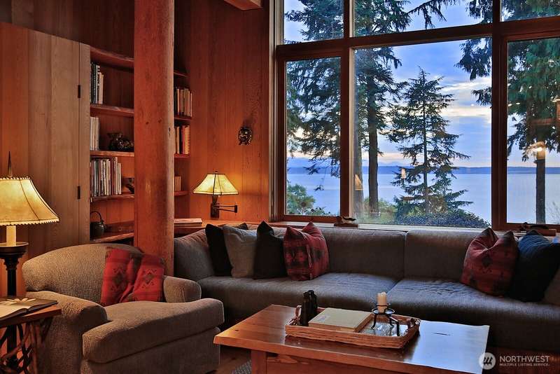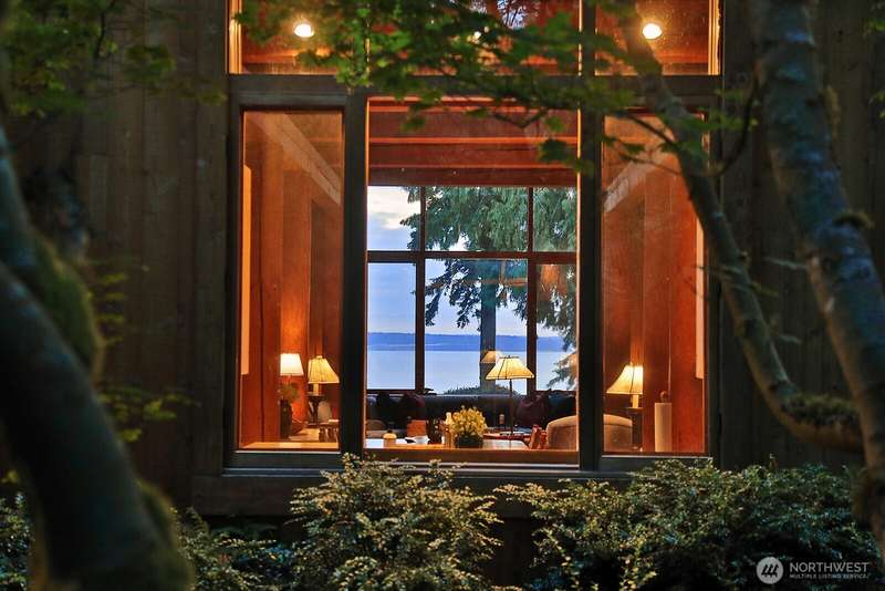 Perched on 5+/- acres with 250+/- ft of westside high-bank wft & sandy beach below, this generational estate is a masterpiece of custom design. 3-fully contained homes-main home, view art studio w/attached apt, & guest/gate house all built by master craftsmen from old-growth Western red cedar. Massive beams, live-edge details, disappearing wood blinds framing sweeping vistas & storybook built-ins grace every room. Oak, old growth fir & concrete floors flow thru-out interiors, while kitchens boast Viking & premium stainless appliances + understated tiled baths. Main home features a dramatic floor-to ceiling stone fireplace, while stone paths weave thru naturally designed landscape & gardens to a waterside gazebo with water, power & firepit.