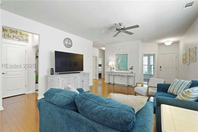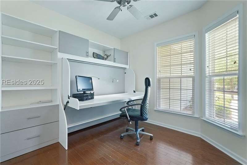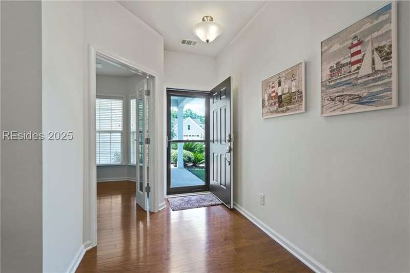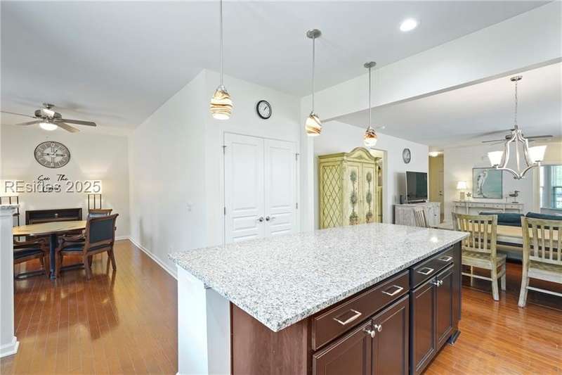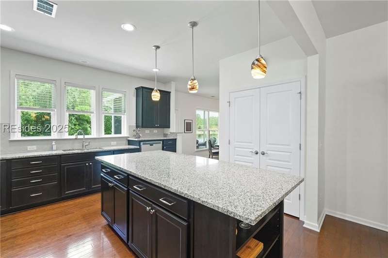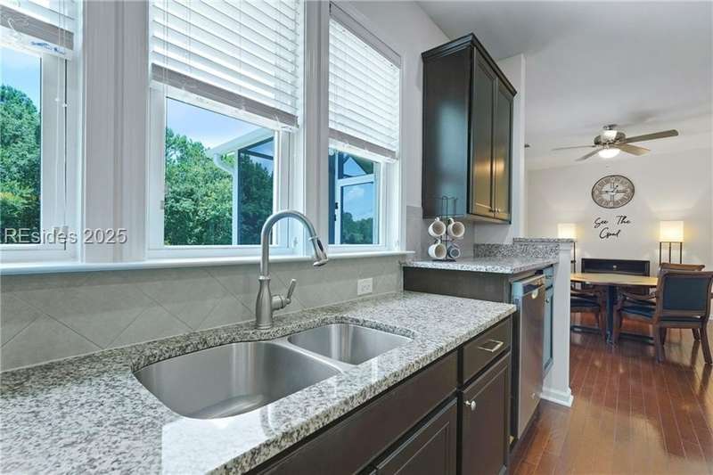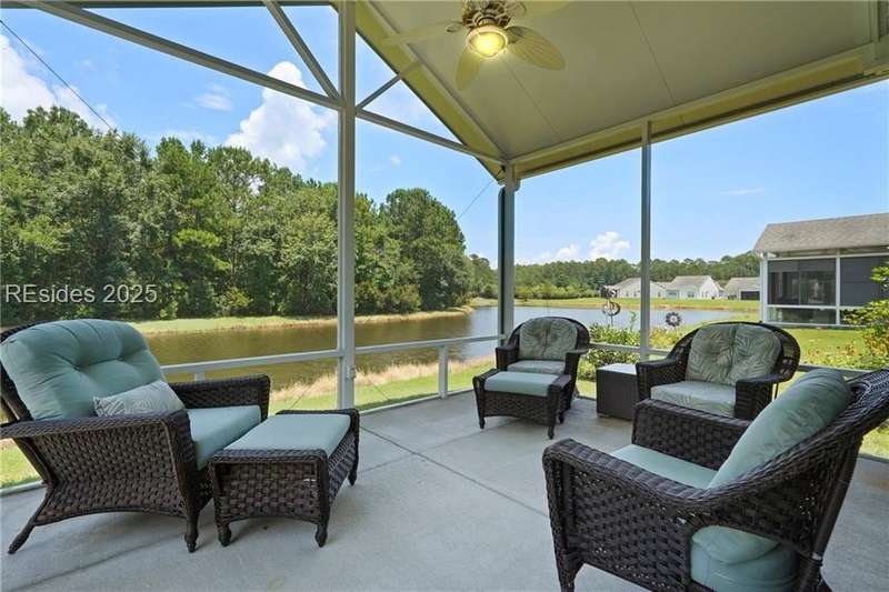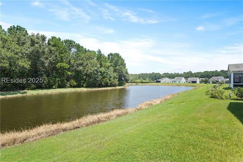 Enjoy the serene water to woods view from this meticulously maintained 2BD/2BA/Den Taft Street model that is conveniently located near the Tidewatch entrance into Sun City. The gourmet kitchen includes granite countertops, large kitchen island, roll out shelving, raised dishwasher, ss appliances & tile backsplash. Other upgrades include wood flooring throughout, den w/French doors & built in desk that converts into a Murphy bed, Carolina room, custom screen lanai & covered front porch. Enjoy the active lifestyle of Sun City and amenities including 6 pools, fitness centers, tennis & pickleball courts, golf & much more!