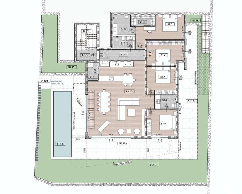 * Apartment S1 - Net usable area: 275 m2 (4 bedrooms + 3 bathrooms + 3 terraces + 260 m2 garden + pool + garage parking + outdoor parking space)