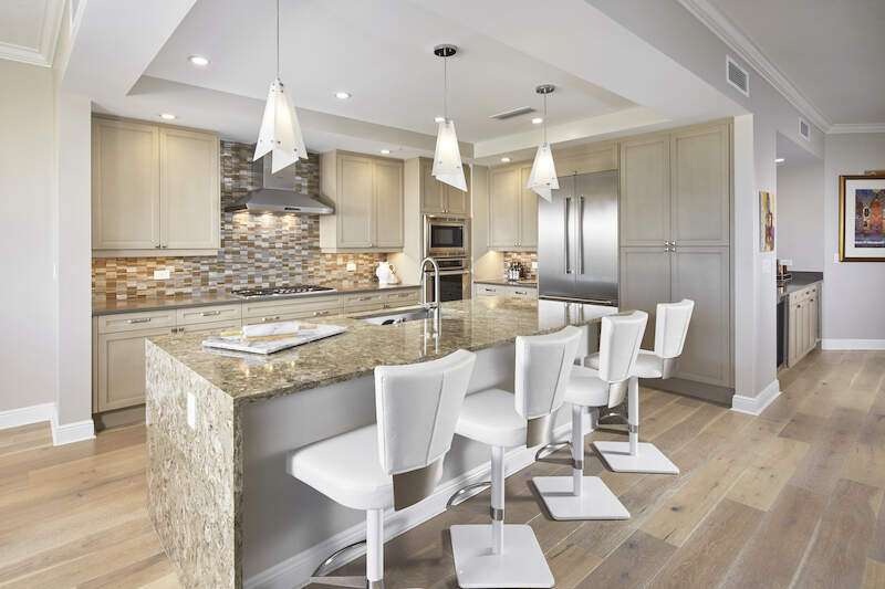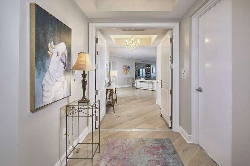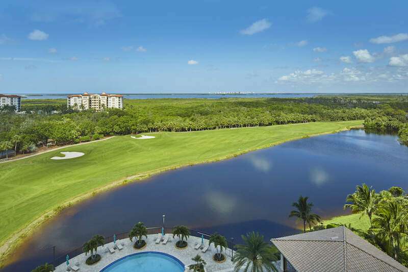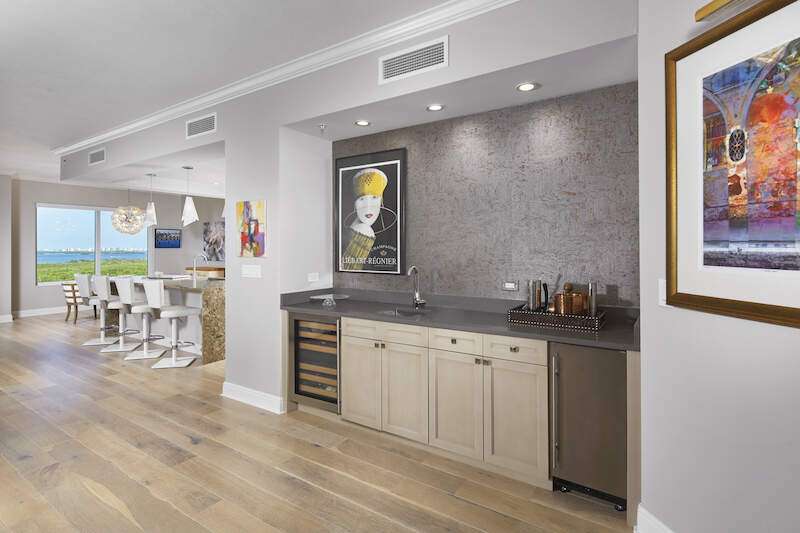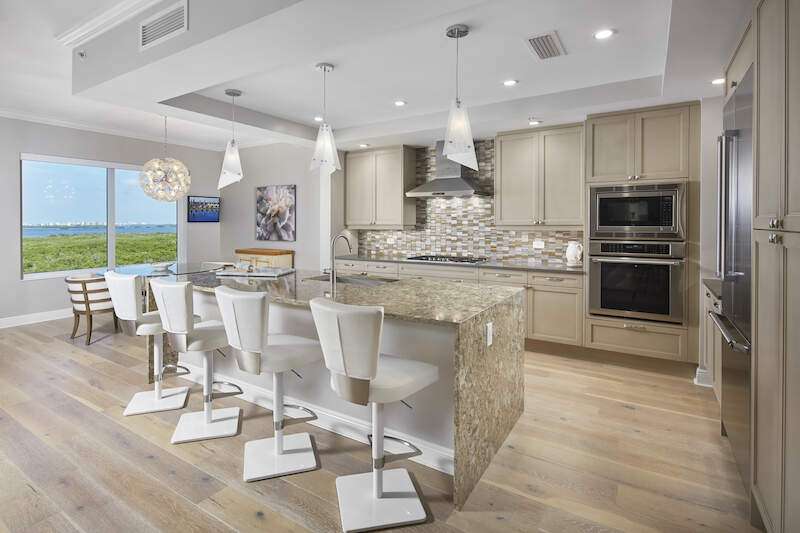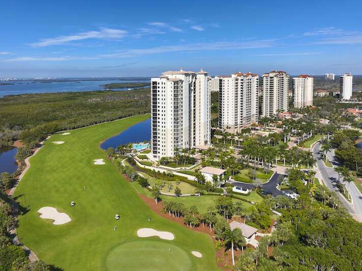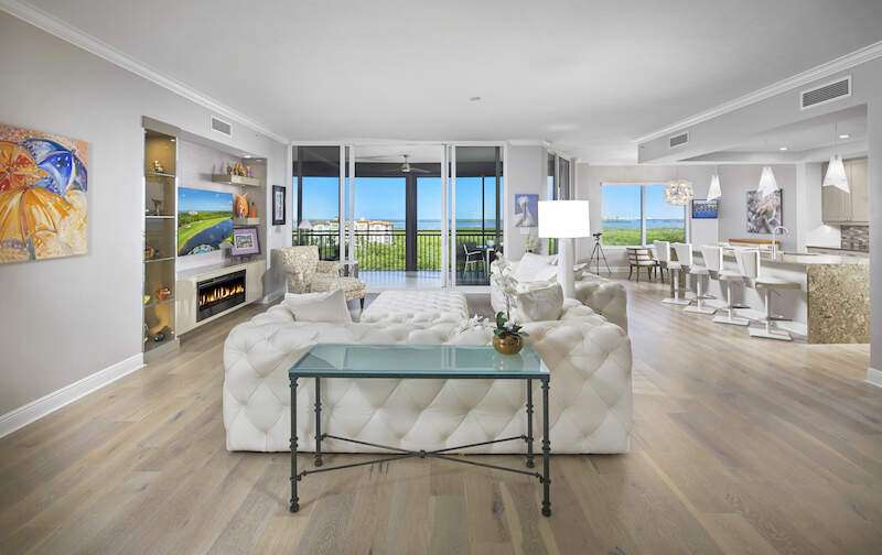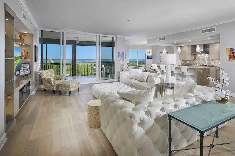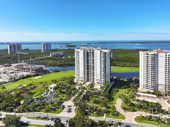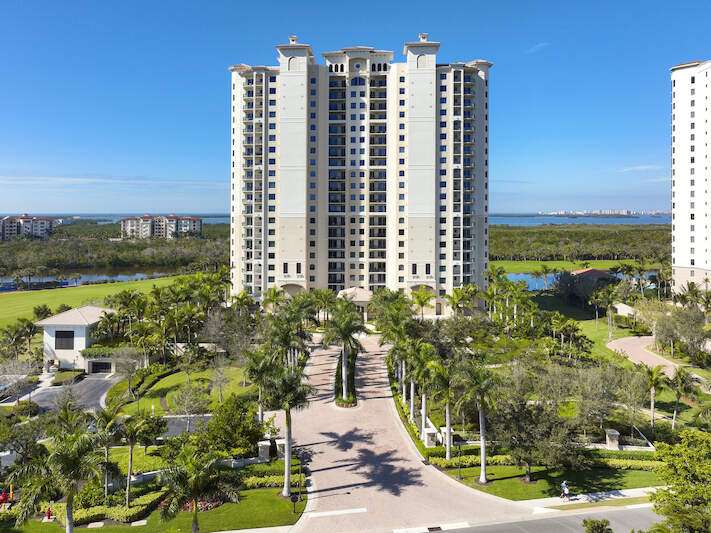 Enjoy beautiful Altaira, The Colony at Pelican Landing's newest high rise tower. Huge views overlooking both the Estero Bay and The Gulf of Mexico. Elevator opens to private foyer. Over 3300 sq. ft. three bedrooms, den and 3.5 baths plus another 400 SF on 2 terraces facing east and west. The spacious great room has amazing un-obstructed views, floor to ceiling windows/sliders. Gorgeous coastal palette with quartz kitchen counters, glass tile back splash and stainless Thermador appliances, including gas cooktop. Gorgeous wide plank wood floor in main areas. Custom wine cooler beverage station, ceiling fans and built-in bespoke entertainment center. Automatic storm shutters and 2 spaces in the enclosed garage. Altaira amenities include: 24-hour concierge service, lavish infinity edge pool, pavilion and cabanas, 3 guest suites, impressive fitness facility, 3,000 sq. ft. social room, designated dog walk area, fire pit and roof top observatory. A wide array of Colony at Pelican Landing amenities include private waterfront dining at The Bay Club, a 34-acre island beach park with boat shuttle and canoe/kayak parks, pickle ball, a huge tennis program, sailing, bocce and many social activities to boot! Elective golf memberships. Located within minutes of shopping, restaurants, sports arenas, performing art centers, world-renowned beaches, and SWFL international airport.