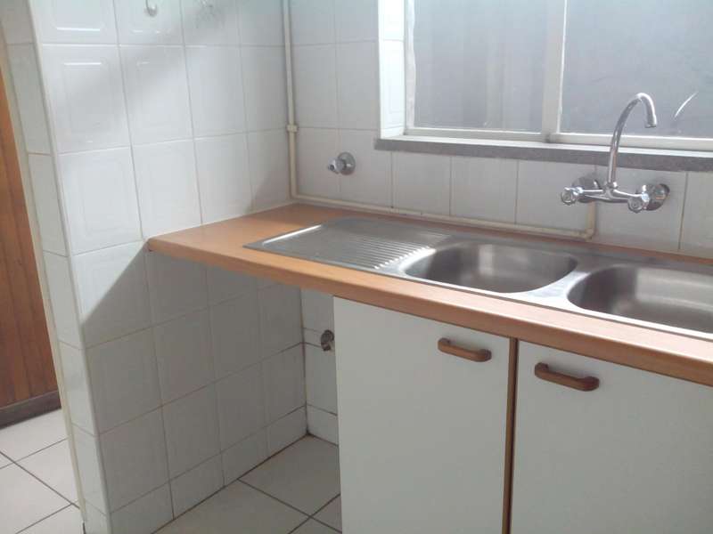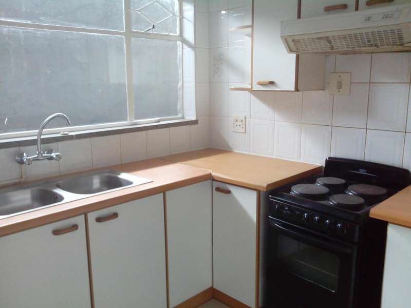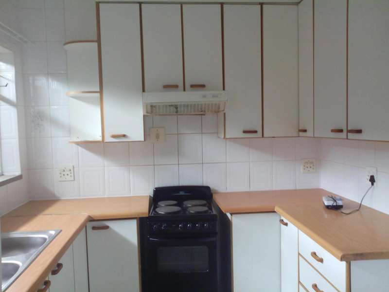 * Modern kitchen with melamine cupboards, double sink, electric oven and sufficient space for appliances.