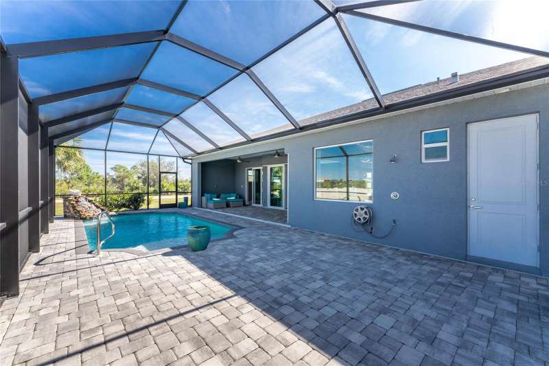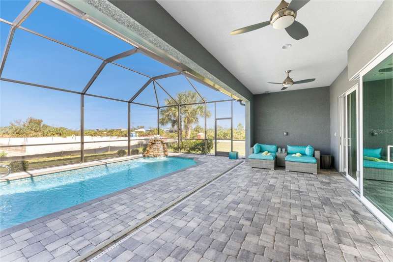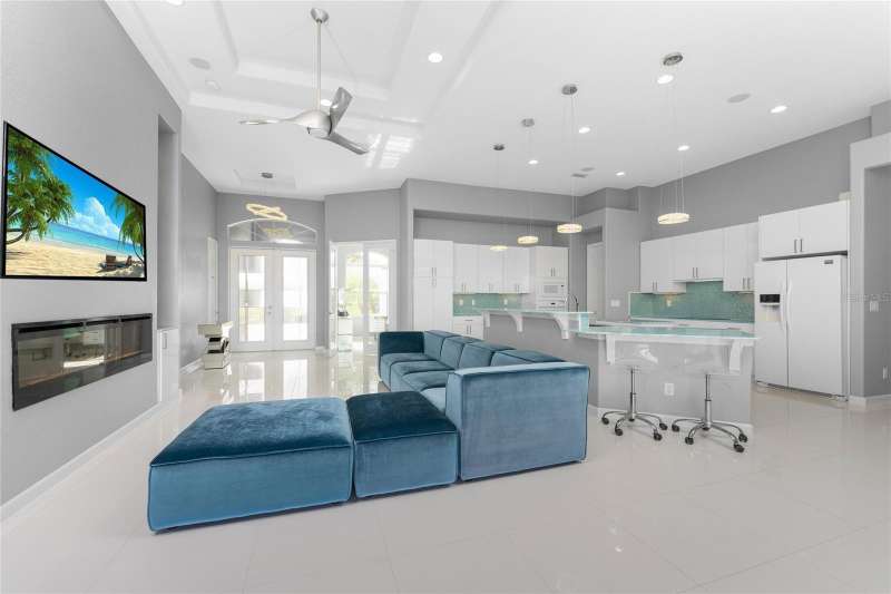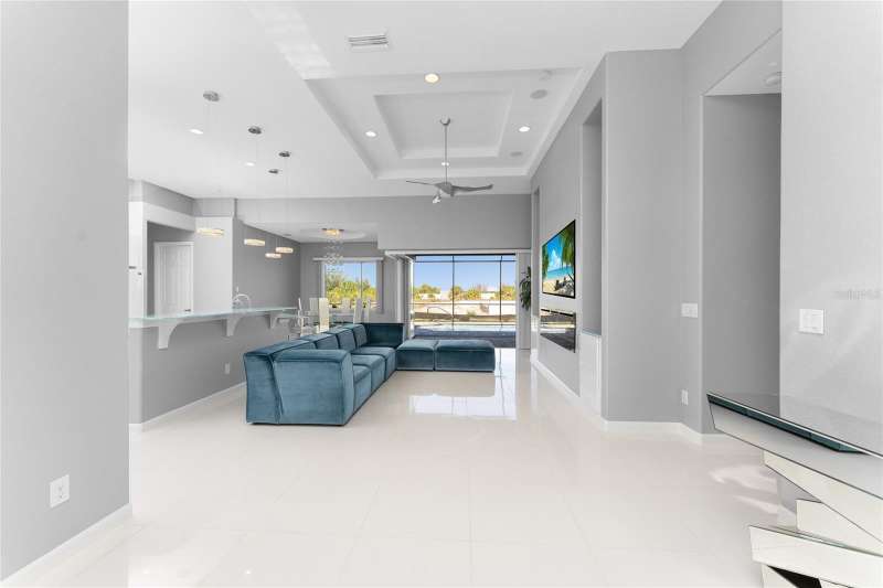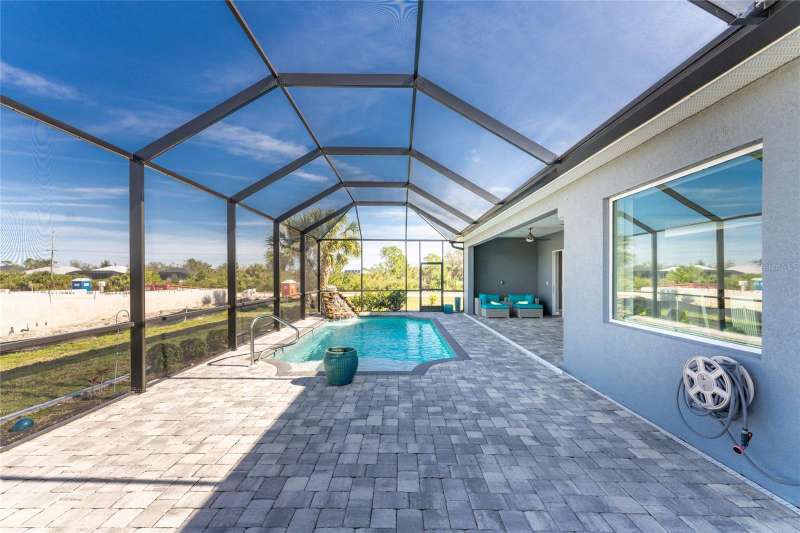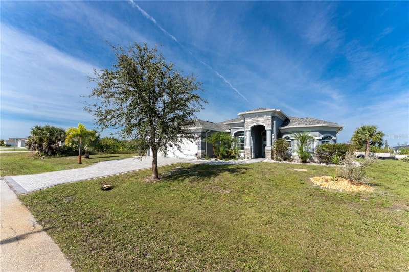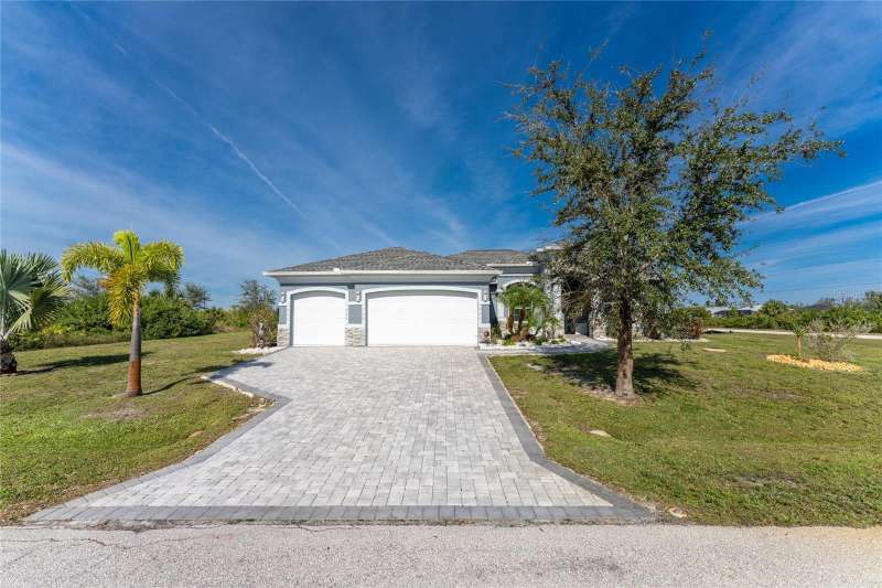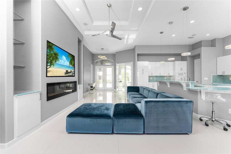Welcome to this meticulously maintained 3-bedroom, 2-bathroom home plus den that offers an impressive 2,115 sq. ft. of living space. Set on a large double lot, this home has been thoughtfully designed, blending modern amenities with luxurious finishes. Boasting a new HVAC V/S motor and deluxe UV light installed in February 2022, along with fresh interior and exterior paint, this home is move-in ready and perfect for anyone looking for a stylish, worry-free lifestyle. The culinary kitchen, is a true chef’s paradise! This gourmet kitchen is outfitted with stunning aqua onyx countertops, a beautiful glass tile backsplash, and an expansive double island—perfect for entertaining or casual family meals. The sleek glass cooktop and abundance of soft-close cabinets and drawers provide both style and function, making cooking a true joy. This open and airy floor plan is enhanced by soaring high ceilings and elegant touches, including double tray ceilings in the living area, a circular tray ceiling in the dining room, and tray ceilings in the foyer. The open concept seamlessly connects the living room, dining area, and kitchen, with pocket sliding doors leading to the gorgeous pool area, perfect for enjoying Florida’s indoor-outdoor lifestyle. Entertaining made easy with The great room that features a striking built-in electric fireplace, framed by custom-built shelving. A state-of-the-art 8-speaker stereo system runs throughout the great room, kitchen, primary bedroom, and lanai, making it ideal for hosting gatherings or simply enjoying music throughout your home. Step outside to your private oasis featuring a luxurious heated saltwater pool with a sun shelf and a tranquil waterfall feature. This space is perfect for both relaxation and entertaining guests in the gorgeous Florida weather. The spacious primary bedroom features ample walk-in closets to accommodate all your storage needs, while the high-end finishes provide a sense of retreat and relaxation. The primary bathroom is a spa-like retreat, with an oversized walk-through shower featuring dual shower heads for an ultimate luxury experience. This home offers a split floor plan with 2 bedrooms and a guest bathroom that offers a beautifully tiled walk-in shower with direct access to the pool area—perfect for rinsing off after a swim. The large laundry room offers Topaz Gem countertops, extensive cabinetry, and a convenient laundry tub. The home is equipped with hurricane windows throughout and a lanai panel for added protection during storm season. New roof installed in 2023, 2x2 porcelain tile throughout, and a Rain Soft water treatment system, installed in October 2019, ensures high-quality water for everyday use. The exterior of the home is just as stunning as the interior, featuring a beautifully paved driveway that leads up to the insulated 3-car garage with epoxy-coated flooring. Lush landscaping, mature plants, irrigation system and white Caribbean beach pebbles add to the home’s appeal. Fenced in pet area with 2 gates provide a safe haven for your pets. This home is truly a showstopper, offering a blend of luxurious features, thoughtful upgrades, and a prime location in South Gulf Cove. Whether you’re looking for a peaceful retreat or an entertainer’s dream home, this property has everything you need and more.