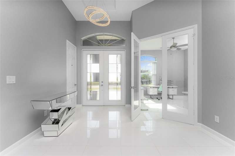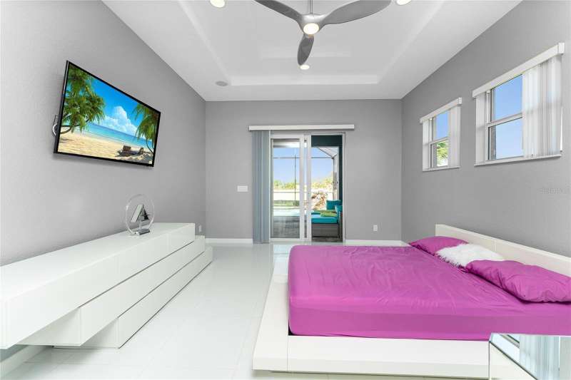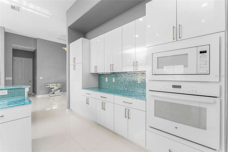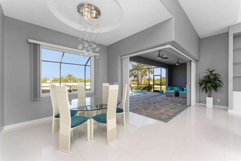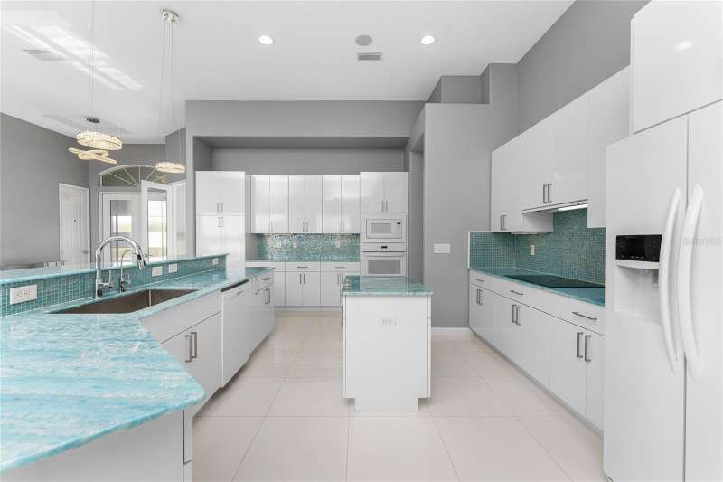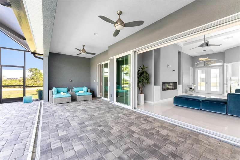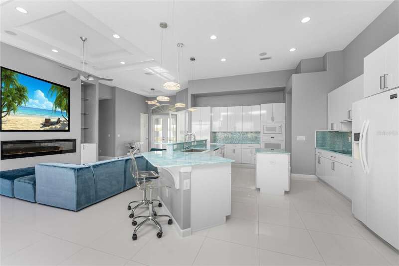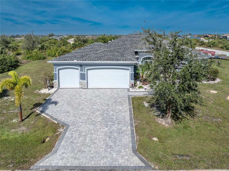 Welcome to this meticulously maintained 3-bedroom, 2-bathroom home plus den that offers an impressive 2,115 sq. ft. of living space. Set on a large double lot, this home has been thoughtfully designed, blending modern amenities with luxurious finishes. Boasting a new HVAC V/S motor and deluxe UV light installed in February 2022, along with fresh interior and exterior paint, this home is move-in ready and perfect for anyone looking for a stylish, worry-free lifestyle. The culinary kitchen, is a true chef’s paradise! This gourmet kitchen is outfitted with stunning aqua onyx countertops, a beautiful glass tile backsplash, and an expansive double island—perfect for entertaining or casual family meals. The sleek glass cooktop and abundance of soft-close cabinets and drawers provide both style and function, making cooking a true joy. This open and airy floor plan is enhanced by soaring high ceilings and elegant touches, including double tray ceilings in the living area, a circular tray ceiling in the dining room, and tray ceilings in the foyer. The open concept seamlessly connects the living room, dining area, and kitchen, with pocket sliding doors leading to the gorgeous pool area, perfect for enjoying Florida’s indoor-outdoor lifestyle. Entertaining made easy with The great room that features a striking built-in electric fireplace, framed by custom-built shelving. A state-of-the-art 8-speaker stereo system runs throughout the great room, kitchen, primary bedroom, and lanai, making it ideal for hosting gatherings or simply enjoying music throughout your home. Step outside to your private oasis featuring a luxurious heated saltwater pool with a sun shelf and a tranquil waterfall feature. This space is perfect for both relaxation and entertaining guests in the gorgeous Florida weather. The spacious primary bedroom features ample walk-in closets to accommodate all your storage needs, while the high-end finishes provide a sense of retreat and relaxation. The primary bathroom is a spa-like retreat, with an oversized walk-through shower featuring dual shower heads for an ultimate luxury experience. This home offers a split floor plan with 2 bedrooms and a guest bathroom that offers a beautifully tiled walk-in shower with direct access to the pool area—perfect for rinsing off after a swim. The large laundry room offers Topaz Gem countertops, extensive cabinetry, and a convenient laundry tub. The home is equipped with hurricane windows throughout and a lanai panel for added protection during storm season. New roof installed in 2023, 2x2 porcelain tile throughout, and a Rain Soft water treatment system, installed in October 2019, ensures high-quality water for everyday use. The exterior of the home is just as stunning as the interior, featuring a beautifully paved driveway that leads up to the insulated 3-car garage with epoxy-coated flooring. Lush landscaping, mature plants, irrigation system and white Caribbean beach pebbles add to the home’s appeal. Fenced in pet area with 2 gates provide a safe haven for your pets. This home is truly a showstopper, offering a blend of luxurious features, thoughtful upgrades, and a prime location in South Gulf Cove. Whether you’re looking for a peaceful retreat or an entertainer’s dream home, this property has everything you need and more.