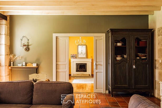 The large building, with its 258 m2 of living space, has a comfortable entrance which opens onto the living room. Carefully decorated, it proudly displays its open fireplace, its parquet floors, its wooden beams and its terracotta floor tiles. A double pocket door reveals a large room. Currently used in an office, its function can be multiple (games or sports room, bedroom, reception room, etc.).