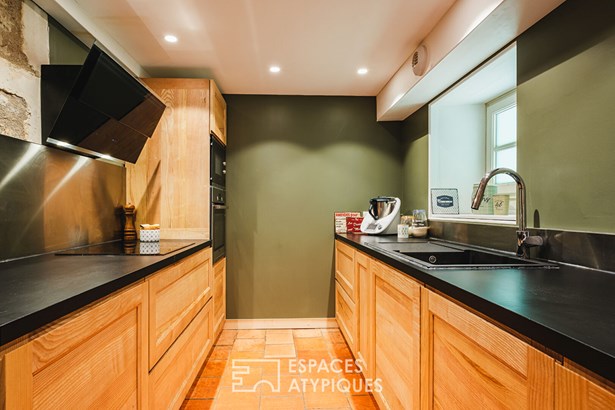 As an extension of these spaces, the family living room offers a play of materials from which great serenity emerges. An island complementary to the independent laboratory kitchen allows you to share pleasant culinary moments. A workshop glass roof opens onto the service entrance of the house where the old charm is not left out with an old bread oven. To enjoy the balmy summer evenings on the terrace, a door allows direct access to the outside. On this same single-storey level, a hallway serves the laundry room, a toilet and a bathroom.