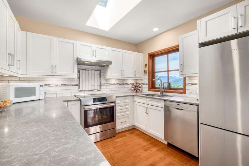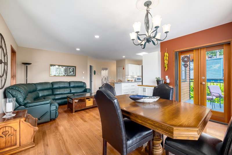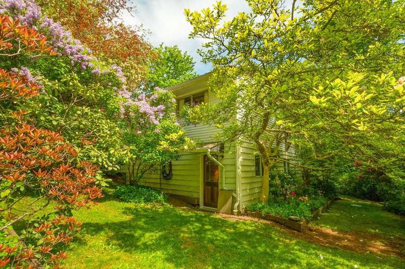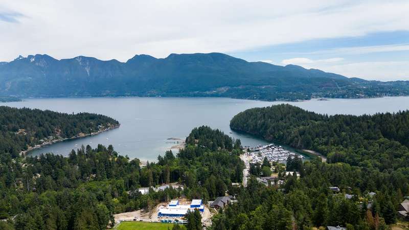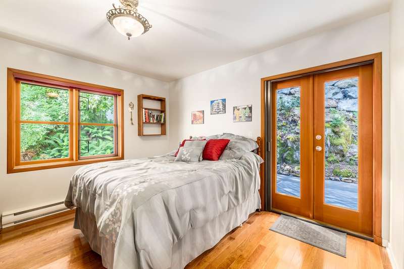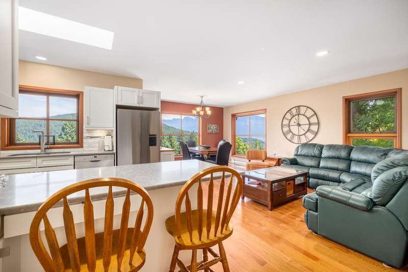 Charming mountainside home featuring breathtaking coastal mountain & ocean views. Set upon a private lane & mere steps away from the shops, cafes & services of Artisan Square. The community shuttle will also whisk you to/from the many amenities of Snug Cove & ferry. You are greeted by a covered porch and a lovely side garden that leads you to a back terrace perfect for barbecues or lounging. A concrete pad in place allows for an auxiliary structure (office, greenhouse). The first floor features a generous sized family room with fireplace for cozy nights along with a bedroom & bathroom. The upper level boasts an open plan. Primary bedroom on this level leads to a covered deck. Recently updated roof (50 yr warranty), bathrooms & kitchen, outfitted with Bosch, Fisher & Paykel appliances.