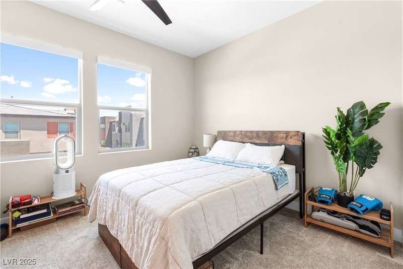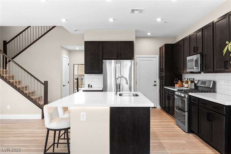 *FURNISHINGS OPTIONAL* Contact listing agent for details! Immaculately maintained Tri Pointe home in one of the fastest-growing areas of the Southwest, just minutes from the I-15. Highly desirable open-concept floor plan features three bedrooms, two and a half baths, and a furnished interior with modern design t/o. The kitchen boasts a large quartz island, SS appliances, and upgraded designer cabinetry. Standout features include a custom wood slat wall in the living area, dramatic floor-to-ceiling wood paneling in the stairway, modern stair railing, upgraded designer light fixtures and finishes, and bright natural tones throughout. Abundant natural light flows through the home, highlighting the spacious upstairs loft with walk-in closets and the large primary retreat with dual sinks and a walk-in shower. Thoughtful finishes, a downstairs powder bath, and a two-car garage complete the package. Community pool and all the conveniences of a booming Southwest location.