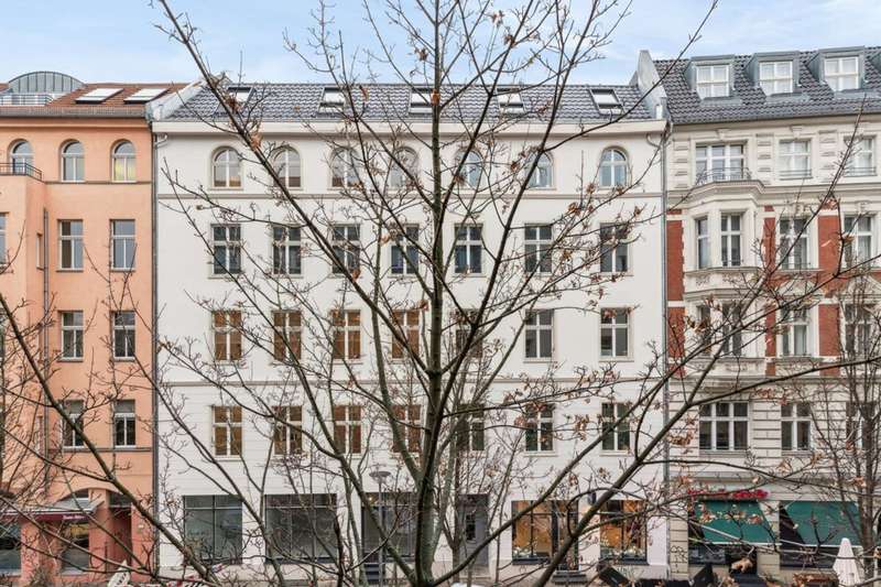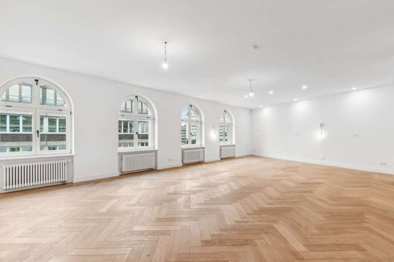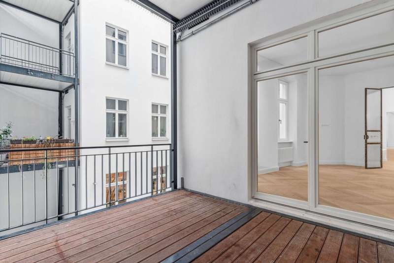 Wilhelminian charm meets clean chic: a loving renovation with an eye for detail, exquisite materials and world-class design make this 4-room apartment your ideal residence in the heart of the city. The heart of the apartment is the sunny living room with kitchen: at around 57 m², it offers plenty of space for a large dining area, a sitting area, bookshelves up to the ceiling or whatever you want in your home. In the kitchen area, a kitchen island with hotplates and a small storage area provide convenience for cooking and enjoying, while the high-quality fitted kitchen with a marble look turns every simple dish into an event. The wonderfully high ceilings and sophisticated lighting create a sense of space and a cozy feeling at the same time. Relax here every evening or receive guests for lavish celebrations. A study can be separated from the eat-in kitchen if required. The elegant shower room has a level-access rain shower and high-quality fittings in a clean design. Another double washbasin and an elegant free-standing bathtub await you in the directly adjoining anteroom of the bathroom - pure luxury. You enter your courtyard-facing room through a modern double door, where you can set up your own private living room, for example. It offers access to your large, courtyard-facing balcony, where you can enjoy refreshing coolness even in hot temperatures. It offers enough space for plants, an elegant seating area and atmospheric lighting. Set up your personal outdoor oasis here, where you can enjoy a cocktail on a warm summer night or a coffee in the first rays of the day.