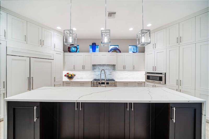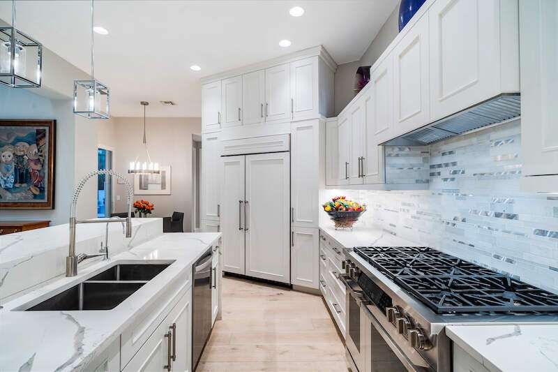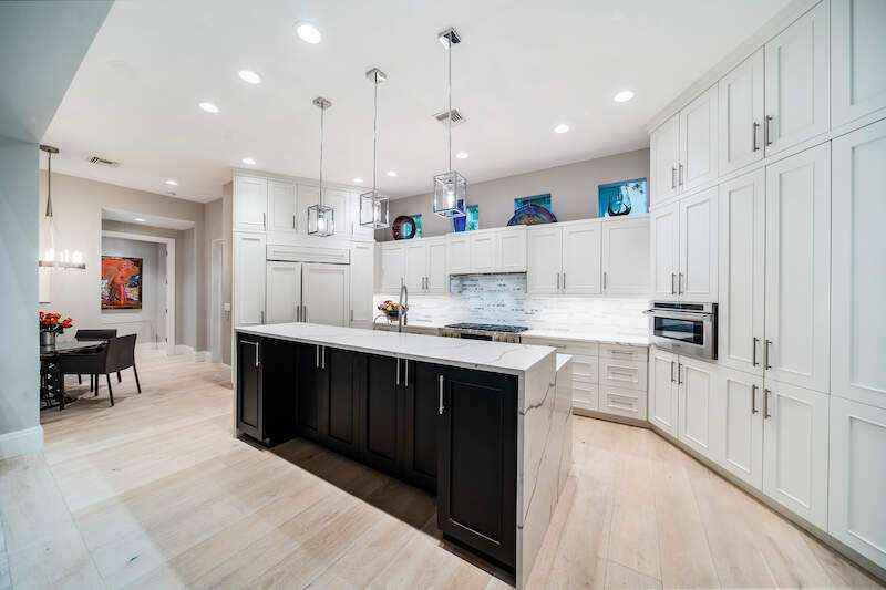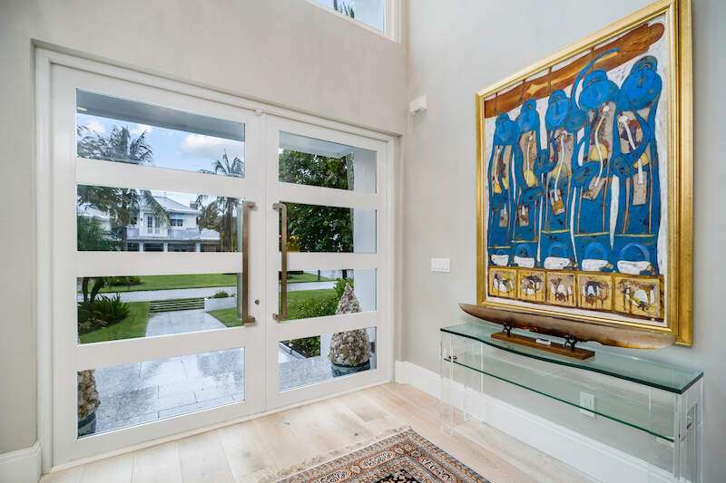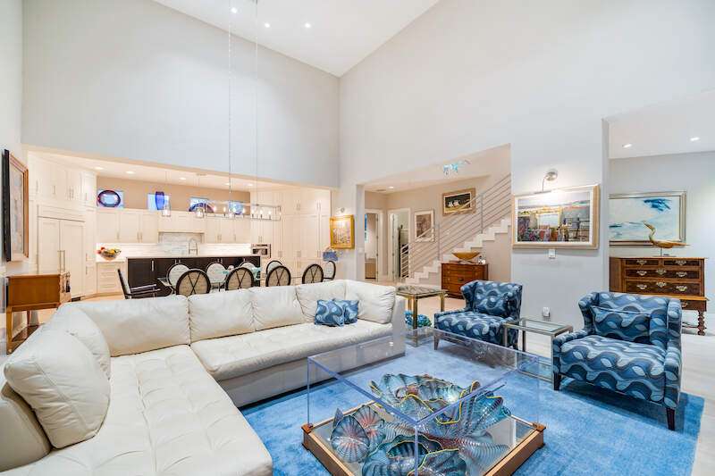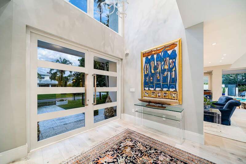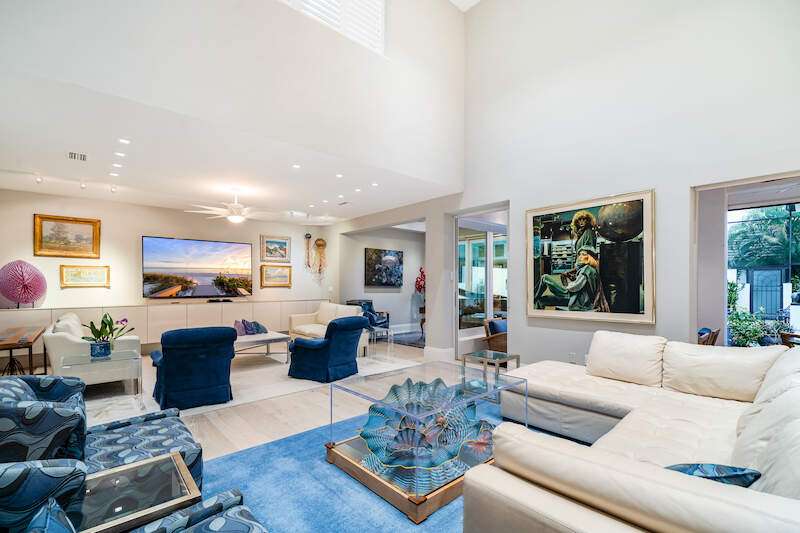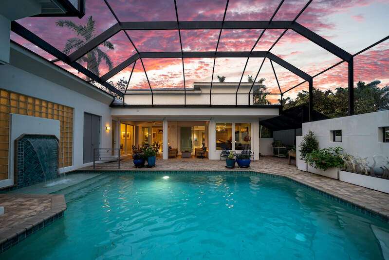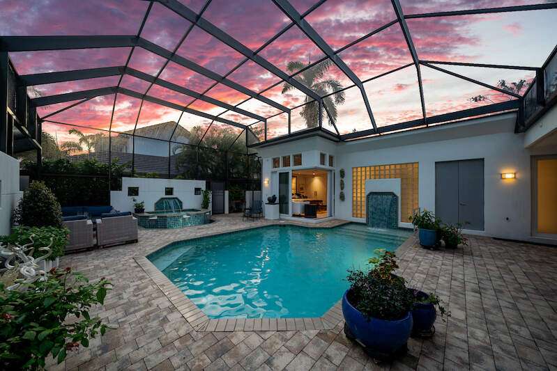 Situated in one of Olde Naples' most sought-after locations, this high-elevation home offers unparalleled peace of mind with NO water damage and lower flood insurance costs thanks to its placement in the X500 flood zone. The property sits on a 14,000+ square foot corner lot with lush landscaping, offering privacy and a perfect blend of luxury, convenience, and coastal elegance. Recently remodeled between 2021- 2023, the home showcases top-tier finishes on par with brand-new construction built in 2022. The front elevation was expanded to include a new metal raised single-seam roof, an open 2-story foyer, glass double doors, and an elevator area. Inside, you will find European French white oak engineered hardwood flooring, soaring ceilings from 12 to 18 feet high, and IMPACT windows throughout. The chef's kitchen is equipped with white shaker cabinetry, an oversized island with black accent cabinetry towards the dining room and luxurious quartz countertops with a waterfall edge, complemented by DACOR 6 burner 2 oven gas cooktop, VIKING microwave/convection oven, and a SUBZERO side-by-side refrigerator. The spacious home includes a music room, large den, open loft space, and an expanded laundry/butler's pantry. The owner's suite occupies its own private wing with a large walk-in closet, extra built-in doored storage & closet system, a bedroom with walls of windows and sliders leading to the private pool and spa. The spa-like bathroom featuring a walk-through shower with multiple shower heads, dual vanities, and a private water closet. Upstairs, the home offers three large guest suites, each with ample closet space, natural light, and balcony access from two of the suites. The exterior features the most thoughtfully mature plantings, trees and flower beds, Bahama shutter accents, LED landscape lighting, and a handcrafted shell-stone driveway and walkway. The covered lanai has new electric rolling "sun and storm" screens, and the pool and spa area are enclosed for added protection. All of this sits just three blocks from the beach, the new Four Seasons, NCH, and all the amenities of Olde Naples. Positioned on a quiet street with no thru traffic, this home is the ideal mix of modern design, top-of-the-line finishes, and the privacy and convenience you have been looking for. WITH NO hurricane damage at all, this home is ready for its next lucky owner.