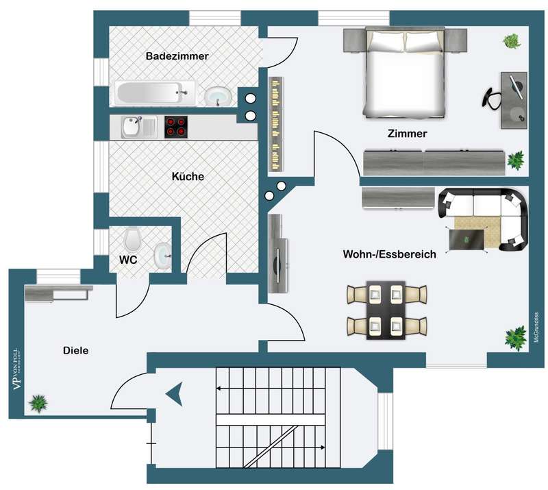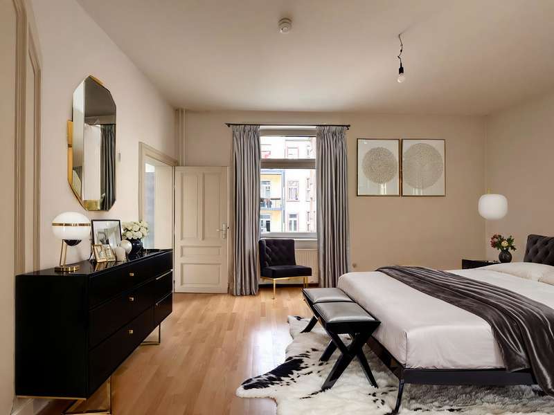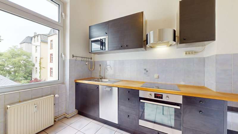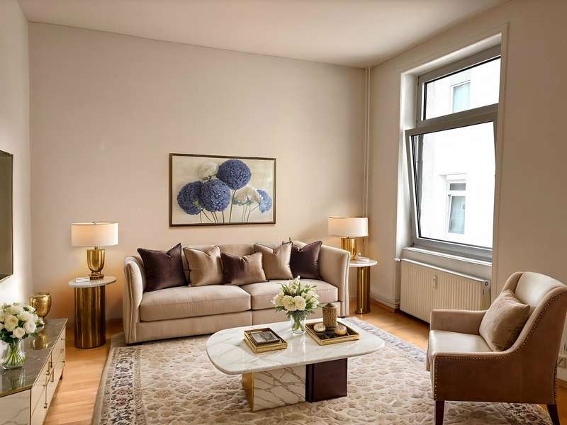 This first-class two-room apartment is located in a modernized period building in a quiet location in Ostend near the popular Berger Strasse. The apartment is accessed via a stylishly modernized staircase. The apartment is spacious and bright. It offers individual living with charm. The entrance hall with plenty of space for a checkroom leads into the well-kept eat-in kitchen and the inviting living room. From here you have access to the adjoining, quiet bedroom with a view of the idyllic inner courtyard. The daylight bathroom en suite with bathtub is adjacent. The old building flair is emphasized by the high ceilings and the original coffered doors. At the same time, the apartment offers many possibilities for personal design. This charming apartment is ideal for singles and couples who appreciate the quiet location and proximity to the urban Berger Strasse.