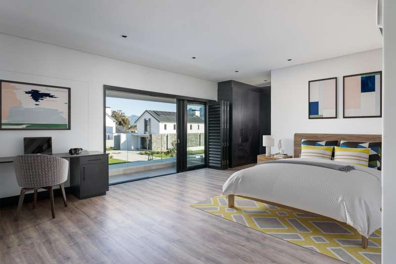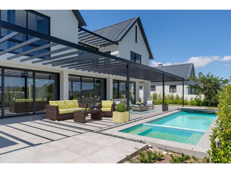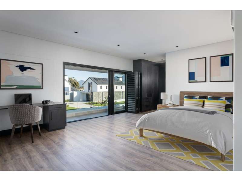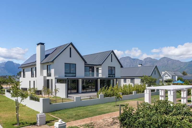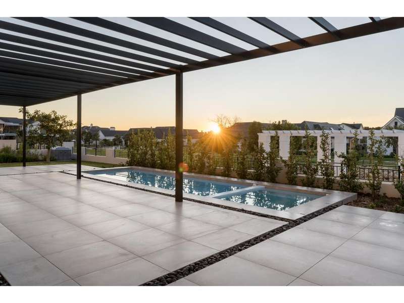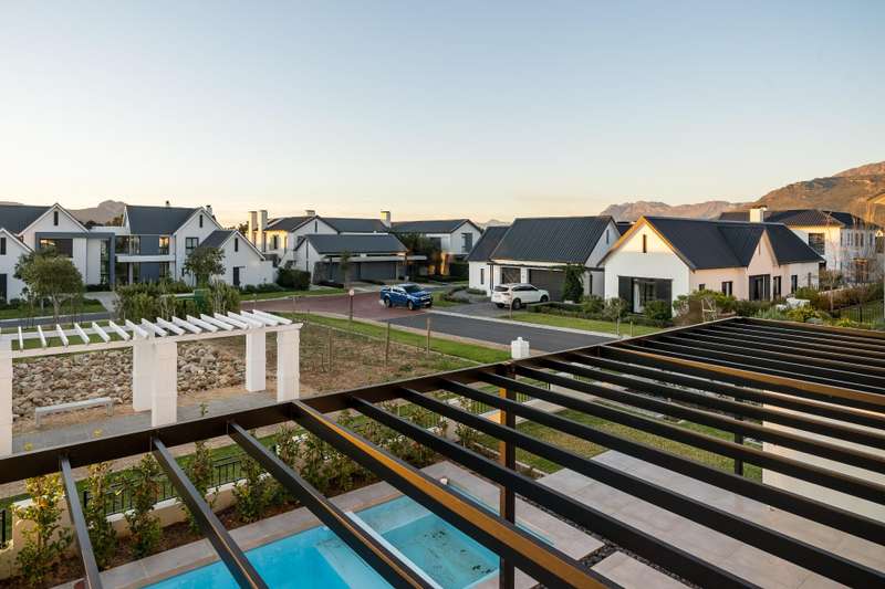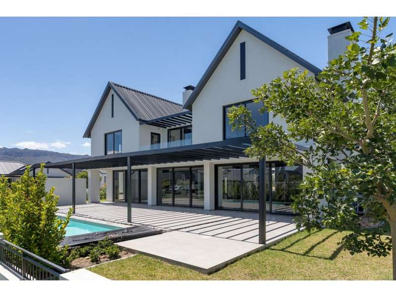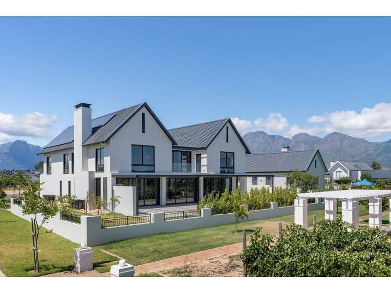 Exclusive sole Mandate! Situated in La Vue, this sophisticated north-facing masterpiece offers the essence of Val de Vie Estate living. A true family sanctuary overlooking a park with breathtaking views of the valley. Discover a world of convenience and opulence in this voluminous and light filled home, where every detail has been meticulously crafted to perfection. With expansive entertainment areas blending indoor and outdoor spaces, this home sets the stage for effortless entertaining. The interior unfolds gracefully into an open-plan living space that effortlessly integrates a TV lounge, dining area, a massive kitchen, and entertainment room with built in fireplace. Stacking doors connect this area to the braai patio overlooking the inviting pool and garden offering picturesque views of Paarl Rock in the distance with a lush greenbelt in front ensuring space and privacy. Practicality meets elegance in the design, with a massive walk-in pantry, and spacious scullery/laundry area leading to the laundry courtyard and 3 garages The downstairs offers an expansive guest bedroom as well as further entertainment space and convenient bar area. A sizeable pyjama lounge on the first floor, offers a perfect space for relaxation and play. The 4 bedrooms on this level are generously sized, each boasting fitted cupboards and en-suite bathrooms. The main bedroom stands out as an unparalleled of luxury, featuring a sumptuous bathroom, dressing area, breathtaking views. An open plan office competes the upstairs. Features such as a full solar and battery system, sleek cabinetry and shutters and 3 wood burning fireplaces, make this a standout home not to miss!