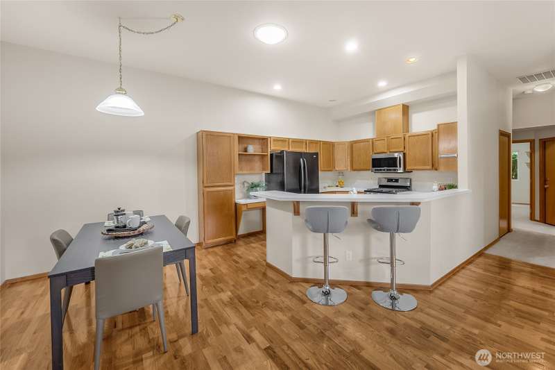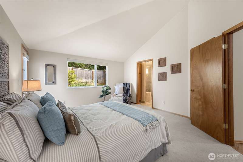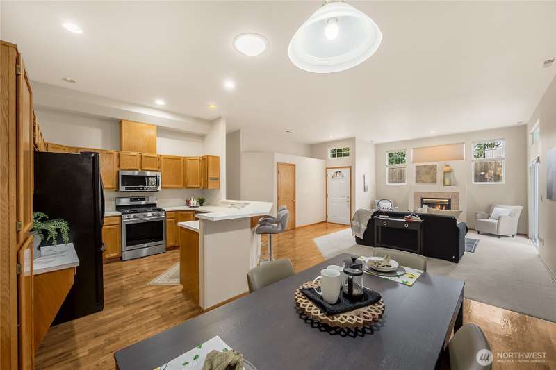 Nestled on a corner lot in the secure Harbor Summit community, this step-free home delivers comfort & convenience. The open-concept great rm with a cozy gas fireplace flows seamlessly to a private patio & landscaped yard - perfect for indoor-outdoor living. The inviting dining area connects to a charming kitchen featuring stainless steel appliances, vaulted ceiling, & breakfast bar. Timber flooring, air conditioning, remote blinds, & lofty ceilings complement the interior. The primary suite boasts an updated bath with a stylish walk-in tile shower & an expansive walk-in closet. Designed with both everyday comfort & entertaining in mind, this home is just minutes from downtown Gig Harbor & an array of local amenities. A truly prime location!