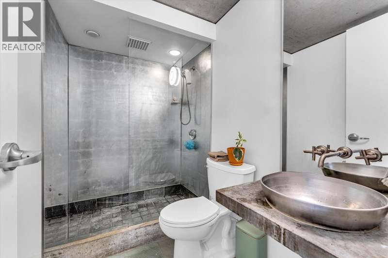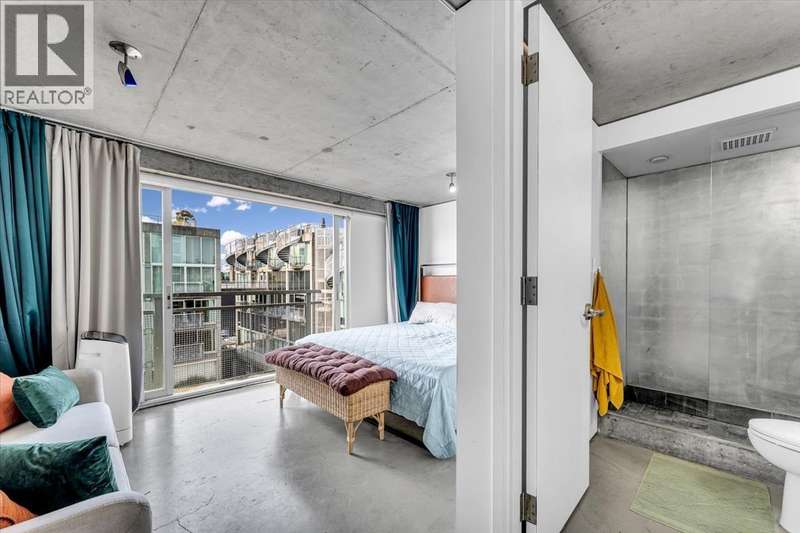An architectural icon at the gateway to Granville Island-welcome to the award-winning Waterfall Building by Arthur Erickson. This one-bedroom loft with a spacious office/den (could be 2nd bedroom) features soaring 16´ ceilings, radiant heated concrete floors, exposed concrete walls, and a striking floating staircase. Juliet balconies on opposite ends create a refreshing cross-breeze, while floor-to-ceiling windows flood the home with natural light. Perfectly located just steps to Granville Island, W4th Ave and Granville shops. Zoned C-2B for live/work use. Includes one parking and one storage. (id:58403)