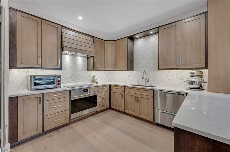 Not to be missed San Marino Condo in Pelican Bay! Fabulous renovation with top of the line features. Current owners did an extensive renovation and used quality material throughout. Gorgeous wide plank white oak flooring in main living and kitchen. Open Kitchen with custom wood cabinets, quartz counter tops, marble backsplash, Sub*Zero Refrigerator, Wolf Induction cooktop. Pantry wall of cabinets. Extensive built in bar with wine fridge in dining area. Renovated primary and guest bathrooms with custom cabinets and beautiful tile selections. Tasteful furnishings, custom window treatments. New cabinets in laundry room. Quality and care throughout. San Marino offers residents it's own pool, spa, grills, fitness room and social space. It is a also Pet Friendly community allowing 2 pets under 45 pounds OR 1 under 70 pounds. San Marino is conveniently located just across the street from the private Pelican Bay tram stop for quick and easy beach access. Residents of Pelican Bay, enjoy exclusive access to all its premier amenities, including 2 private beachfront restaurants and bars, attended beach service, kayaks, paddle boards, 18 Har-Tru tennis courts, an advanced fitness center, pickleball coming soon, and scenic nature trails for walking and biking. Perfectly situated near Artis Naples, Waterside Shops, and Mercato.