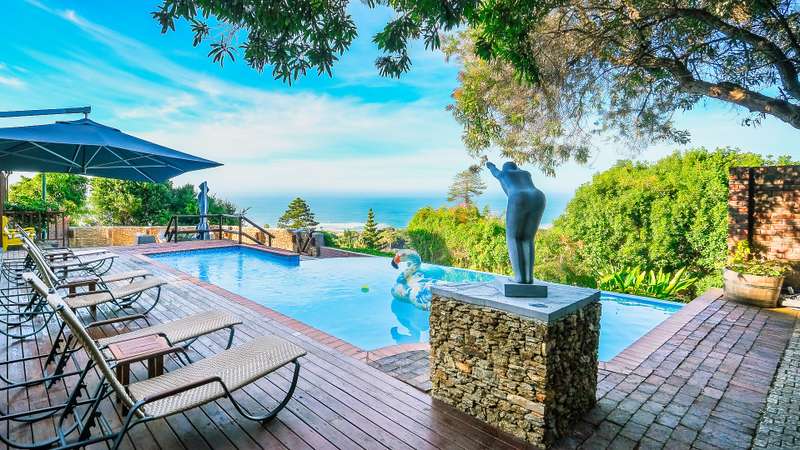 Exclusive Joint Mandate | R14 900 000,00 + VAT = Asking price R17 135 000,00 This property presents a remarkable investment opportunity to acquire a unique 4-star guest lodge situated in an indigenous forest setting in Wilderness. With luxurious comfort and breathtaking scenery, this 5-bedroom guest lodge offers stunning sea views and a central location. Property Highlights: Erf Size: 2,210 sq meters Building Size: 406 sq meters Guest Lodge Features: 5 Spacious Luxury Suites: Each suite features an en-suite bathroom, private deck with captivating sea views, air conditioning, satellite TV, mini-bar, and private entrance, offering guests a choice between luxury B&B and semi-self-catering options. Accommodation for up to 10 guests. Manager/Owner’s Residence: A newly renovated 42 sq meter unit with a spacious patio. Amenities: A large infinity pool, entertainment gazebo, and BBQ facilities create a private and exclusive guest experience on the terrace area. Double-Story Building: Includes a reception area, two administrative offices, and a storeroom. Proximity to Attractions: Located close to championship golf courses, scenic forest trails, and activities such as hiking, kayaking, and hang gliding, Wilderness is an ideal destination for nature lovers and adventure seekers alike. Prime Location: Only a scenic 20-minute drive from George Airport along the picturesque N2 highway and Kaaimans River Pass, this lodge is conveniently positioned near Mossel Bay, Knysna, Oudtshoorn, Plettenberg Bay, and other key Garden Route destinations. This extraordinary property, complete with furniture, fixtures, and business infrastructure, is a prime investment opportunity for those interested in establishing a successful hospitality business in a sought-after eco-tourism destination. Option to acquire the Art Studio/Gallery & laundry facilities at an additional cost of R3 400 000,00 + VAT = R3 910 000,00 The Art Studio/Gallery offers a kitchen with both gas and electric appliances, staff facilities, linen and laundry rooms, office area, and a large ocean-view deck.