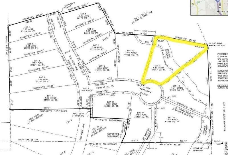 Dell Ridge is a scenic community with beautiful homes. Lot 11 is available, featuring a wooded lot,104 feet of curb frontage, a walk-out site, and 1.32 acres. Choose your own builder. Minimum square footage: 1,600 for a ranch, 1,800 for a multi-level, and 2,000 for a two-story. Located in the Alburnett School District, with open enrollment options for Cedar Rapids or private schools, plus bus stop access. Dell Ridge is 1 mile north of Tower Terrace and 1.3 miles south of County Home Road, with easy I-380 access. MidAmerican Energy and REC Electric service the area. There is a 3.72-acre pond The $150/year HOA fee covers pond maintenance, plantings, and the access trail. Hiawatha owns 17.55 acres for a future park, including Turtle Creek Park with soccer fields and a walking trail. Directions: Tower Terrace, north on Edgewood, east on Fitzroy, north on Forrest Meadow Lane to Forrest Hill Court.Buyer to verify all information.