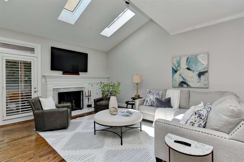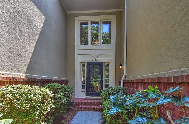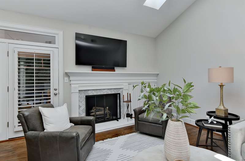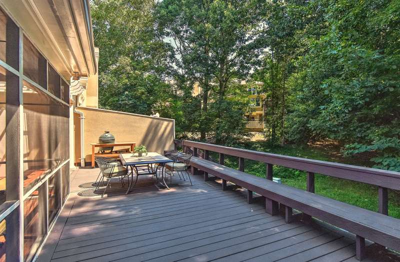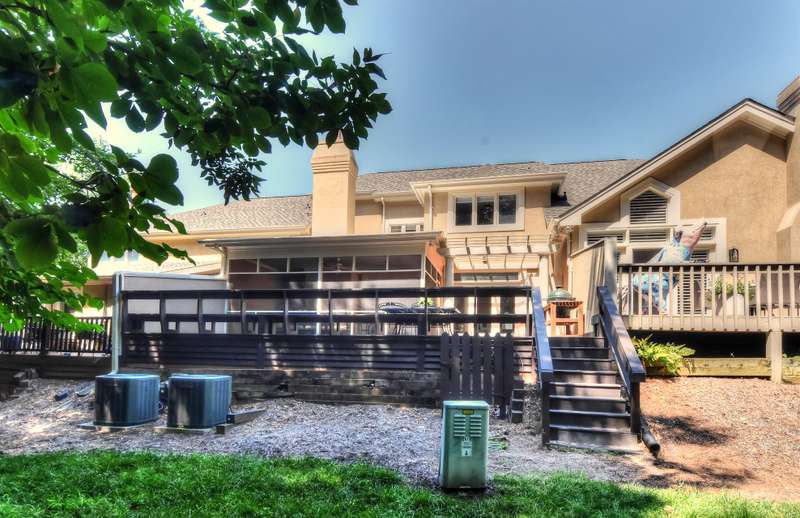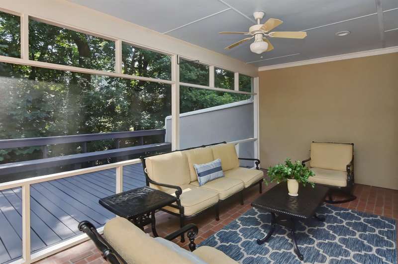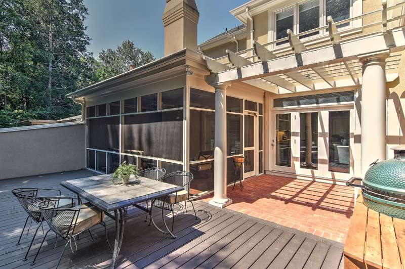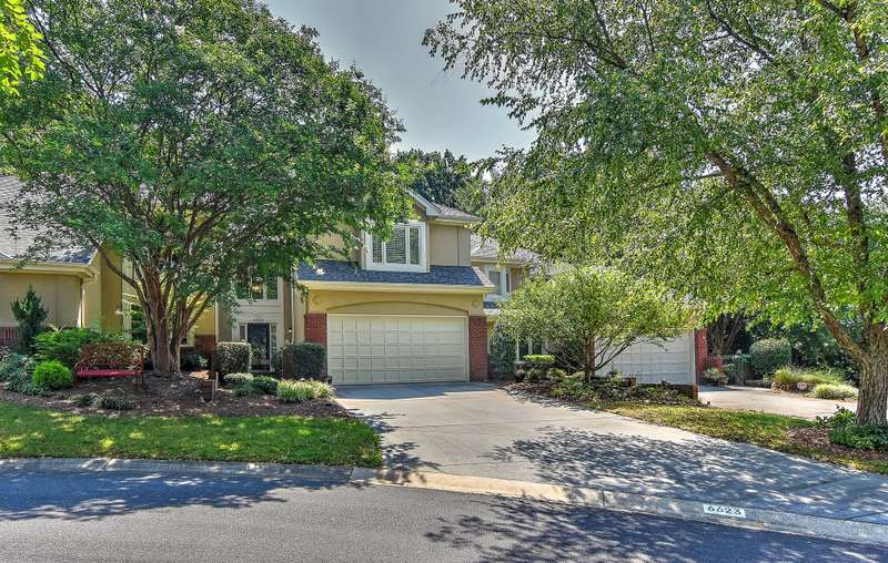 Move-in ready Southpark area townhome nestled in a private, quiet setting with mature landscaping and neutral paint throughout! Gated courtyard entrance welcomes you into a 2-story foyer open to large dining room and great room with vaulted ceiling, built-in cabinets, and gas log fireplace. Updated kitchen features granite countertops, subway tile backsplash, tile floor, stainless steel double ovens and breakfast room. Site finished hardwood floors throughout the main level, stairs, upstairs landing & primary closet. Large primary suite w/ vaulted ceiling, plantation shutters, updated bathroom and large walk-in closet. 2 additional large bedrooms and 2nd full bath complete the upper level. Screen porch and large, well-maintained deck overlook wooded and private common area. 2 car garage. Roof replaced in June 2025. HOA includes exterior building & landscaping maintenance as well as water and sewer.