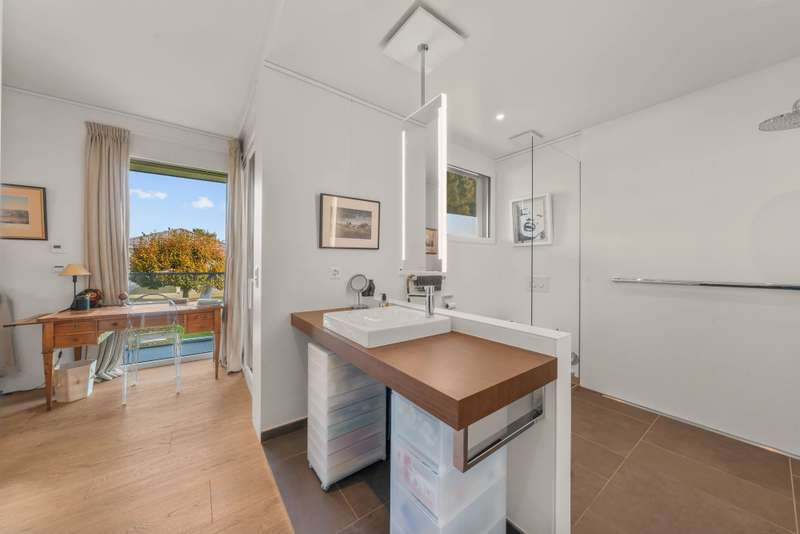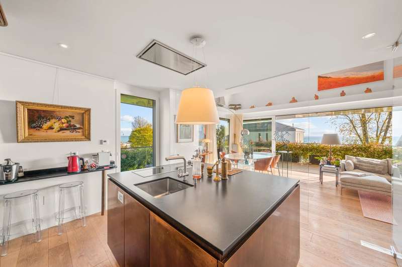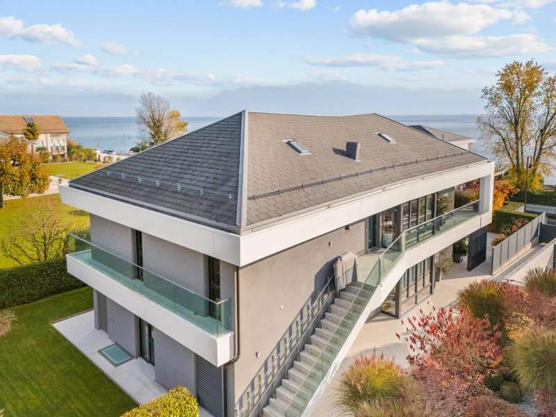 This luxurious residence, built in 2014, nestles in the heart of one of Saint-Sulpice's most prestigious neighborhoods, prized for its calm and refined lakeside lifestyle, just a 10-minute walk from the shops. This exceptional 5.5-room penthouse offers a total surface area of 214.5 m² and boasts a vast south-facing terrace of over 70 m², with superb views of the lake and the Alps. With its high ceilings and large bay windows, this Minergie-certified residence enjoys optimum light all day long. The apartment features top-of-the-range finishes, including a fully equipped Poggenpohl kitchen, a spacious living room with direct access to the terrace and an elegant library. It comprises two bedrooms with dressing rooms and bathrooms, and offers attic space for a third bedroom, dressing room, shower room and office. A private elevator serves the apartment, and amenities such as a private laundry room, a 25 m² cellar and two indoor parking spaces complete this exceptional property.