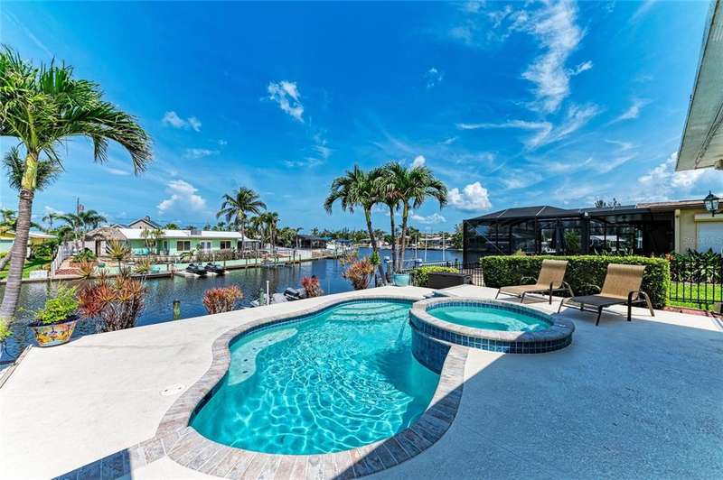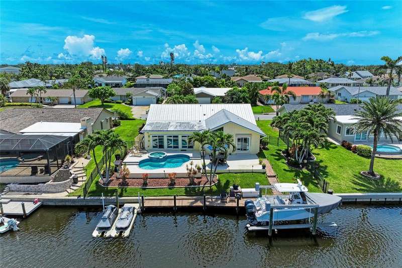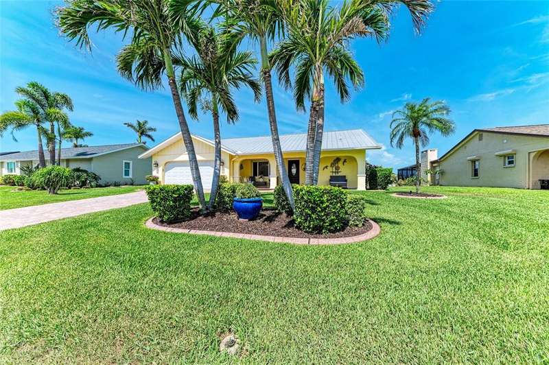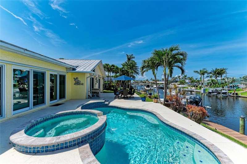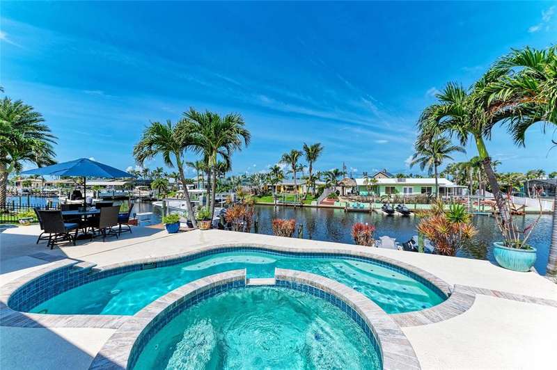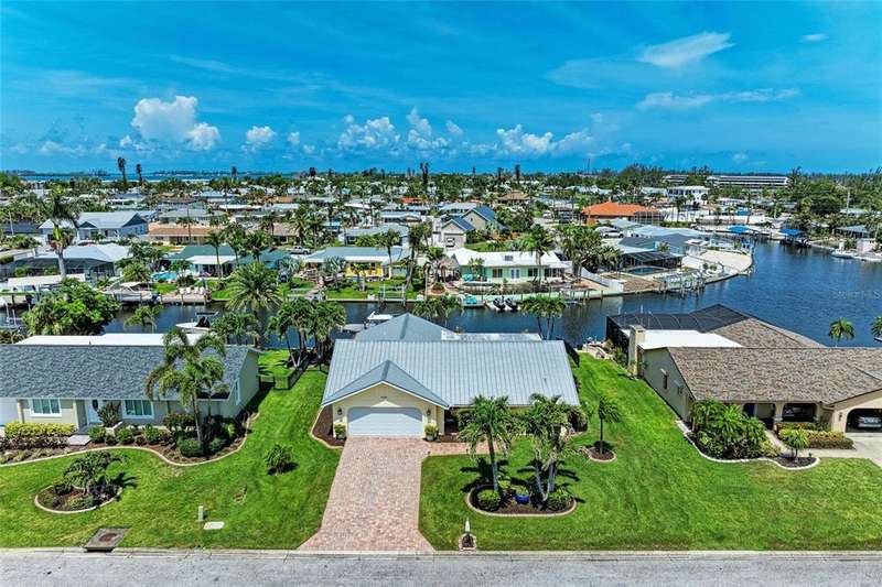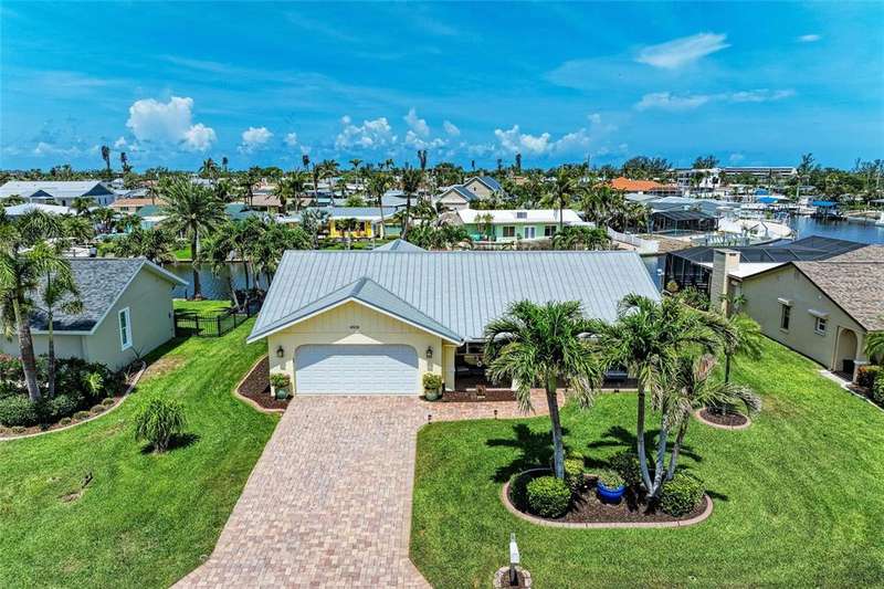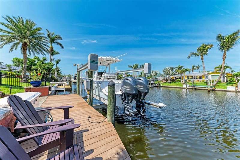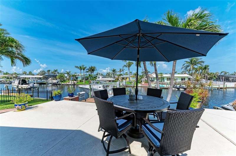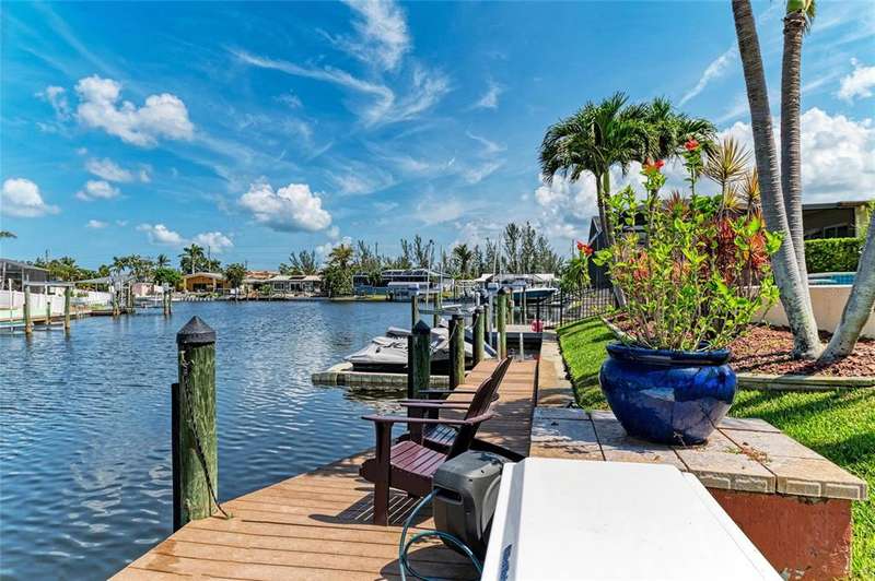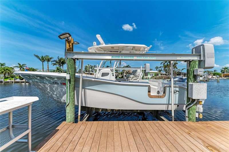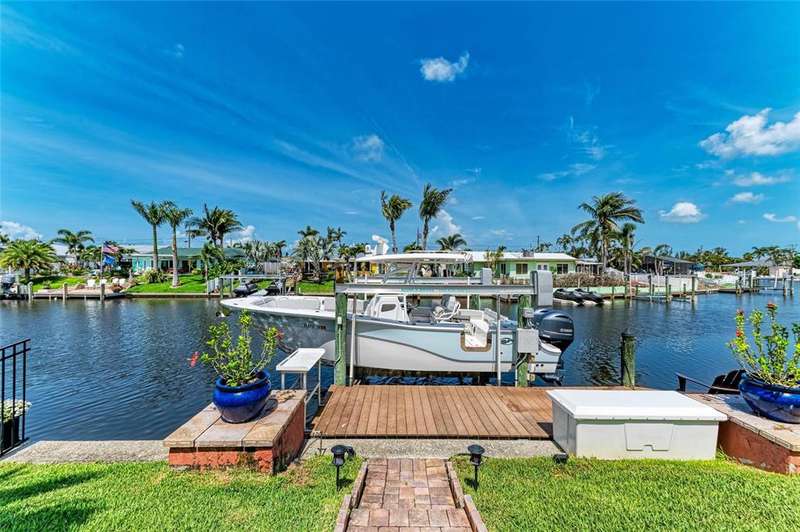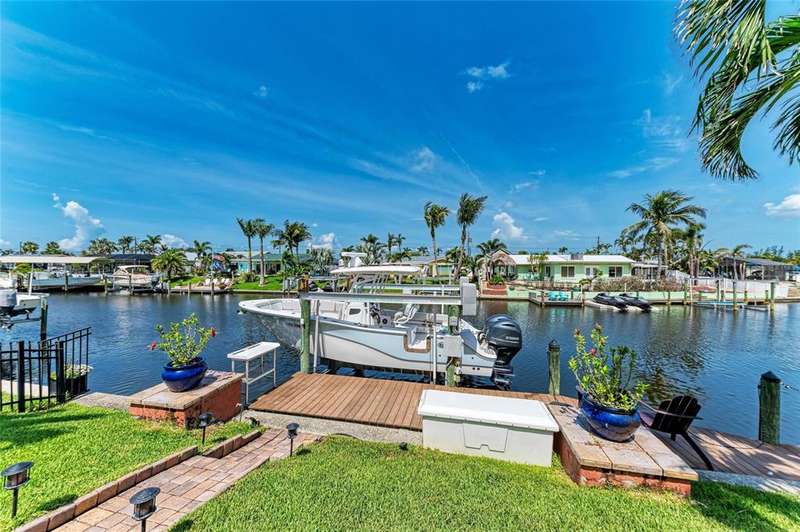 Under contract-accepting backup offers. ** $25,000 price improvement ** Welcome to your slice of Paradise with this beautifully well maintained waterfront residence in Coral Shores East only 3 miles to the sandy beaches of Anna Maria Island. This home experienced NO flooding in 2024 storms. ( Recent flood quote is only $1600) This home offers canal front living with direct access to the Intracoastal Waterway and Gulf of Mexico from your private composite 50ft dock with 10,000lb lift with power and water and fish cleaning table. There is also new dock lighting. Bring your powerboat or sailboat with with NO bridges out to big water. Imagine relaxing and soaking up the Florida sunshine in your pool/spa on the expanded patio (24’x18’) offering amazing sunset views. The pool was recently redone with new pebble-tech, coping, a new cartridge filtration system and a new pool pump! The pool is self cleaning and has a new heat pump and cooling feature with remotely controlled pool app allowing you to fully control the pool from anywhere! The entire lot is landscaped beautifully with lush grass, shrubs, potted plants, trees, and a well for irrigation. The backyard is surrounded by a beautiful fence and features an abundance of native plants and trees. The newly renovated kitchen features gorgeous wood cabinets, granite counter space for all your cooking needs and a large wall unit with pullouts and lots of storage. Crown moulding surrounds all rooms of this Brand new sliding hurricane doors (5) were installed in the family room and rear bedroom as well. The AC compressor has been replaced in the last year as well as the hot water heater. All plumbing fixtures and lighting fixtures have also been replaced in the last year. The electrical panel as been replaced with a 200amp main. All exterior windows that are not impact have roll-down shutters and a metal roof to keep your home secure from storms. The garage door was recently replaced with a hurricane resistant model. This home is NOT a "Member" of the HOA allowing for short term rentals. If you are looking for an amazing well maintained waterfront home, minutes to the beaches that allows you the benefit of short term rentals with the peace of mind of reduced flooding risks... you have found it !! Schedule your private showing today! This home will not disappoint!