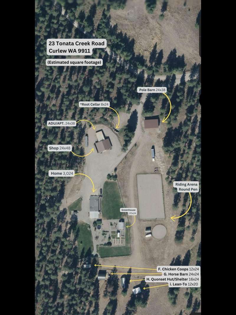 Absolutely immaculate ranch with both privacy & easy access close to the Kettle River. Miles of National forest right out your back door. Beautiful home with lots of updates & plenty of square feet with over 3,000 sq ft. It is a 3 bdm 2 bath home, currently they are also renting out 2 bdms & a bath downstairs as an apartment with it's own access. There's a 1 bdm, 1 bath adu apartment off of the shop. Inside the home there is a forced air pellet/electric furnace as well as mini splits in the additions. Laminate & vinyl flooring. Bright open kitchen. Huge covered back porch as well as a covered entry. There is a huge outdoor riding arena and round pen and a 24x24 horse barn. There is just so much to offer with this one and a picture perfect setting looking out at the surrounding mountains. The shop is 24x48 and the attached apartment is 24x38. There is a 24x38 pole barn, an 8x24 root cellar, a 20x24 green house (which does need a new roof) with a raised garden alongside of it as well as a 12x24 chicken coop, a 16x24 quonset hut and a 12x30 lean to.