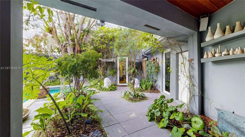 Welcome to your private sanctuary in North Grove, a distinctive 4-bedroom, 4.5-bath residence on a lush 10,000+ SF corner lot. A curated courtyard with pool and patio creates a tranquil Zen centerpiece visible from most rooms. The layout opens with a foyer leading to a spacious living area, office/library, and a guest suite. The dining room flows into a chefs kitchen with top-tier appliances. The master retreat features dual baths and custom closets. Gallery-style walls and museum lighting are perfect for art, while whimsical touches add charm. Includes impact glass, walled grounds, and security for privacy and peace of mind. This exceptional home blends style, function, and serenity in one of Miamis most coveted neighborhoods. Enjoy the 3D tour. May the Force be with you.
