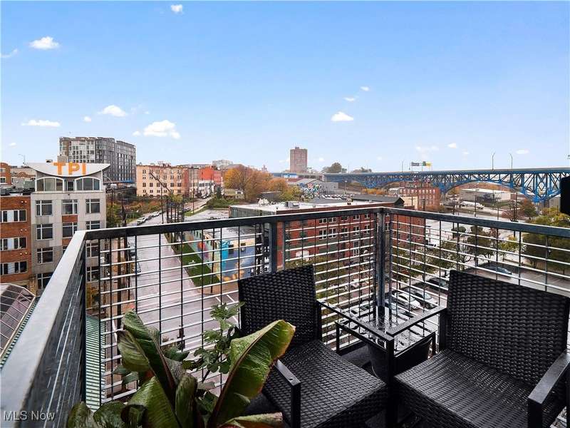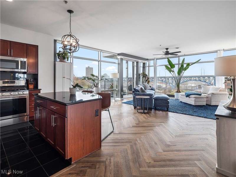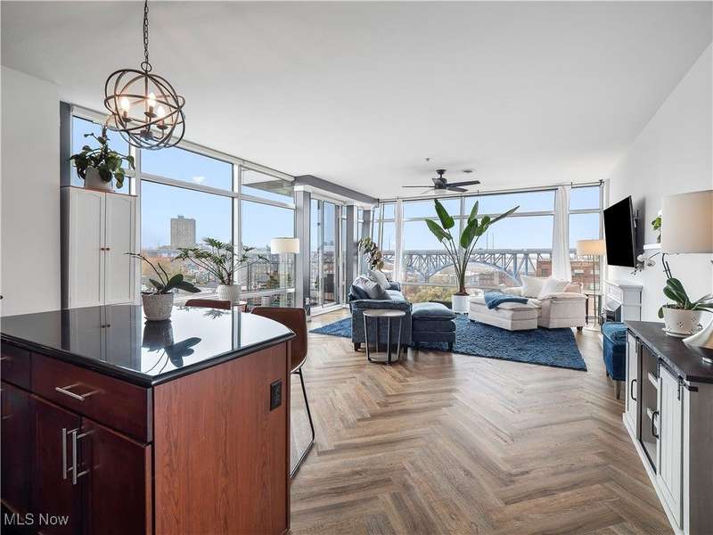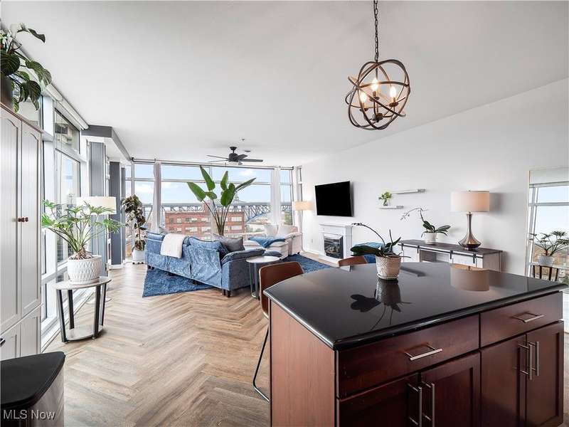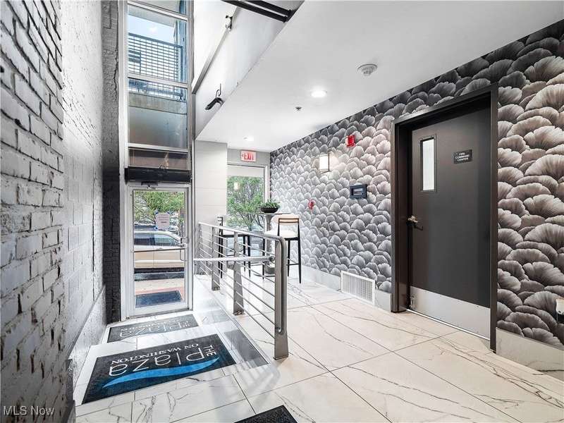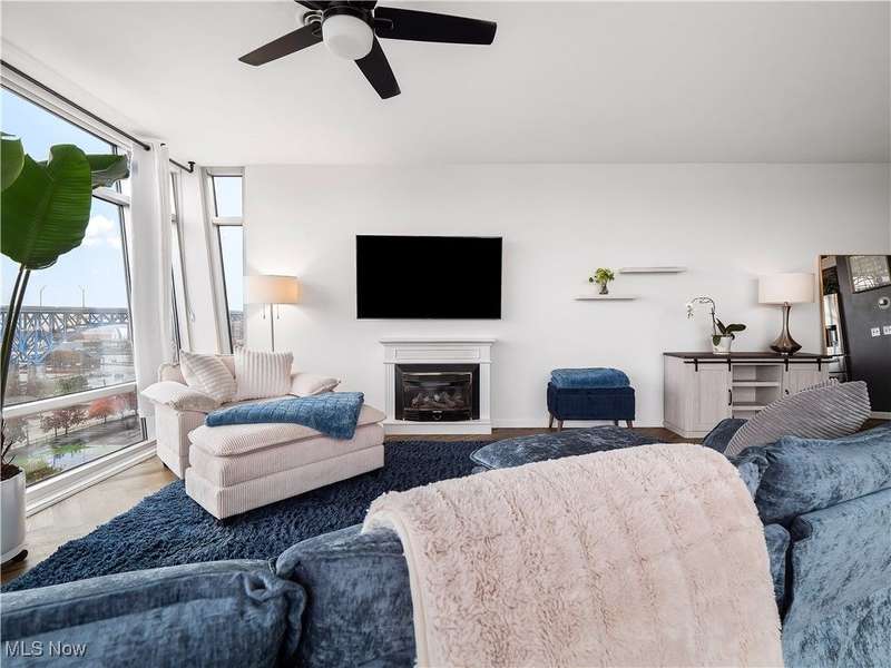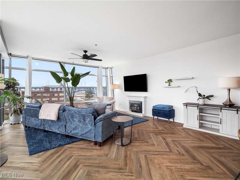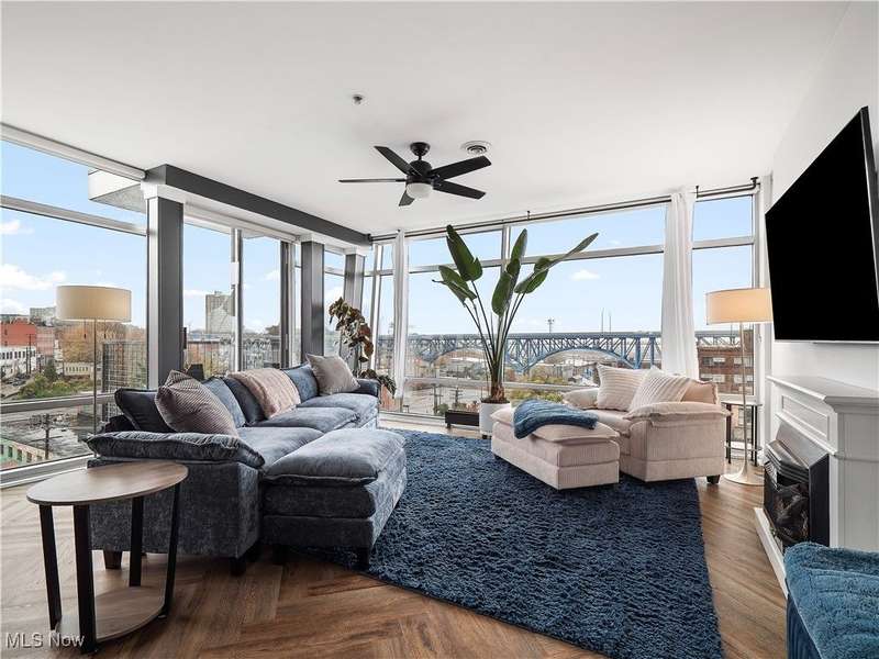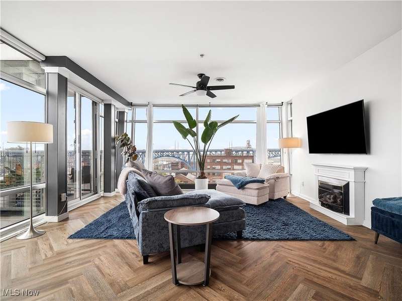 Spectacular CORNER condominium in the prestigious Plaza on Washington building. From the moment you walk in residence 1012, you'll fall in love with its stylish herringbone floors, dynamic views, and premium floorplan. The light-filled living room is positioned to maximize views from two walls of floor-to-ceiling windows. Enjoy the private balcony and gas fireplace. Upgrades include a new HVAC system, hot water heater (with expansion tank), washer & dryer, microwave, shower doors & shower head in the full bath. Fabulous kitchen has a gas range, stainless appliances, beautiful cabinets, sleek flooring & countertops. The bedroom features a walk-in closet, added closet system, and a true window which is rare for the building. This home comes with one garage parking space and is conveniently close to the elevator! The building's entryway and lobby were recently beautified with new flooring, wallpaper, seating, dazzling chandelier. Resident privileges include on-site concierge & security, workout rooms, and access to the eighth-floor viaduct to walk your dog, take in the fantastic city views, or head over to Casa La Luna for happy hour or dinner. Located on the West Bank of the Flats, you're just minutes from Downtown Cleveland and Ohio City. This is luxury living in the city.