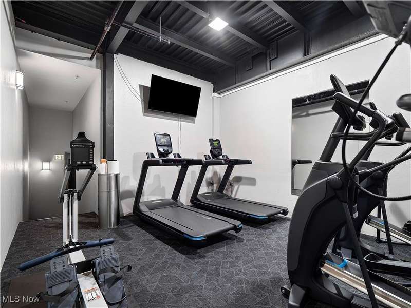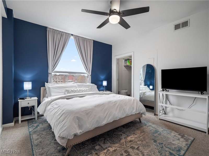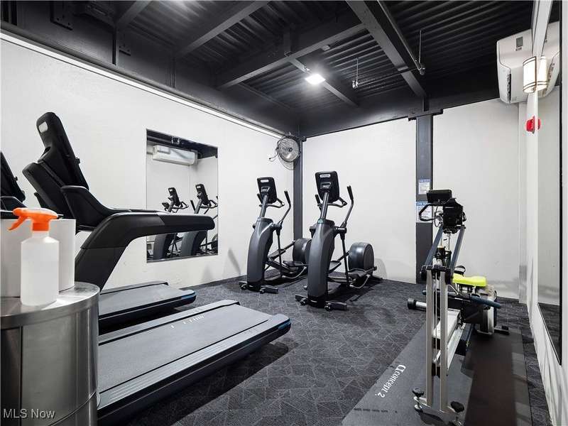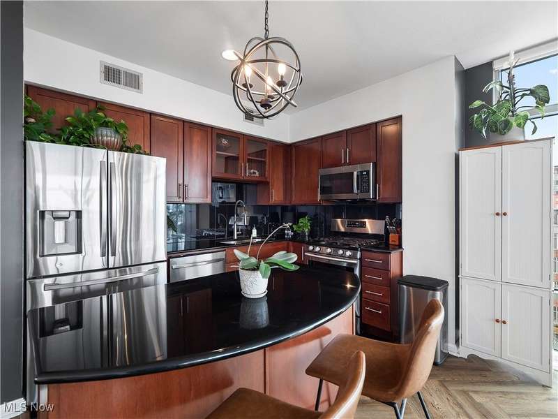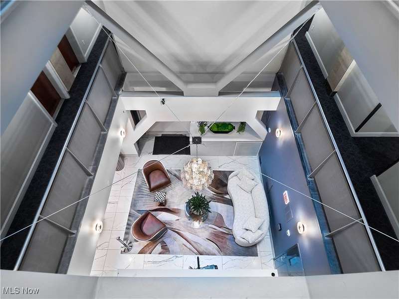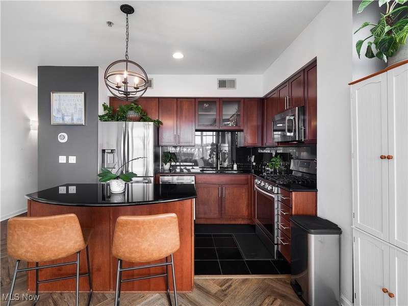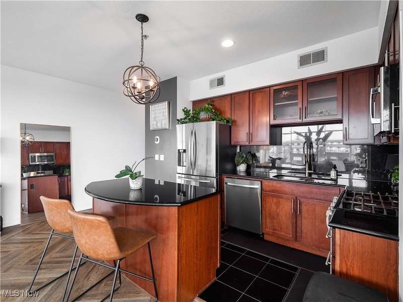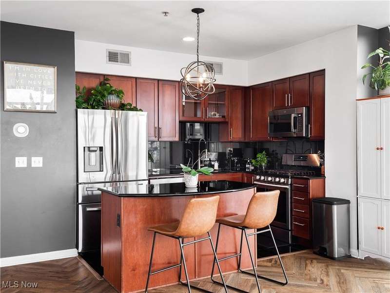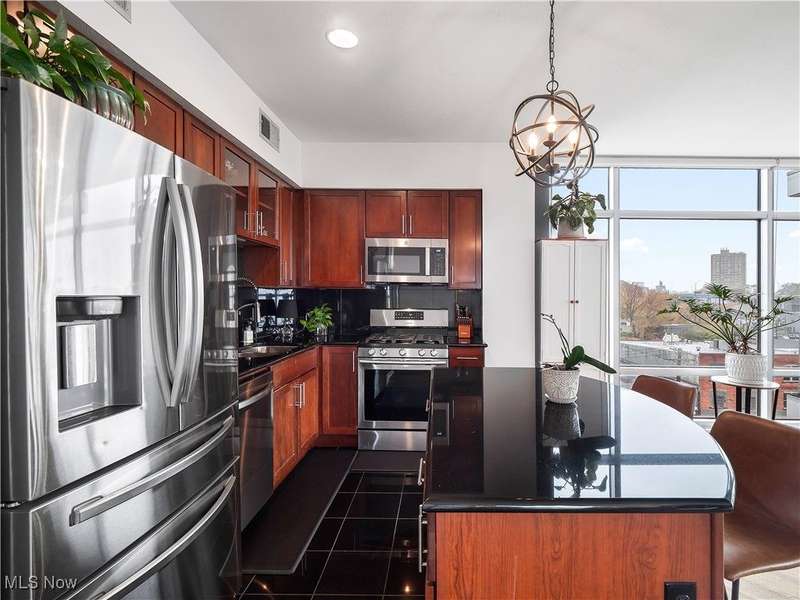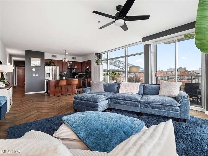 Spectacular CORNER condominium in the prestigious Plaza on Washington building. From the moment you walk in residence 1012, you'll fall in love with its stylish herringbone floors, dynamic views, and premium floorplan. The light-filled living room is positioned to maximize views from two walls of floor-to-ceiling windows. Enjoy the private balcony and gas fireplace. Upgrades include a new HVAC system, hot water heater (with expansion tank), washer & dryer, microwave, shower doors & shower head in the full bath. Fabulous kitchen has a gas range, stainless appliances, beautiful cabinets, sleek flooring & countertops. The bedroom features a walk-in closet, added closet system, and a true window which is rare for the building. This home comes with one garage parking space and is conveniently close to the elevator! The building's entryway and lobby were recently beautified with new flooring, wallpaper, seating, dazzling chandelier. Resident privileges include on-site concierge & security, workout rooms, and access to the eighth-floor viaduct to walk your dog, take in the fantastic city views, or head over to Casa La Luna for happy hour or dinner. Located on the West Bank of the Flats, you're just minutes from Downtown Cleveland and Ohio City. This is luxury living in the city.