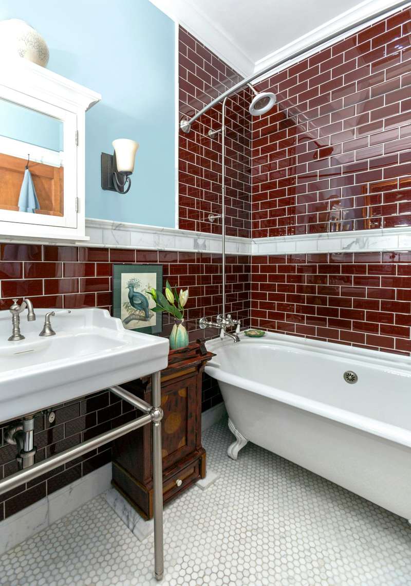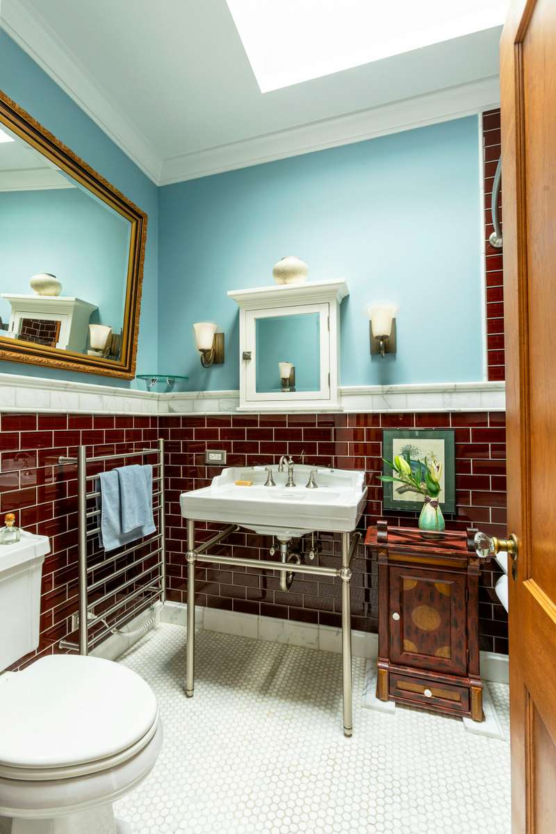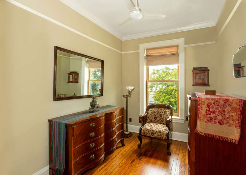 On the second floor, ;you will find three bedrooms and a handsome renovated bath with soaking tub ;and shower, ;glass-tiled walls ;and marble ;accents, floor, and tub surround. There is also ;covered ;walls, ;an electric towel warmer and a pretty vintage-style porcelain pedestal sink. This floor has a ;stained-glass skylight above the ;staircase stairwell ;and three bedrooms, each with closets and a ;dressing passage with cabinetry between the two larger bedrooms. ;