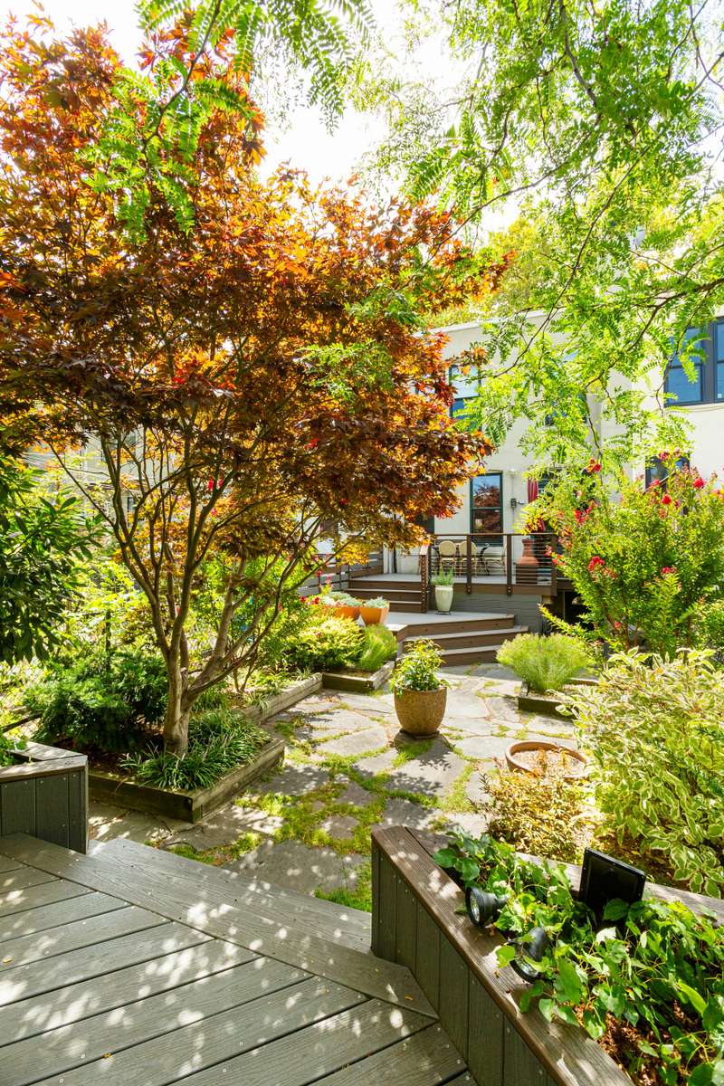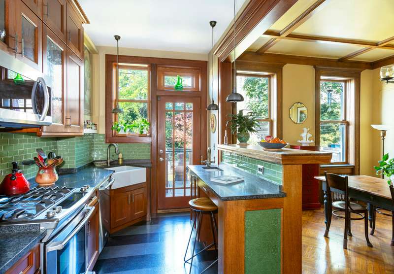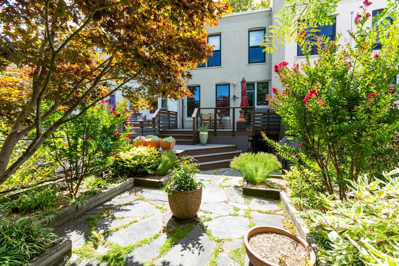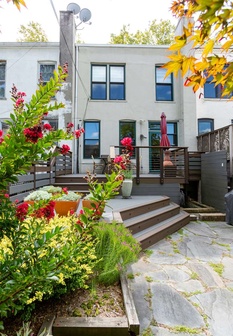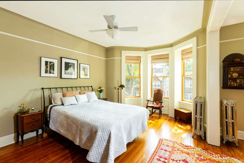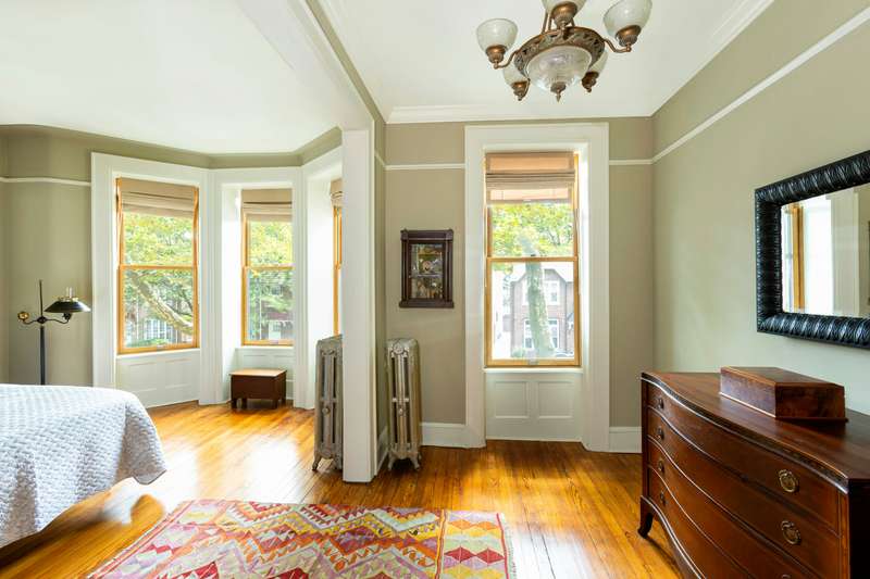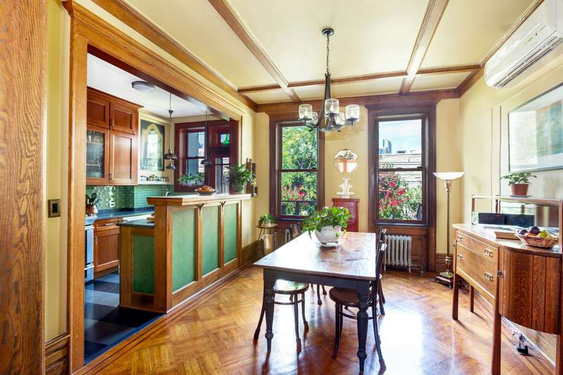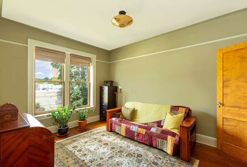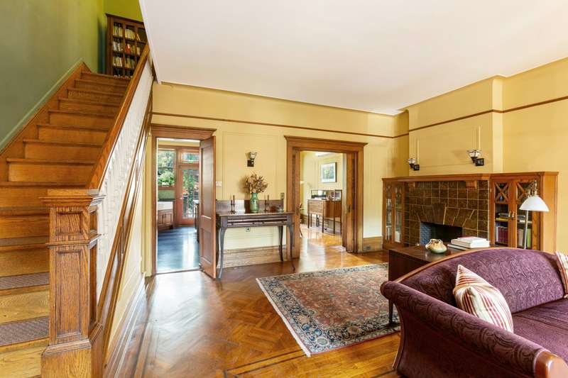 The home's ;parlor vestibule ;welcomes you into the large south-facing ;front ;living room with ;its 11-foot-high ceilings and ;a bay window. There you'll find a handsome mantled decorative fireplace ;with twin arts and crafts glass-fronted ;cabinets on each side. Through this room's ;pocket ;door arch ;is the formal dining room ;with its coffered ceiling. Also on this floor is a split system for ;cooling in summer, with compressor cleverly hidden beneath the Trex and Ipe wood rear deck, ;accessed directly through the rear kitchen door. ;