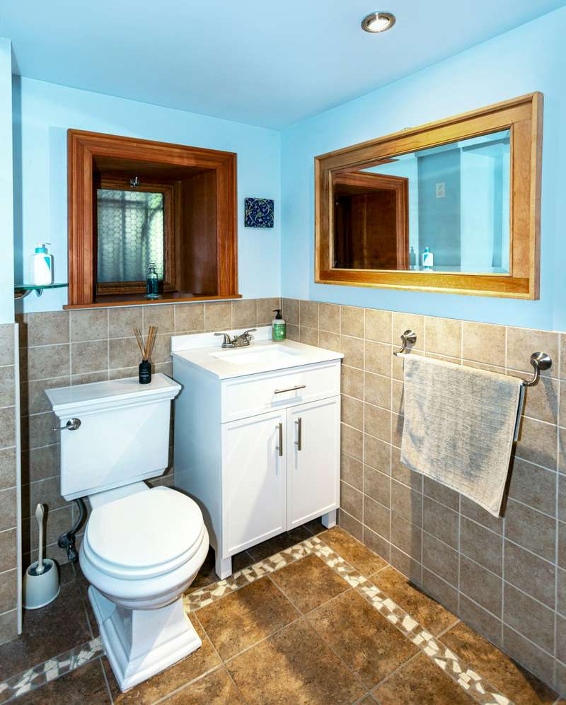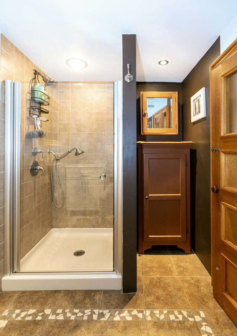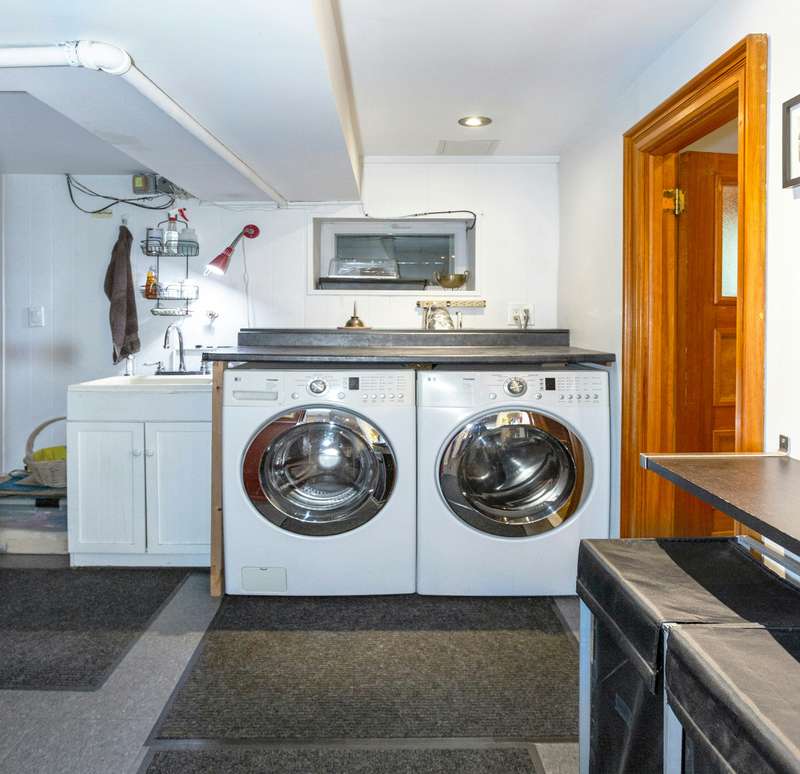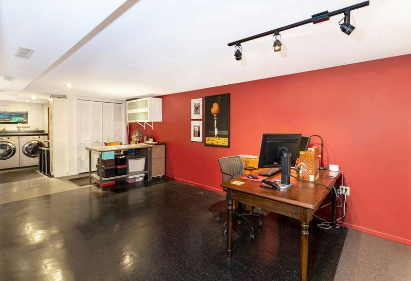 The finished basement level functions as ;a multi-use room, with ;a ;washer and ;dryer; a ;full second tiled bathroom with shower; a ;work area ;and slop sink; a closet and room for ;storage; ;multiple cupboards; ;and a separate ;entrance ;under ;the ;front stoop entrance. ;A door at the ;rear of the basement provides access to the rear garden. ;