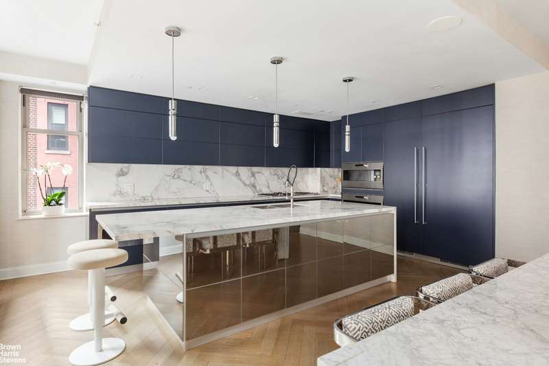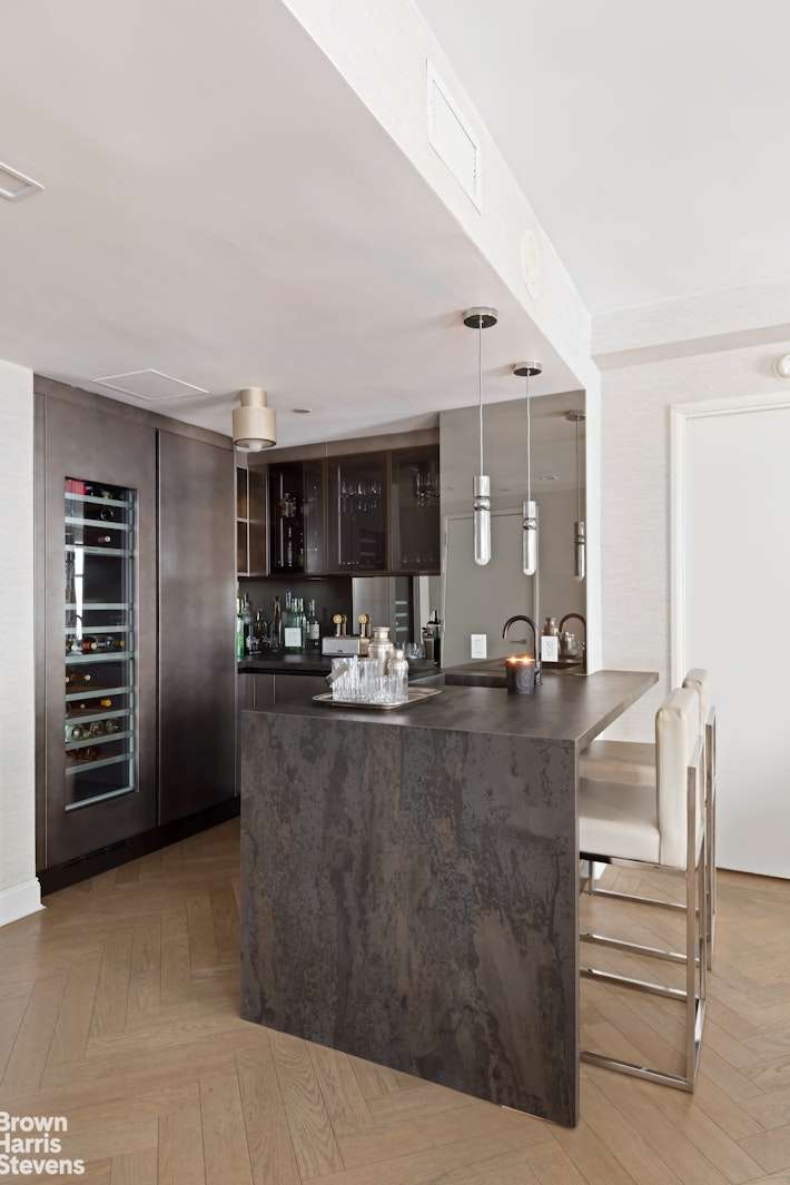 Transitioning to the open chef's kitchen, it's a gastronomic paradise, boasting oak cabinetry, sleek marble countertops and backsplash, and high-end appliances to elevate every meal. Mixologists will appreciate the wet bar on the other end of the layout, complete  with an additional fridge and separate wine fridge, icemaker, sink, and dishwasher. Designed for privacy and versatility, the apartment offers three generously sized bedrooms, complete with their own renovated spa-like ensuite bathrooms and fully outfitted  closets.