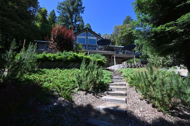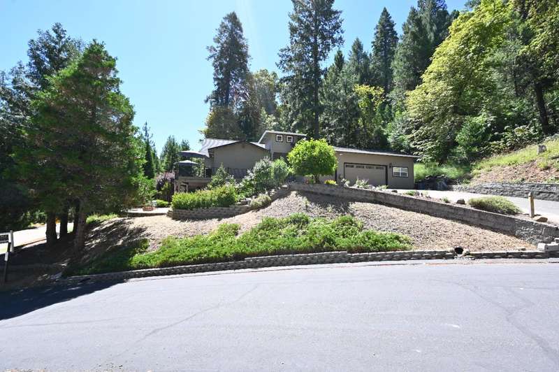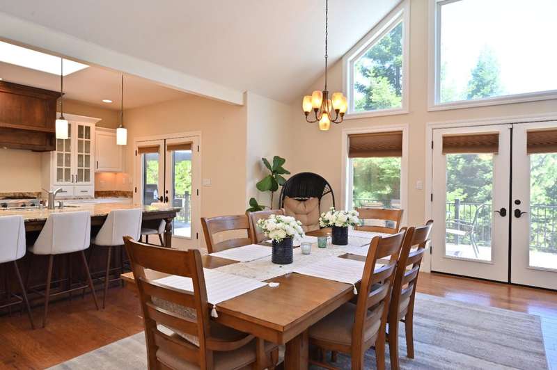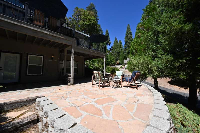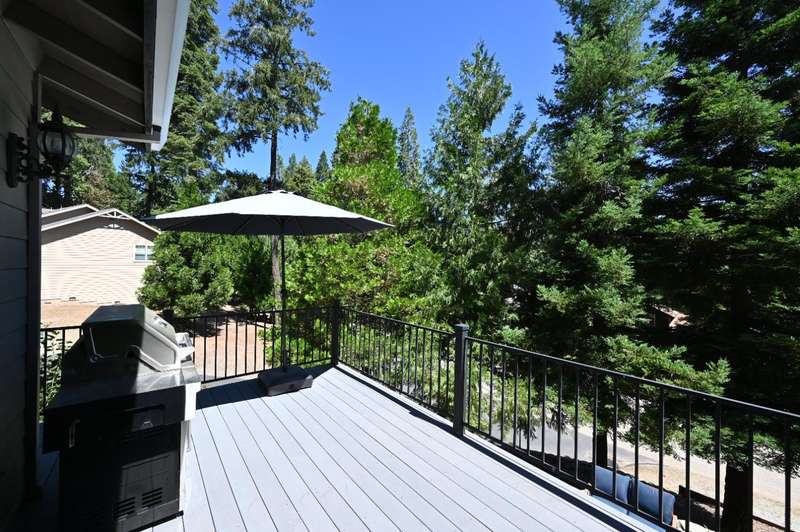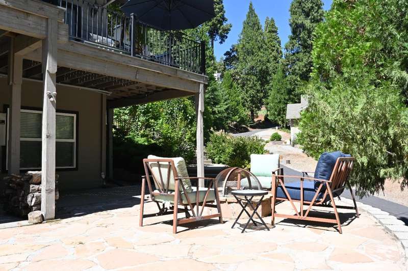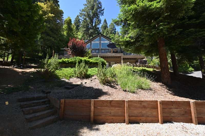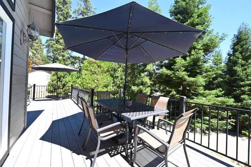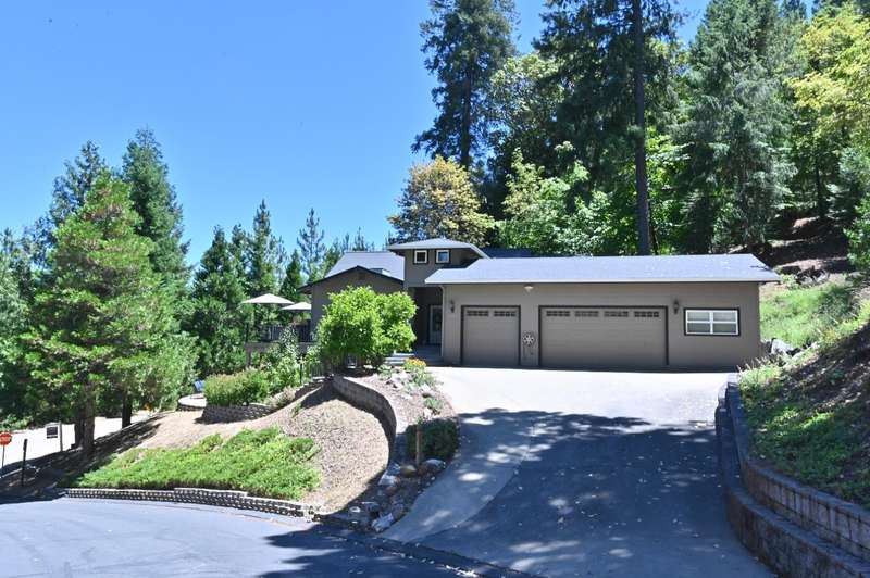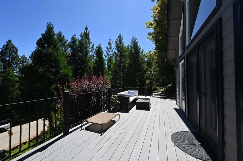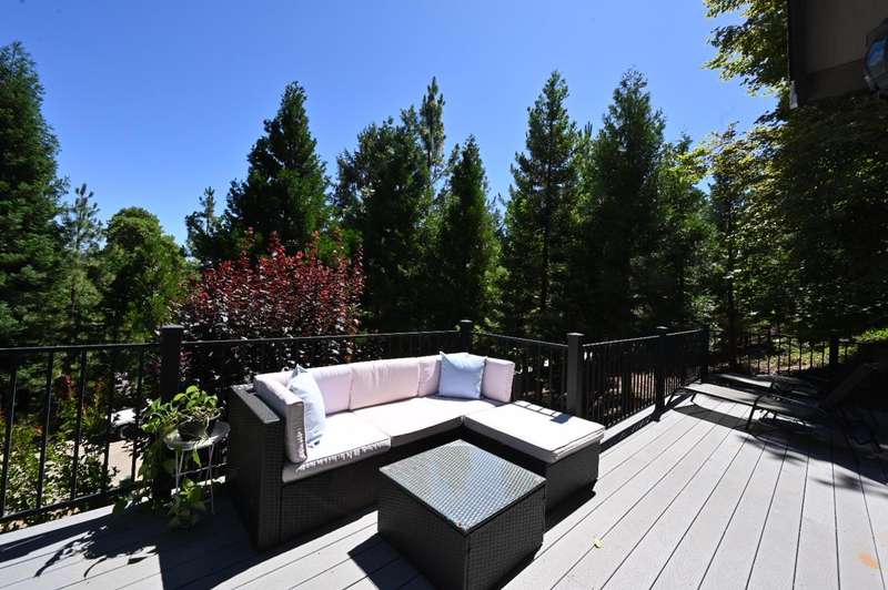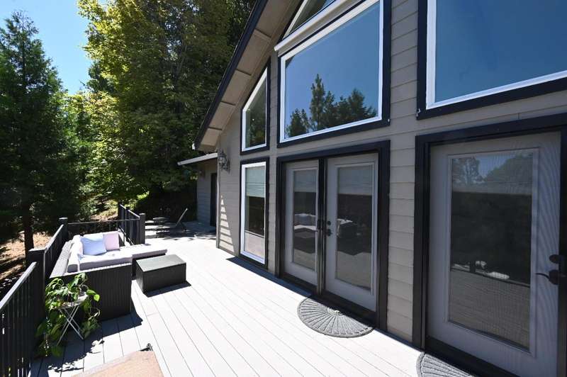 This stunning mountain retreat located is in the beautiful pines in Mace Meadows and offers tranquil views, classy upgrades, and flexible living spaces designed for comfort and style. Expansive floor-to-ceiling windows and double French doors lead to a Trex deck, flooding the home with natural light and seamlessly blending indoor and outdoor living. The versatile layout includes three bedrooms and three full baths, with a spacious lower level featuring a private bedroom and bath, a family/game room, a bar ideal for entertaining, and a gym area. The beautifully updated kitchen has freshly painted cabinets and newer appliances including a microwave, refrigerator, dishwasher, and disposal. Upstairs areas are freshly painted, adding to the home's modern appeal. The luxurious primary suite includes a spa-inspired walk-in shower, bathtub overlooking peaceful views, updated faucets, sinks and showerheads, and a large walk-in closet. Smart home features include an 18kW auto-start Generac generator, Ring cameras, a Nest thermostat and a tankless water heater. Oversized three-car garage, backyard shed and abundant storage. Located minutes from Tiger Creek, Kirkwood, Bear River, South Lake Tahoe, Fairplay/Shenandoah Valley Wine Country. Roof clearance done and uploaded.