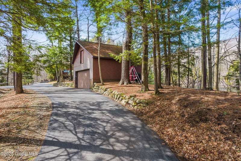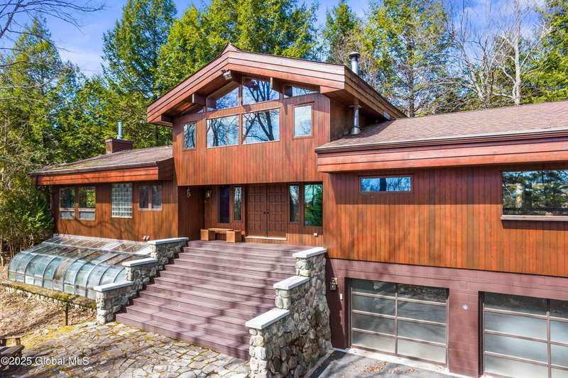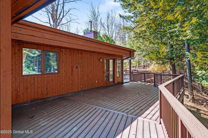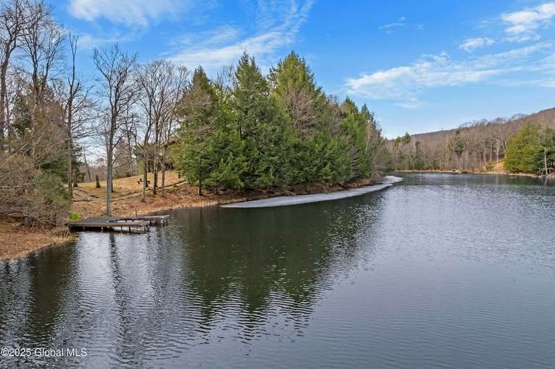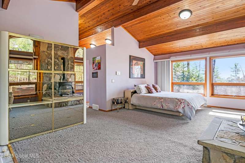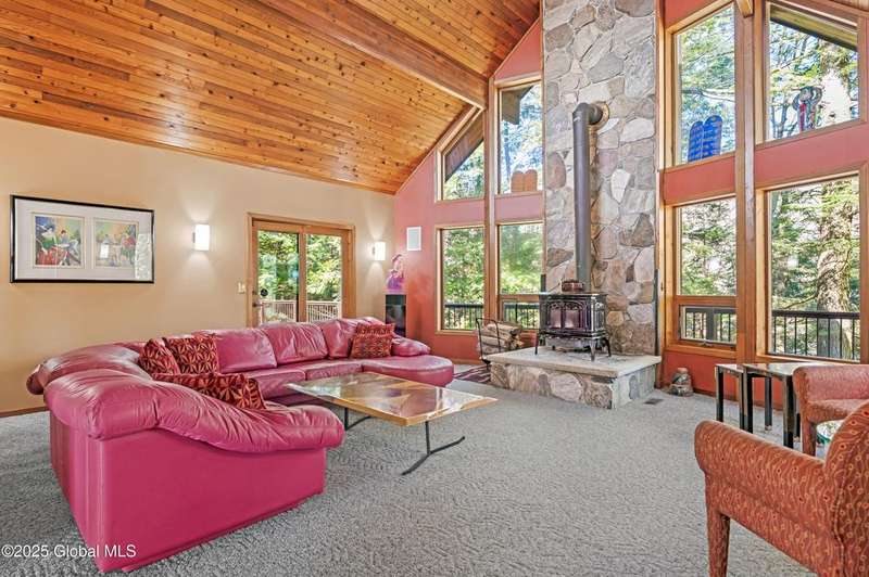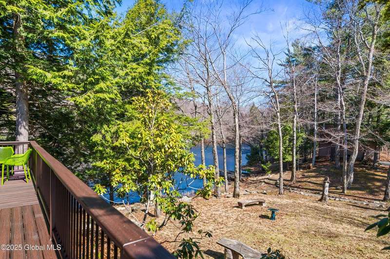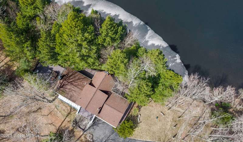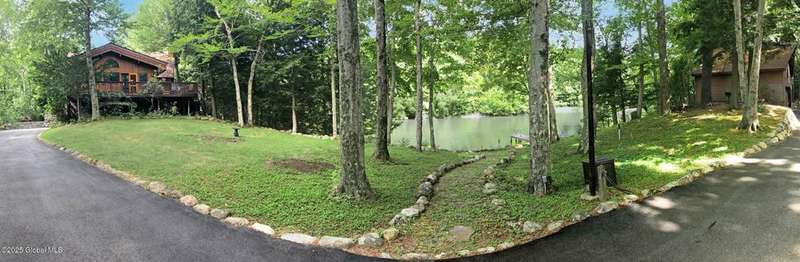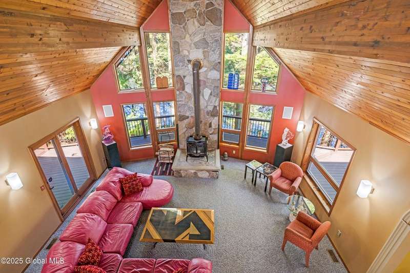 Escape to your private utopia in the heart of nature on 17.86 acres! This stunning 4-bedroom, 3-full bathroom retreat offers 4,361 square feet of living space across 3 levels. Panoramic lake views from almost every corner of this magnificent home! Step into a serene sanctuary with tongue-and-groove cedar ceilings, exposed wood beams, and arched doorways. Bask in natural light from copious windows, cathedral ceilings, and floor-to-ceiling stone surrounds. The kitchen features quartz counters, a walk-in pantry with built-in California Closet shelving and drawers, and an atrium glass door that leads out to the new wrap-around Trex deck. 2-car garage and an additional detached 2-car garage with storage above. This breathtaking property, boasting ? mile of shorefront, offers unparalleled relaxation and significant Airbnb potential. It is enveloped by lush greenery and scenic hiking trails. Unwind by Evans Lake, where nature's tranquility seamlessly blends with luxurious living.