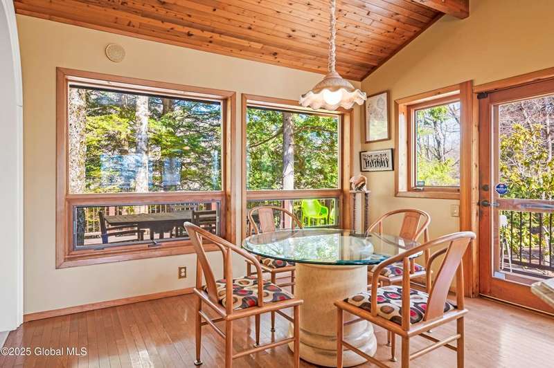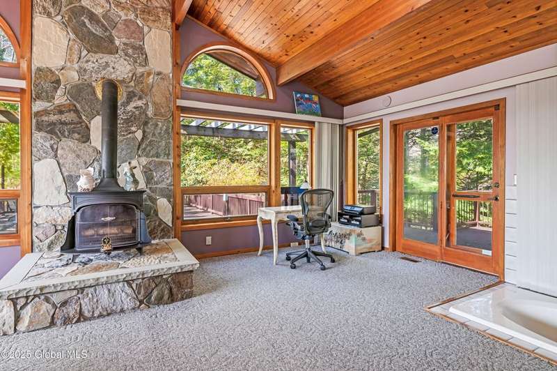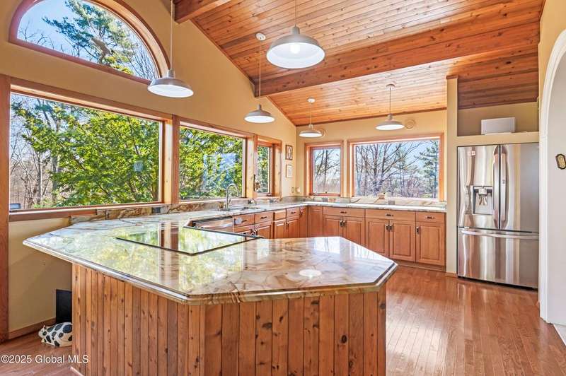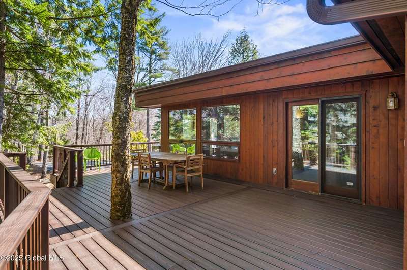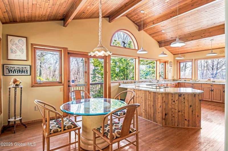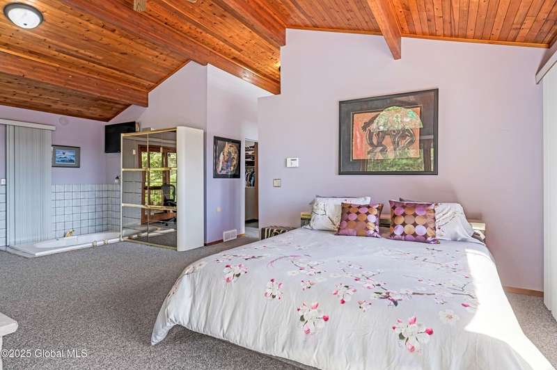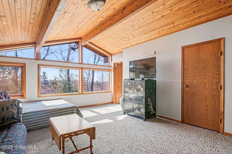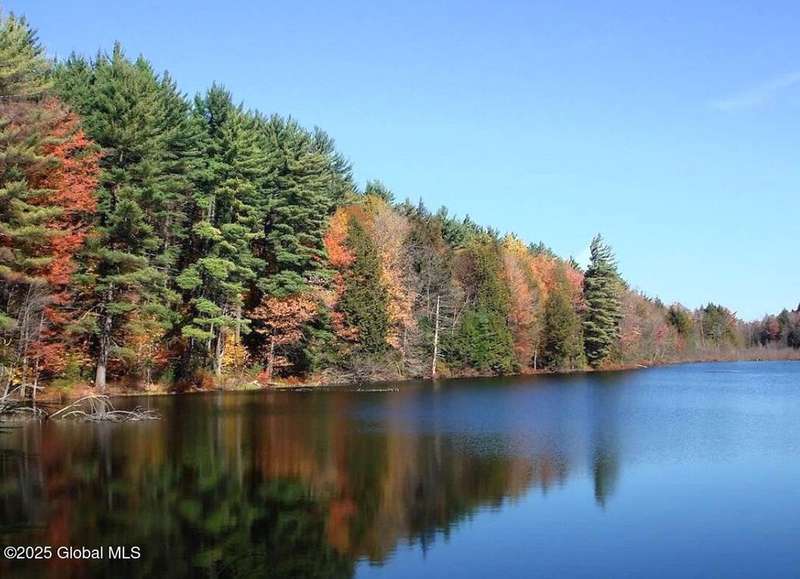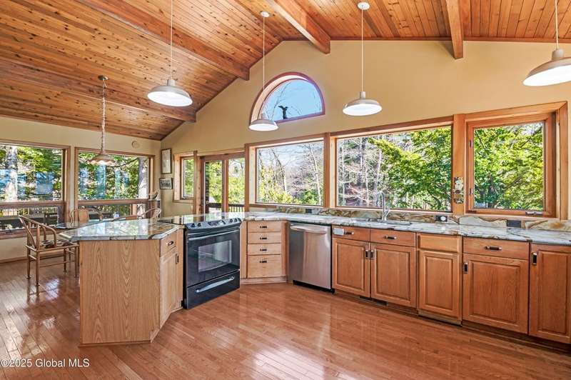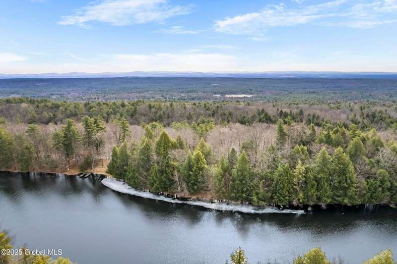 Escape to your private utopia in the heart of nature on 17.86 acres! This stunning 4-bedroom, 3-full bathroom retreat offers 4,361 square feet of living space across 3 levels. Panoramic lake views from almost every corner of this magnificent home! Step into a serene sanctuary with tongue-and-groove cedar ceilings, exposed wood beams, and arched doorways. Bask in natural light from copious windows, cathedral ceilings, and floor-to-ceiling stone surrounds. The kitchen features quartz counters, a walk-in pantry with built-in California Closet shelving and drawers, and an atrium glass door that leads out to the new wrap-around Trex deck. 2-car garage and an additional detached 2-car garage with storage above. This breathtaking property, boasting ? mile of shorefront, offers unparalleled relaxation and significant Airbnb potential. It is enveloped by lush greenery and scenic hiking trails. Unwind by Evans Lake, where nature's tranquility seamlessly blends with luxurious living.