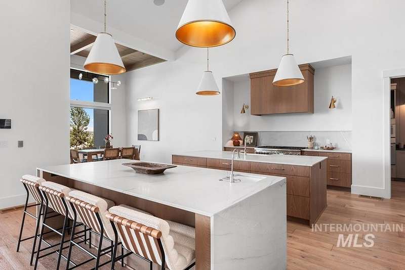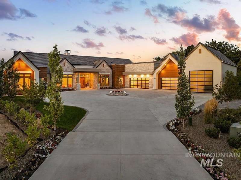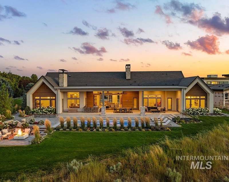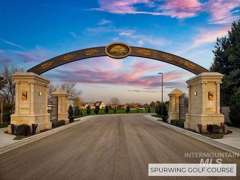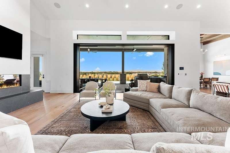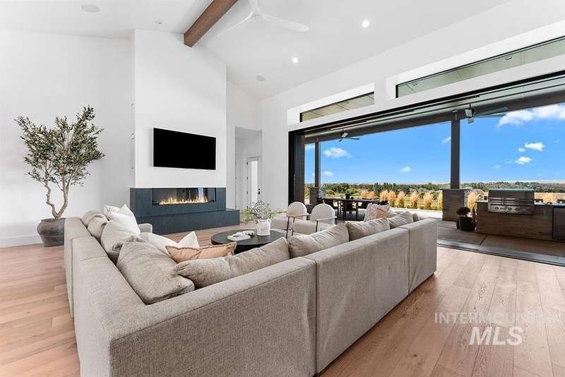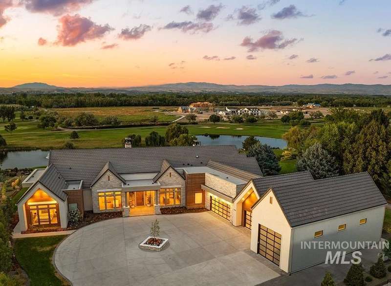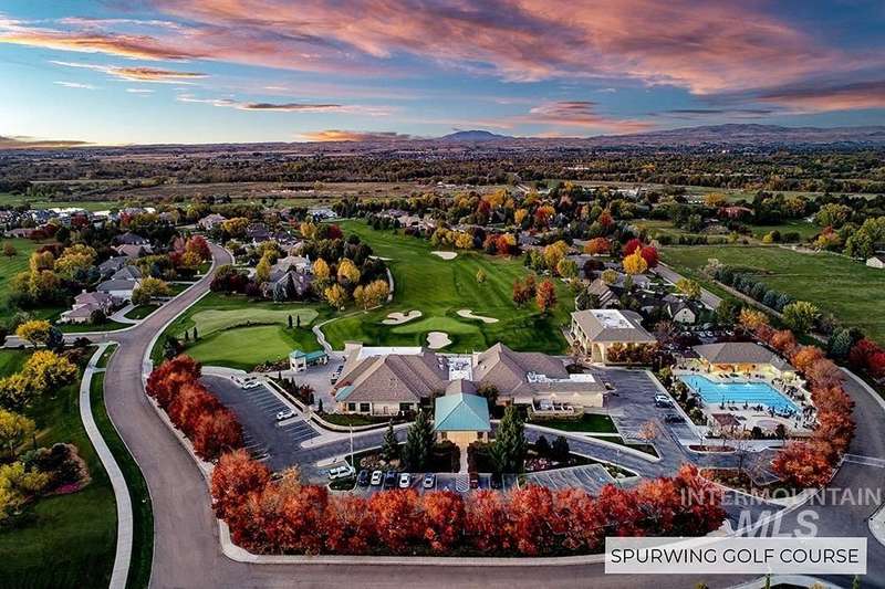 An irreplaceable single-level estate perched on nearly an acre—one of the most premier view lots in all of the Treasure Valley. Overlooking SpurWing’s Championship Golf Course with panoramic fairway and mountain views, this 2023 masterpiece blends luxury and function with soaring 16' ceilings, white oak beams, hardwood floors, and Powered-retractable doors that disappear into the wall for a true resort-style outdoor experience. The designer kitchen boasts dual waterfall islands, Thermador appliances, and a full prep kitchen. Designed for multigenerational living with nearly 6,000 SF, including multiple en-suites, a private casita with separate entrance, executive office, and bonus room. The over 2,680 SF of climate controlled garage (50'x20') is ideal for collectors or RVs. Entertain with ease—covered patio with built-in Infratech heaters, built-in BBQ, fire pit, 42x18 custom pool, and access to SpurWing’s clubhouse, dining, pool, and tennis courts.