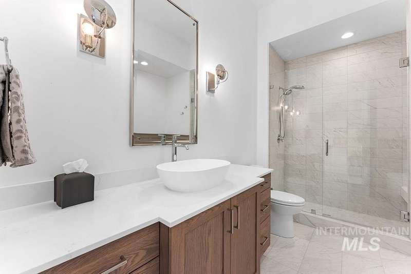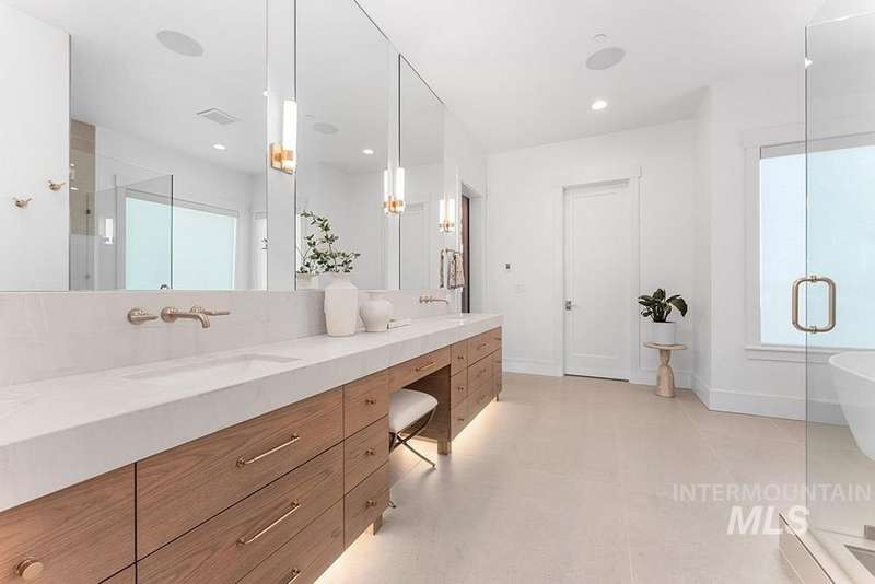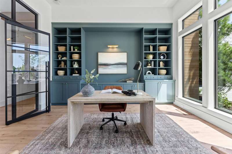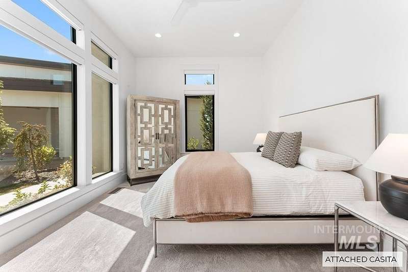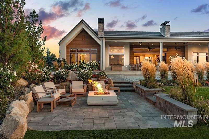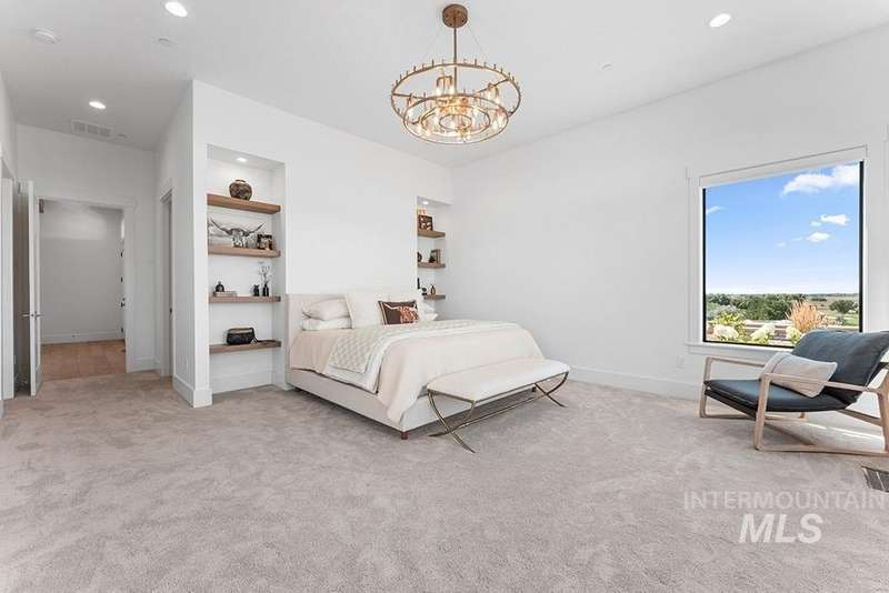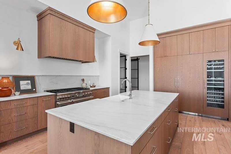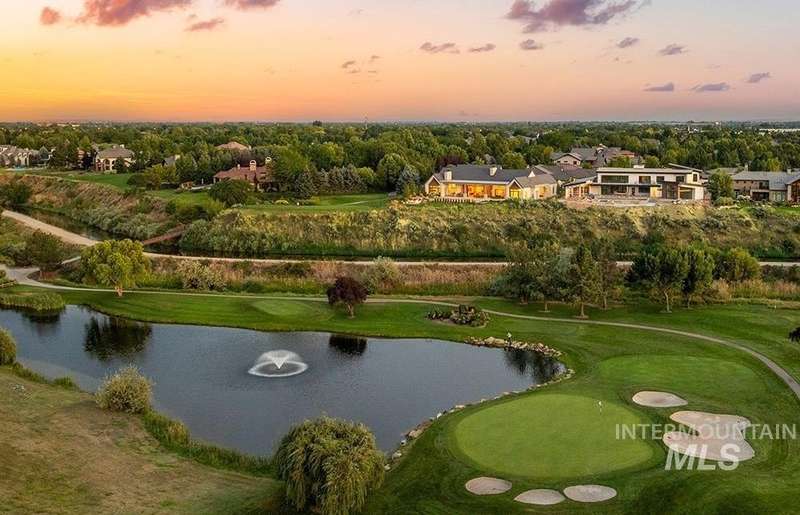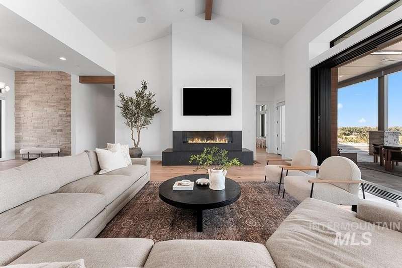 An irreplaceable single-level estate perched on nearly an acre—one of the most premier view lots in all of the Treasure Valley. Overlooking SpurWing’s Championship Golf Course with panoramic fairway and mountain views, this 2023 masterpiece blends luxury and function with soaring 16' ceilings, white oak beams, hardwood floors, and Powered-retractable doors that disappear into the wall for a true resort-style outdoor experience. The designer kitchen boasts dual waterfall islands, Thermador appliances, and a full prep kitchen. Designed for multigenerational living with nearly 6,000 SF, including multiple en-suites, a private casita with separate entrance, executive office, and bonus room. The over 2,680 SF of climate controlled garage (50'x20') is ideal for collectors or RVs. Entertain with ease—covered patio with built-in Infratech heaters, built-in BBQ, fire pit, 42x18 custom pool, and access to SpurWing’s clubhouse, dining, pool, and tennis courts.