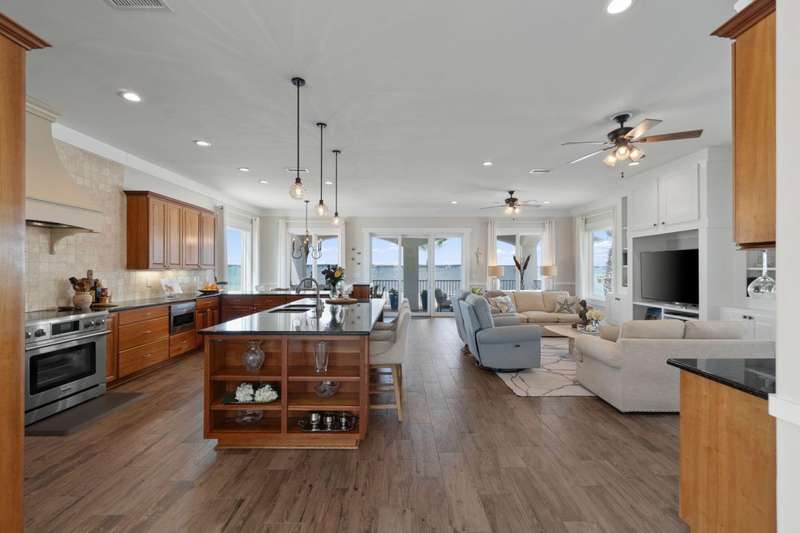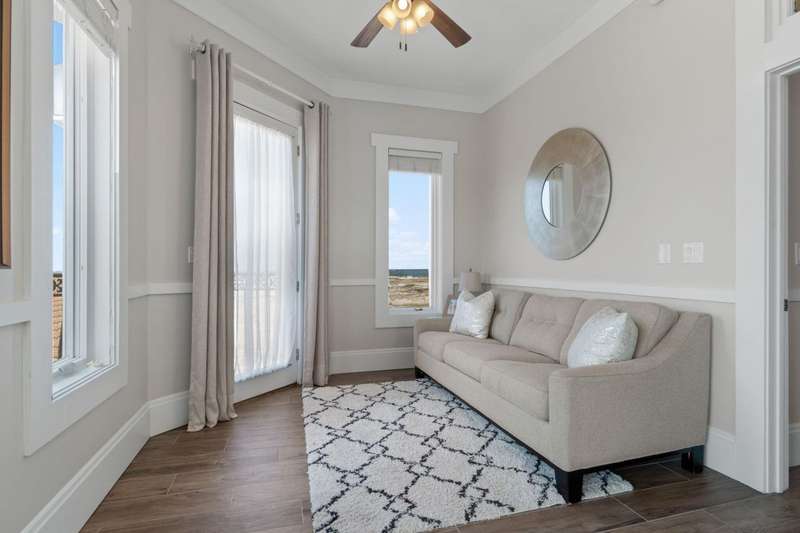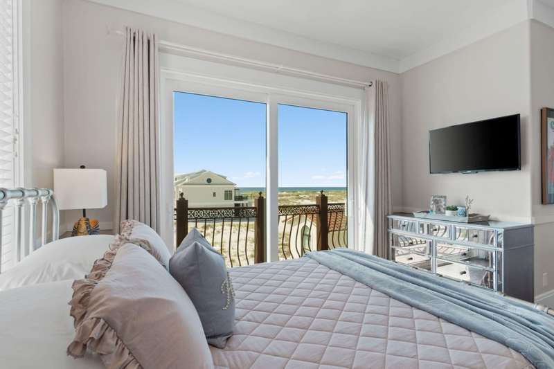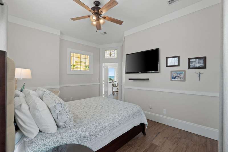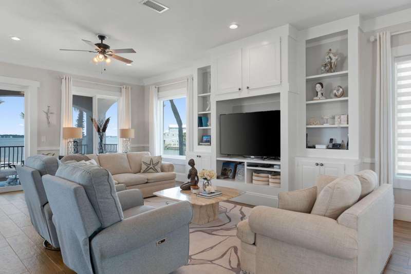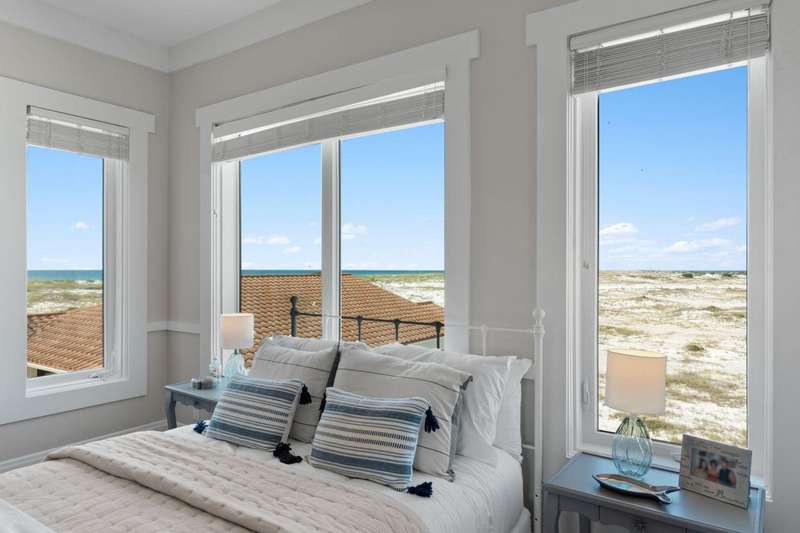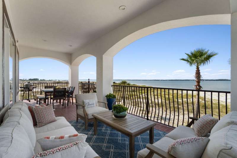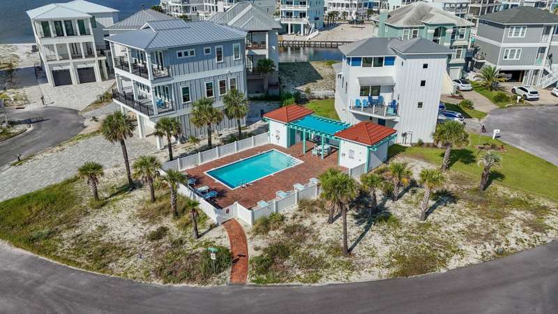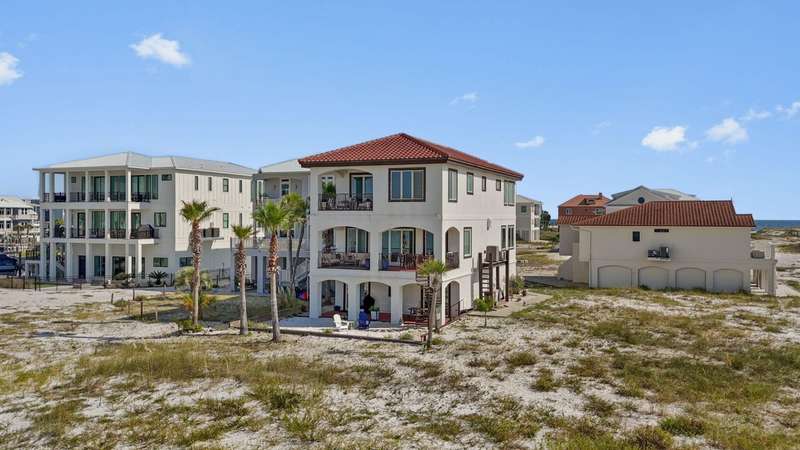 Exquisite Waterfront Residence in Sailmaker Cove. Step into a world of luxury and tranquility with this stunning waterfront home, nestled within the prestigious, gated community of Sailmaker Cove. This custom-built residence seamlessly blends timeless coastal design with elevated Mediterranean elegance, surrounded by the serene landscape of Gulf Islands National Seashore.Upon arrival, the property makes an immediate impression with its elegant white stucco exterior and Spanish cement tile roof, complemented by a beautifully designed wrought iron balcony offering captivating views of the Gulf and it's pristine sugary beaches. Spanning over 3,794 square feet, this meticulously curated 4-bedroom, 5-bathroom home is designed to elevate your lifestyle and spirit. The first floor features an open-concept layout, perfect for gatherings, that effortlessly integrates into a chef's dream kitchen, adorned with high-end, custom solid wood cabinetry and stone countertops. Imagine dining while savoring breathtaking sunsets from the comfort of your home.Additional highlights of the first floor include a spacious bedroom suite with a luxurious bath. Tiles and hard wood flooring and a host of subtle custom finishes thoughtfully designed throughout the home such as imported sinks, a stunning cement wall for showcasing your favorite wines, and exquisite 19th-century European stained glass above bedroom doors and throughout selected walls really showcase this spectacular home. The spacious primary suite on the second floor serves as a true retreat, boasting a cozy sitting area, custom built-ins, and a private balcony with breathtaking views of the Gulf. Two additional guest bedrooms, each with en-suite baths and picturesque views of the sound and national park, provide ample space for family or guests.The garage is equally impressive, with high ceilings and generous storage space, including an area designed for a golf cart.The rear exterior of the home is perhaps its most enchanting feature, inviting you to relax or entertain at any time of day while being embraced by nature. Whether you prefer watching dolphins swim or enjoying a peaceful read, this unique setting promises to be a spectacular experience.Conveniently located just across from a tranquil, less-crowded beach. Take a short, scenic ride through the park to the vibrant Pensacola Beach for an array of dining and entertainment options. Sailmaker Cove provides a serene gated community experience, bordered by natural beauty, including the stunning Santa Rosa Sound.Residents also have access to the refreshing community pool, making this property an ideal choice for a primary residence, vacation home, or a lucrative short-term rental opportunity. This home is truly a rare gem that will not disappoint!