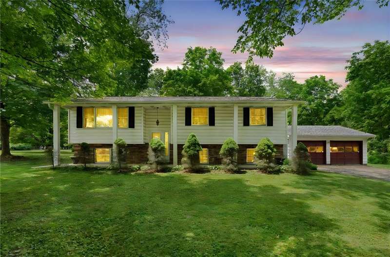 First time ever on the market! This custom-built, 5-bedroom, 2-bath split-level home with a charming Colonial facade sits on a picturesque one-acre lot in the heart of Big Flats. Nestled in a park-like setting, the property offers privacy, space, and convenience. The main level features an open-concept living and dining area filled with natural light from large windows and opens onto a second-story deck?perfect for entertaining or enjoying peaceful sunsets. Down the hall, you'll find three well-sized bedrooms. The lower level adds flexibility with two more bedrooms featuring proper egress, plus a spacious family room ideal for gathering or relaxing. A large two-car garage provides ample space for parking, storage, or a workshop.Located between Corning and Elmira, Big Flats offers the perfect balance of small-town charm and regional access. Commuters and travelers alike will appreciate proximity to I-86, which connects easily to New York City, Toronto, and Pittsburgh. The Elmira Corning Regional Airport, just minutes away, offers direct flights to Detroit and Orlando, with convenient connections to Syracuse, Buffalo, and beyond. Outdoors, enjoy nearby access to the Chemung River for kayaking and canoeing, or explore miles of scenic trails at Tanglewood Nature Center, Harris Hill, and several New York State parks. Whether you're soaking up the morning light through the front windows or watching the sun set from the upper deck, this well-loved home is ready to welcome its next chapter.