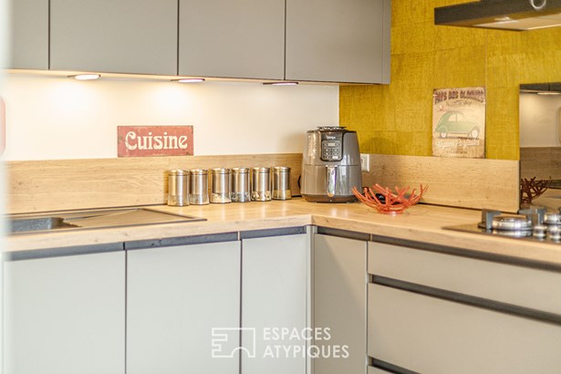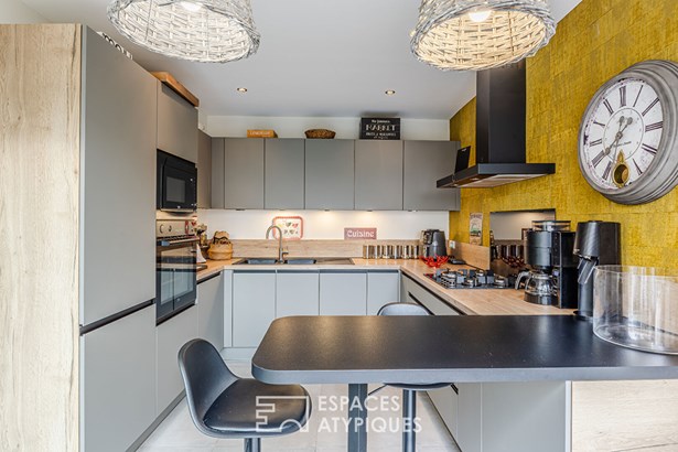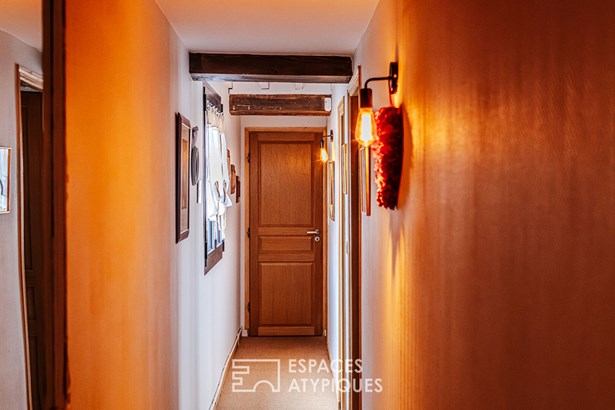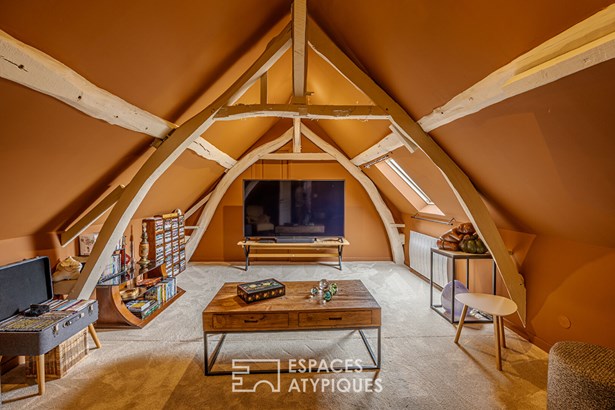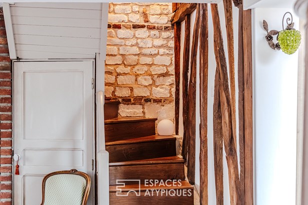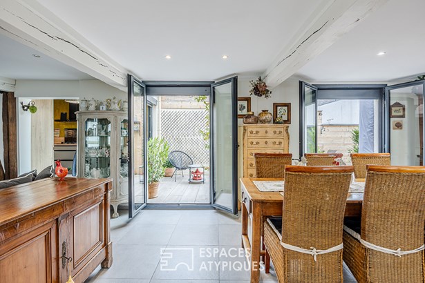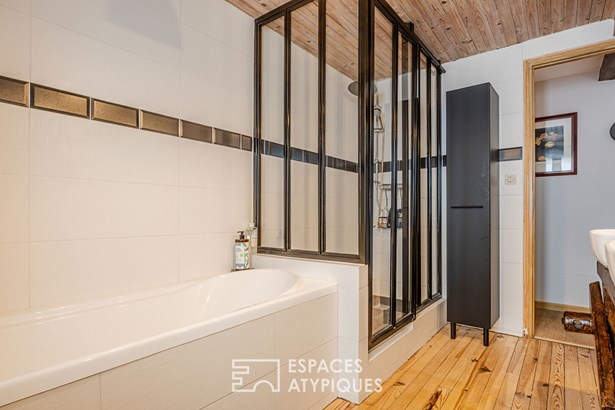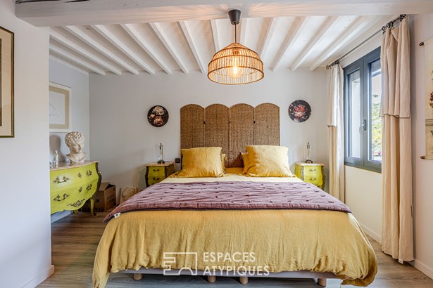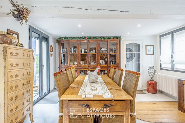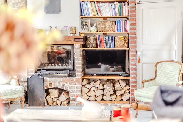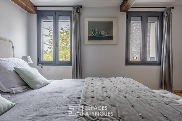 Combining old and new, you will immediately be seduced by the white beams of the living room, the stone fireplace in the living room, the wooden staircase and also by this beautiful fitted kitchen, the anthracite frames and the pleasant terrace to enjoy summer evenings with friends. Upstairs, the sleeping area. Through the hallway, we discover two very beautiful bedrooms, a bathroom with bathtub and walk-in shower and a laundry room.