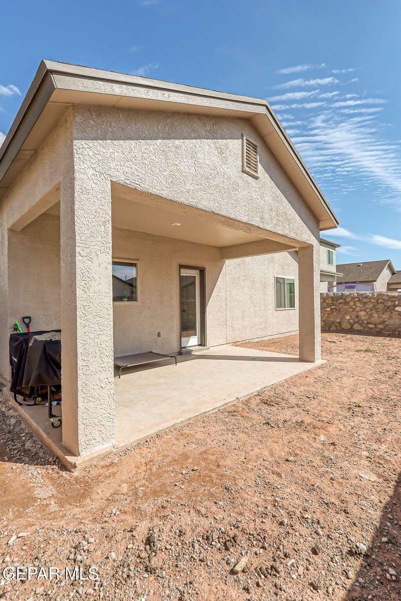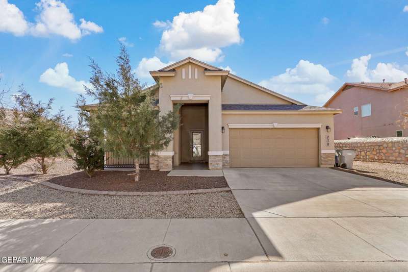 Beautiful single-story home featuring an open-concept design with high ceilings and spacious living areas. The large family/living room flows seamlessly into the kitchen and dining areas-perfect for entertaining. The kitchen offers a center island, granite countertops, stylish tile backsplash, stainless steel appliances, pantry, and cabinets with crown molding. This home includes four inviting bedrooms and two full baths. The primary suite boasts a generous walk-in closet and a luxurious bathroom. Leased solar panels help keep electric costs low year-round. Located in the desirable Campo Del Sol community, residents enjoy resort-style amenities including a lazy river, pool, parks, and scenic walking trails. With a low annual HOA and convenient proximity to schools, shopping, and Fort Bliss, this home combines comfort, value, and lifestyle in one exceptional package.