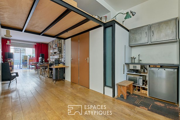 On the border of the Marais and the 11th arrondissement, this shop has been transformed into a workshop with a unique character, mixing industrial spirit and warmth of raw materials. Accessible directly from the street, the space of 52.69 m2 (Carrez) seduces from the entrance by a shop window with a gable on street, a high ceiling, and a creative atmosphere.