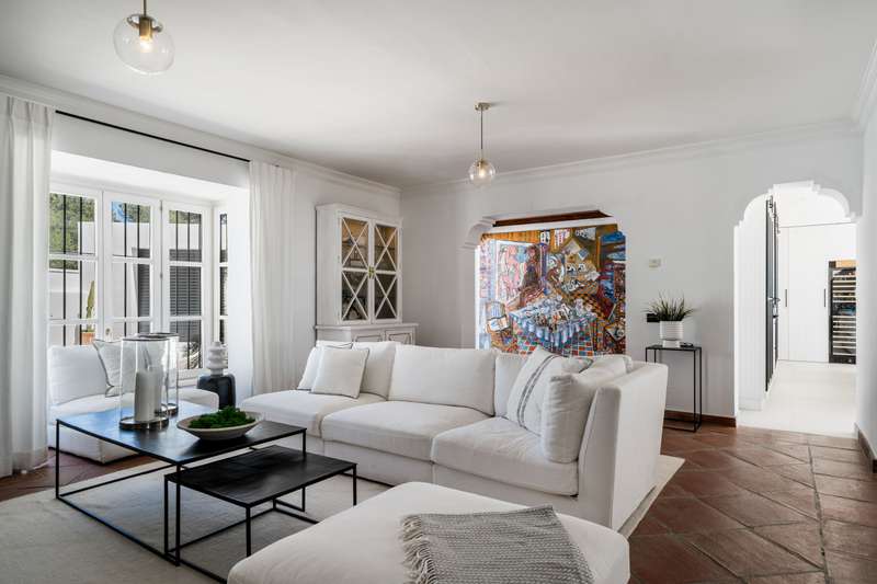 Atop the charming Andalusian village of Benahavís, surrounded by the Sierra de las Nieves and lush greenery, lies Madroñal. In this exclusive gated community, a splendid villa inspired by traditional Spanish cortijos stands nestled amidst a forest of pine and cork trees. With brilliant white lime-clad walls and redtiled roofs, this retreat offers stunning sea views and a serene connection with nature, all just 20 minutes from Marbella. Spread across a single floor of 255 m², the villa blends a cosy home atmosphere with expansive windows that seamlessly integrate indoor and outdoor living. The spacious living and dining area flows into a fully fitted kitchen. A spacious terrace extends along the property's rear perimeter, offering a perfect outdoor sanctuary for unforgettable moments. Here, a large pool and infinity jacuzzi invite relaxation while overlooking the Mediterranean. An impressive barbecue area sets the stage for intimate gatherings, and a shaded section ensures comfort even