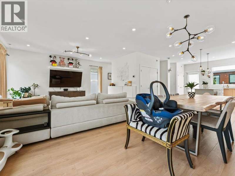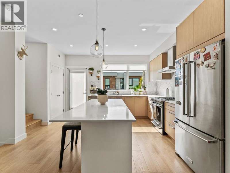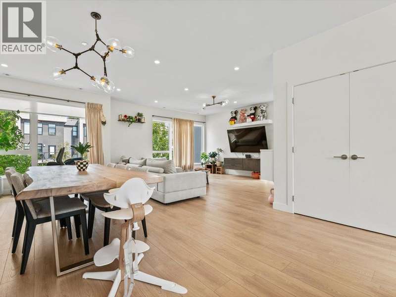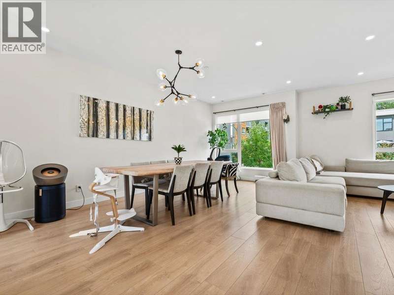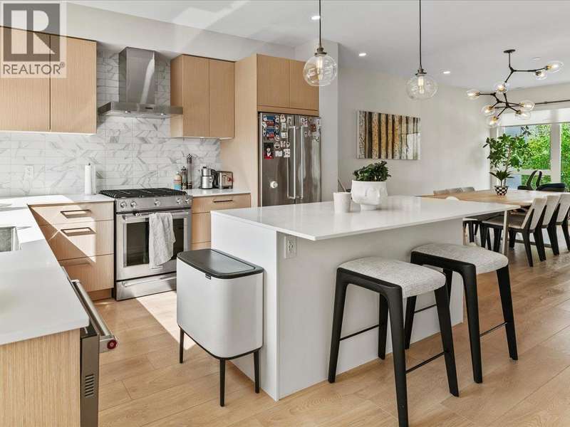 Welcome to Seymour Village, where contemporary design meets West Coast living. This spacious 3-level townhome with AC offers over 2,050 sqft with 4 beds & 4 baths, perfect for families of all sizes. The open-concept main floor features a gourmet kitchen with SS appliances, a generous island, & seamless flow into the dining & living areas-ideal for entertaining. Upstairs, you´ll find 3 bedrooms including a primary suite with a spa-inspired ensuite & walk-in closet. A lower-level bedroom with its own bathroom provides the perfect guest space, home office, or media room. Enjoy a private outdoor patio & deck, as well as an attached double garage with ample storage & EV charging. Nestled in a family-friendly community surrounded by nature, trails, & parkland, yet just minutes to Deep Cove, shopping, schools, golf courses, & easy access to downtown. This home blends comfort, functionality, & lifestyle in one of N Vancouver´s most desirable master-planned communities. (id:58403)